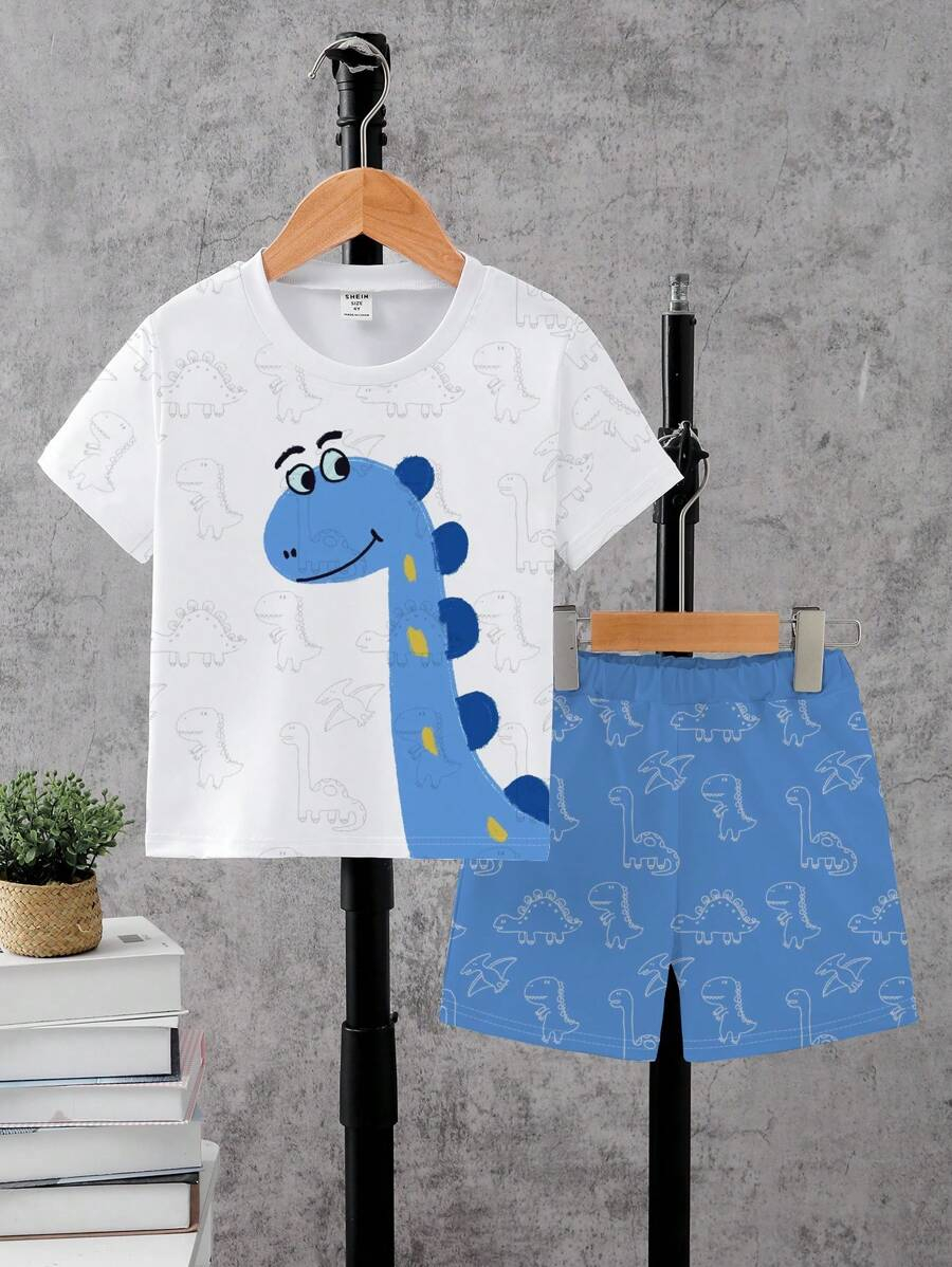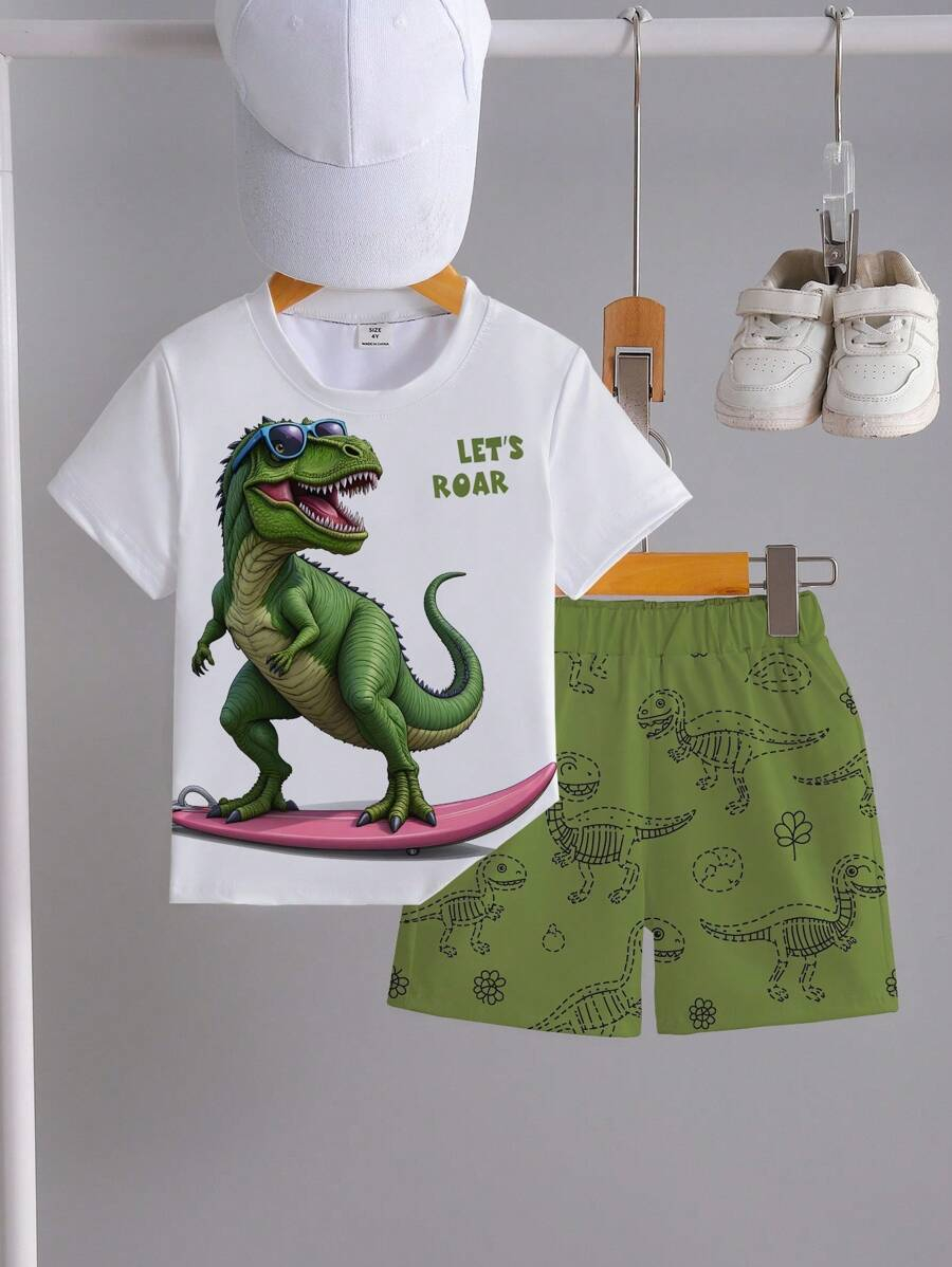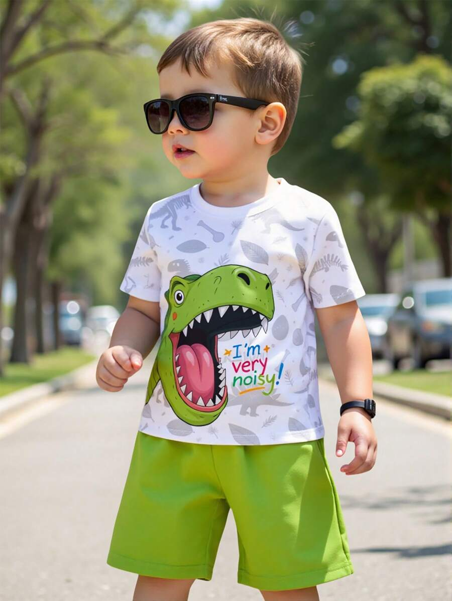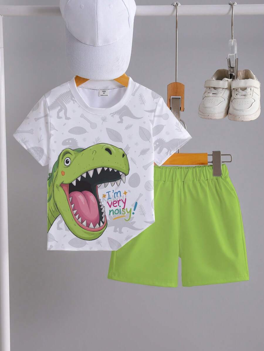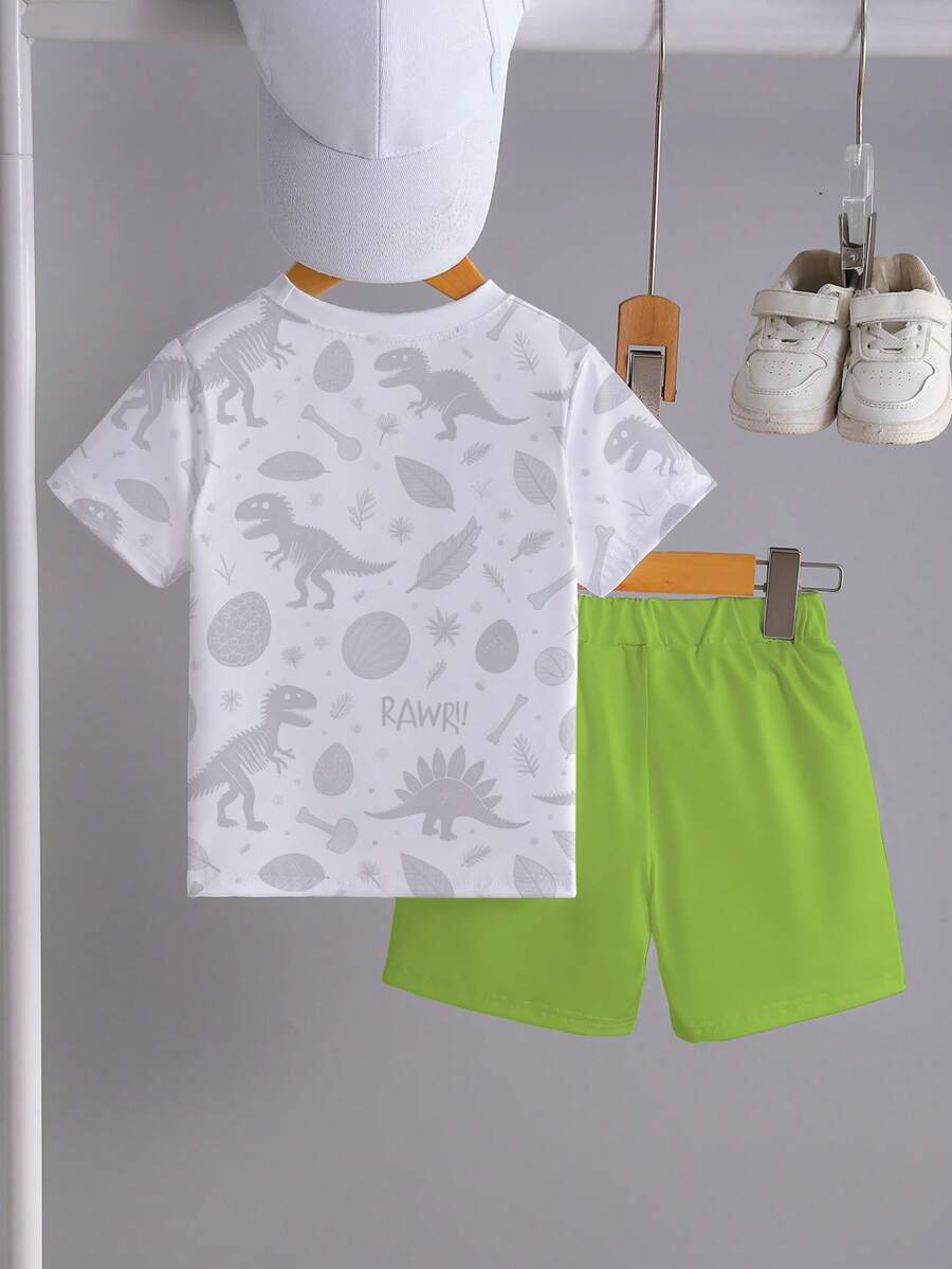 SHEIN 1 Set Toddler Boys Cartoon Dinosaur Print Short Sleeve T-Shirt And Shorts Set, Lightweight For Daily Wear, Suitable For Spring/Summer Dinosaur Clothes For Boys Summer Holiday YB00009
