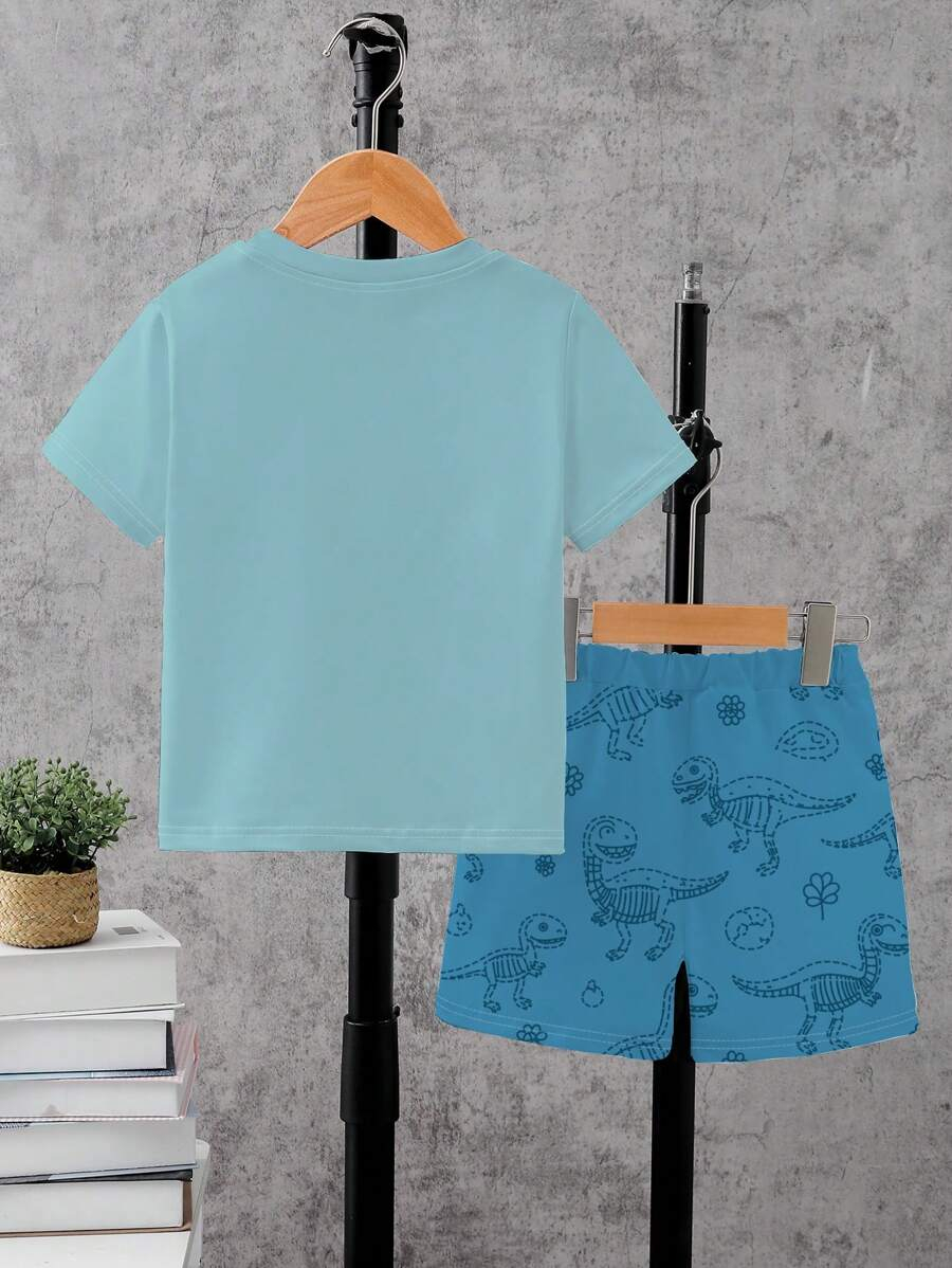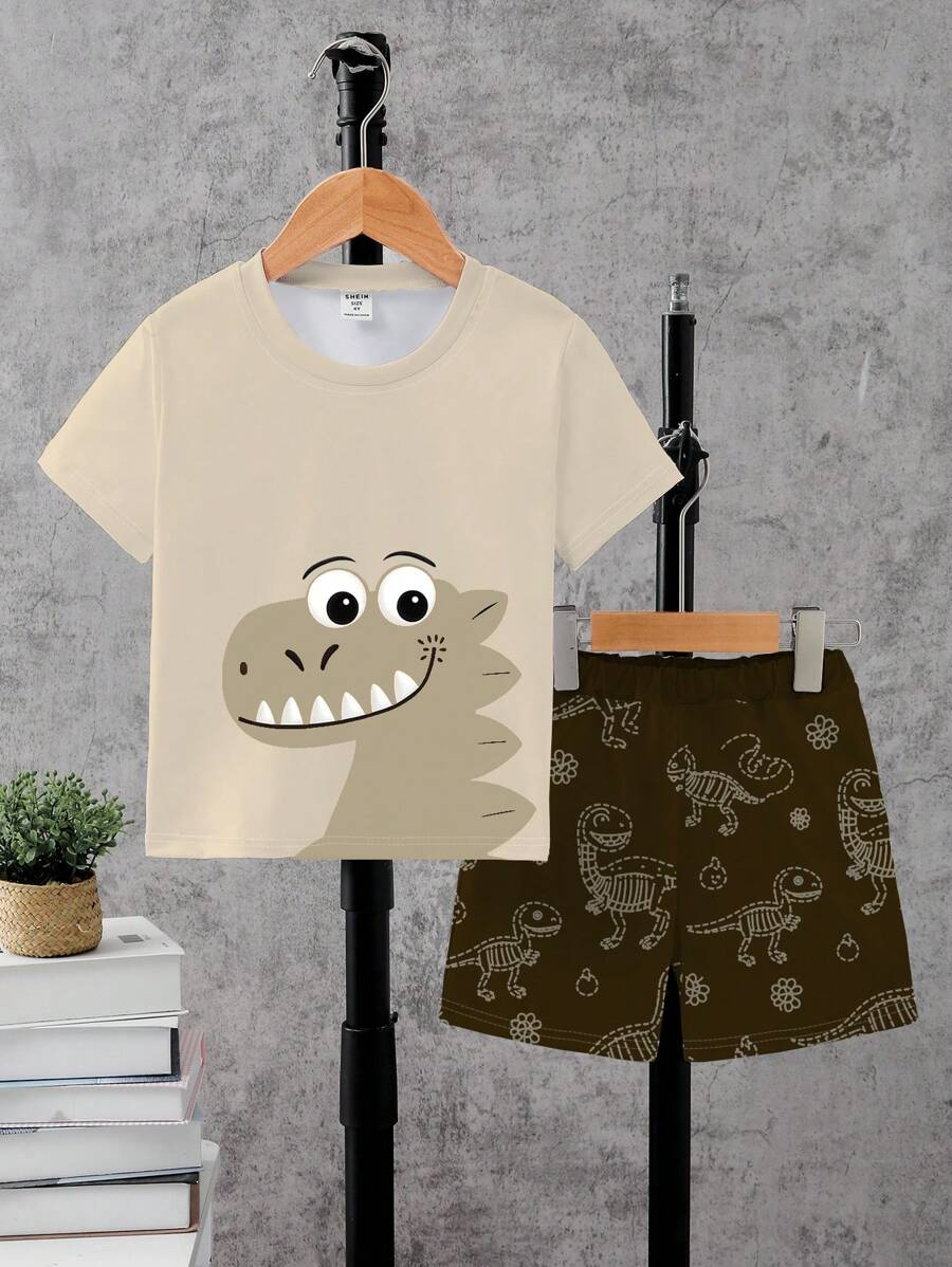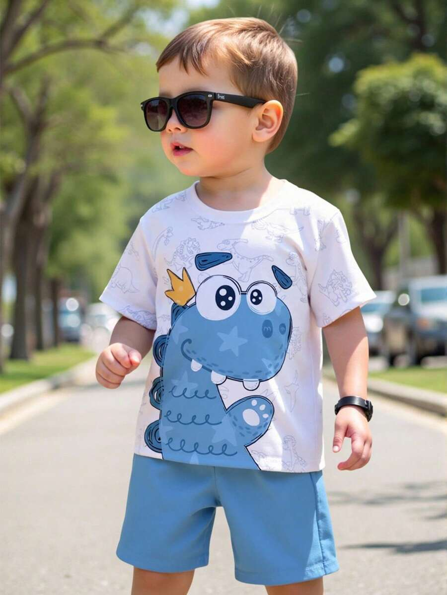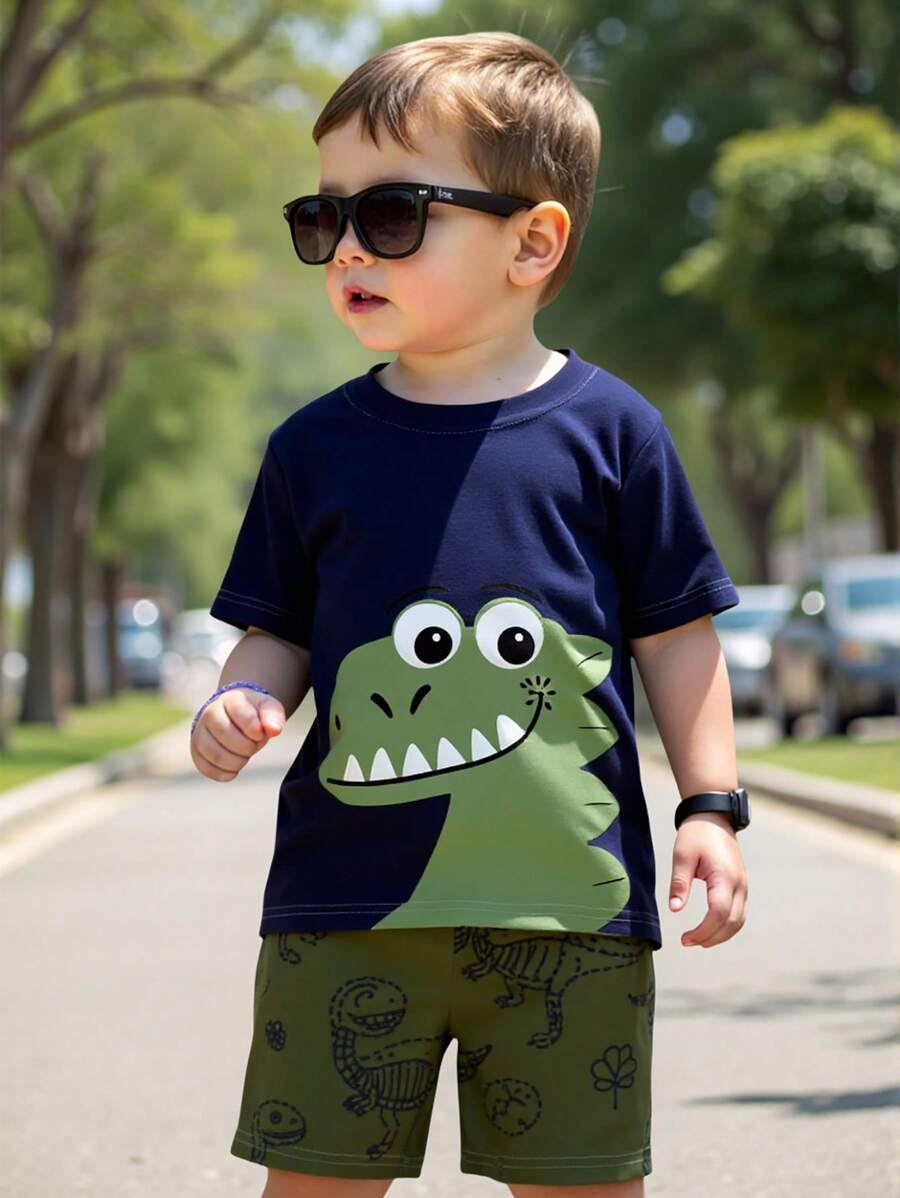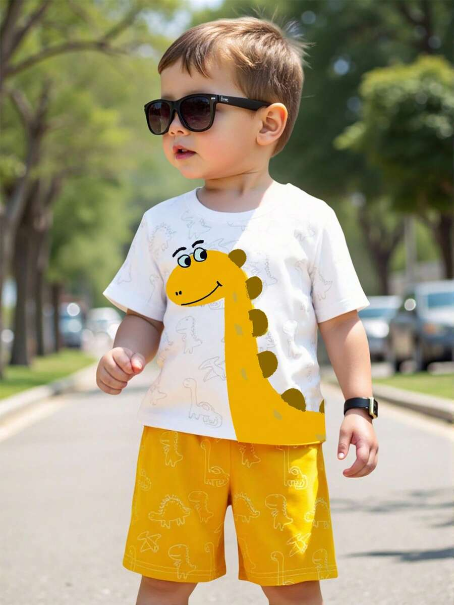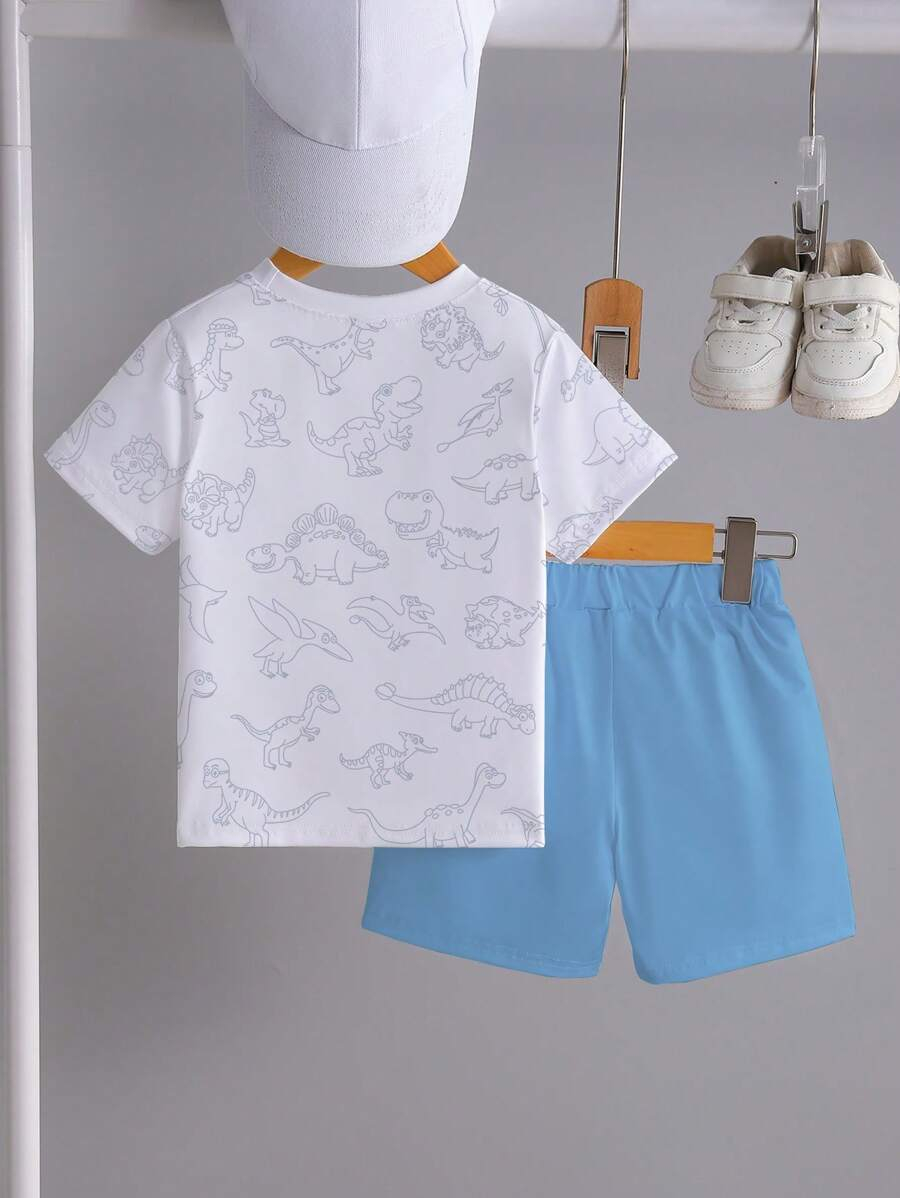 SHEIN 1 Set Toddler Boys Cartoon Dinosaur Print Short Sleeve T-Shirt And Shorts Set, Lightweight For Daily Wear, Suitable For Spring/Summer Dinosaur Clothes For Boys Summer Holiday YB00009