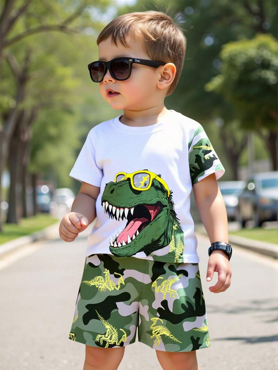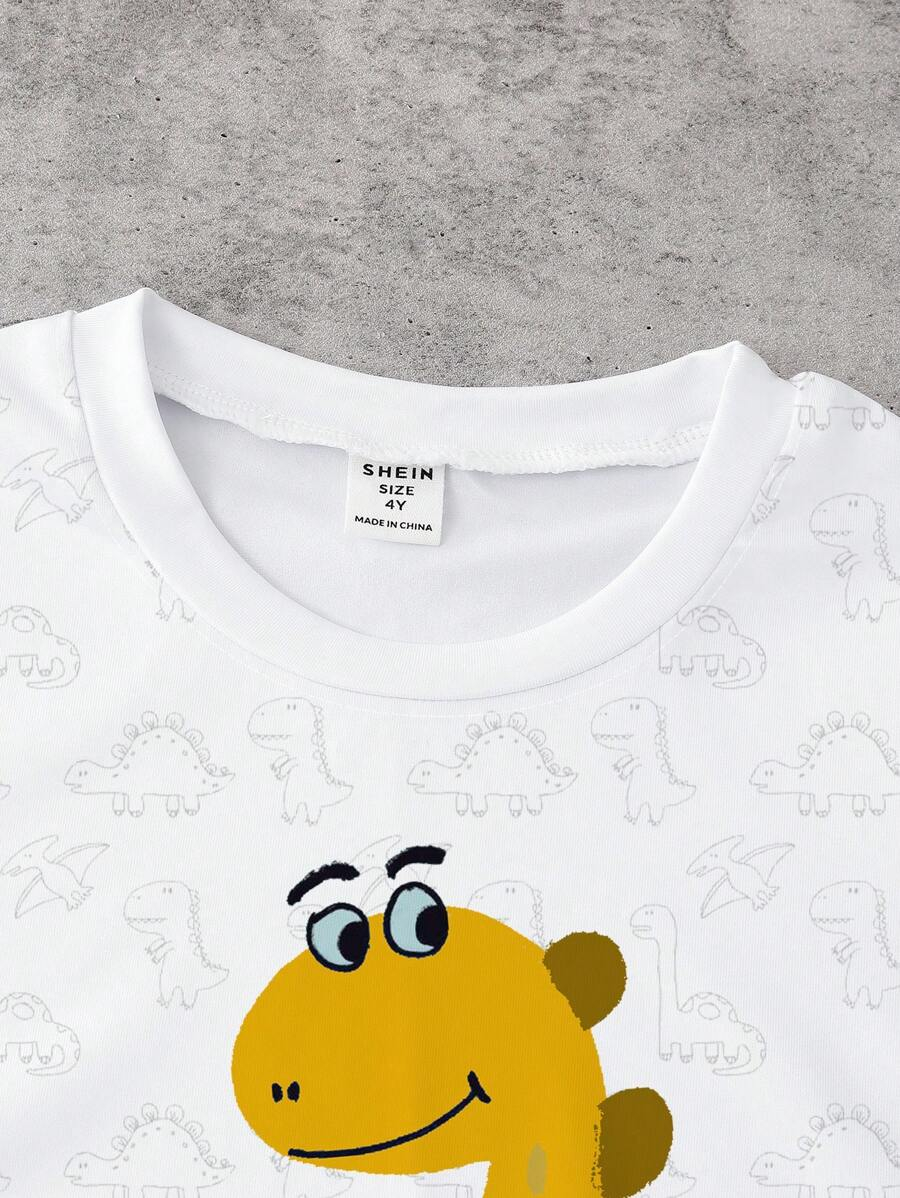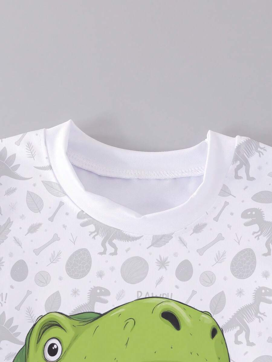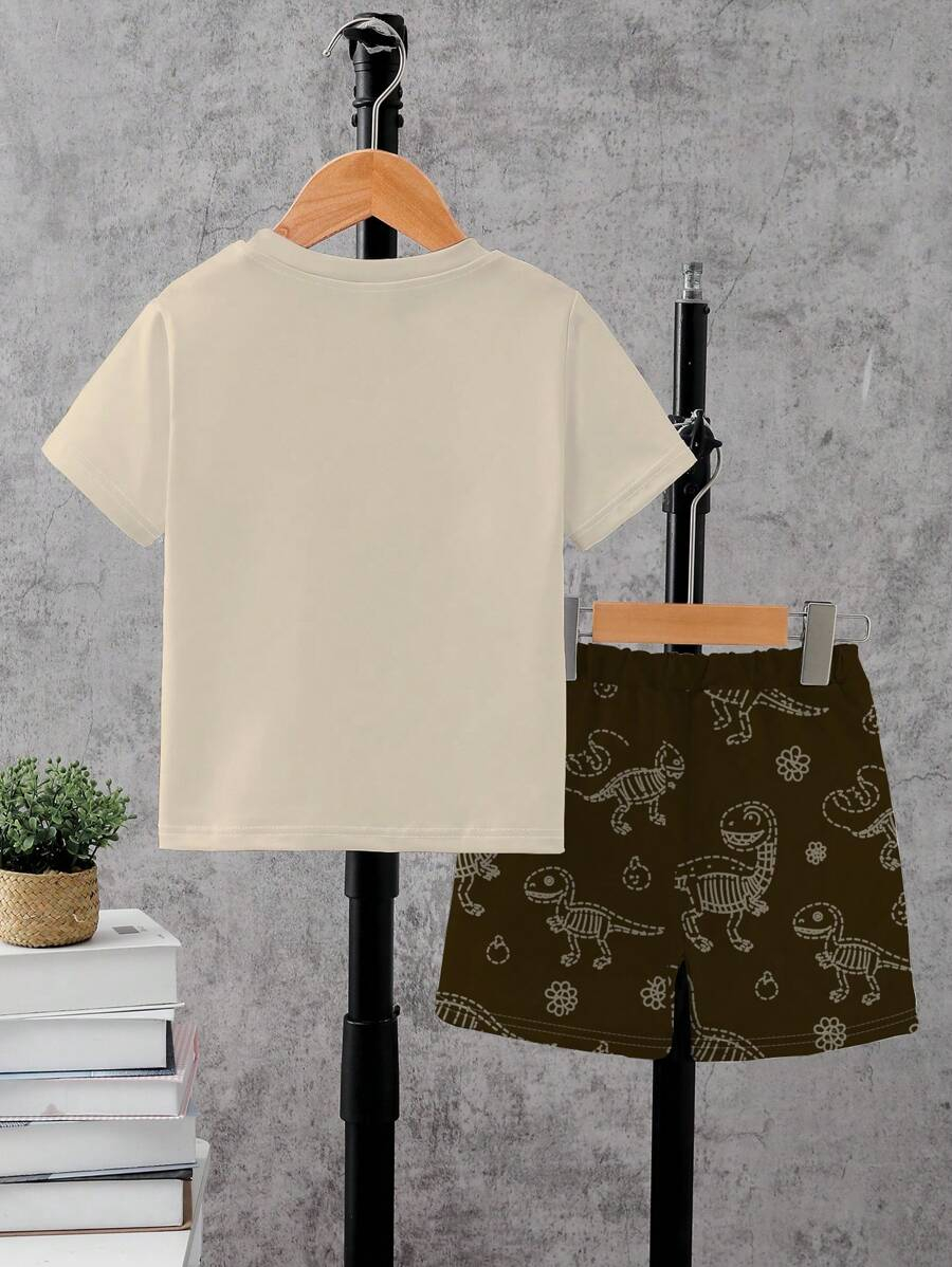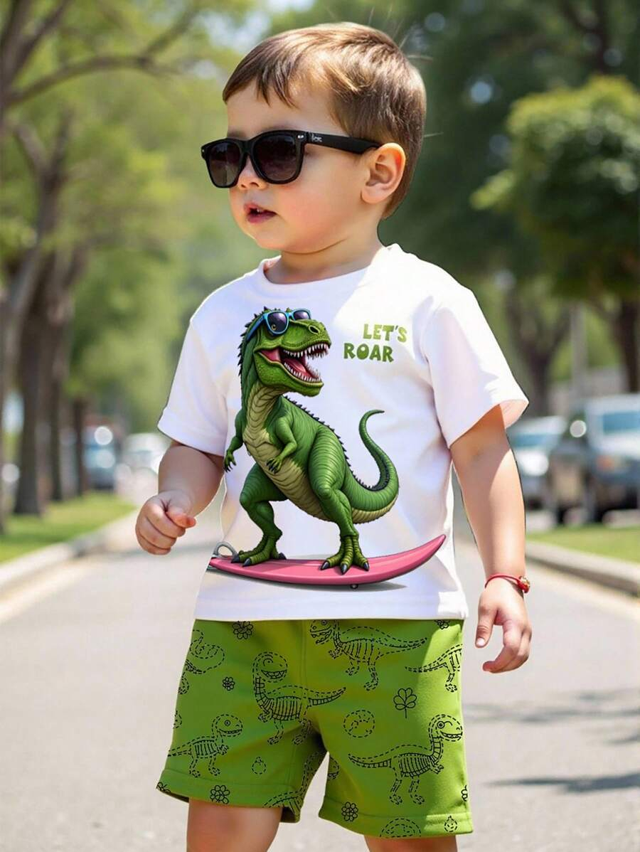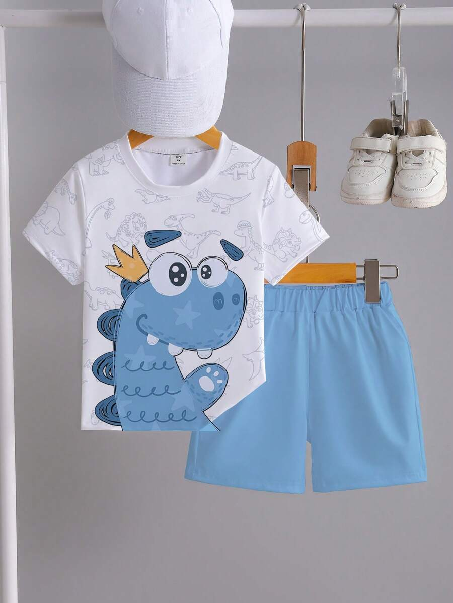 SHEIN 1 Set Toddler Boys Cartoon Dinosaur Print Short Sleeve T-Shirt And Shorts Set, Lightweight For Daily Wear, Suitable For Spring/Summer Dinosaur Clothes For Boys Summer Holiday YB00009
