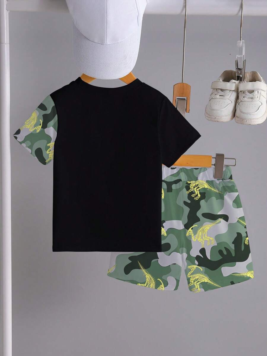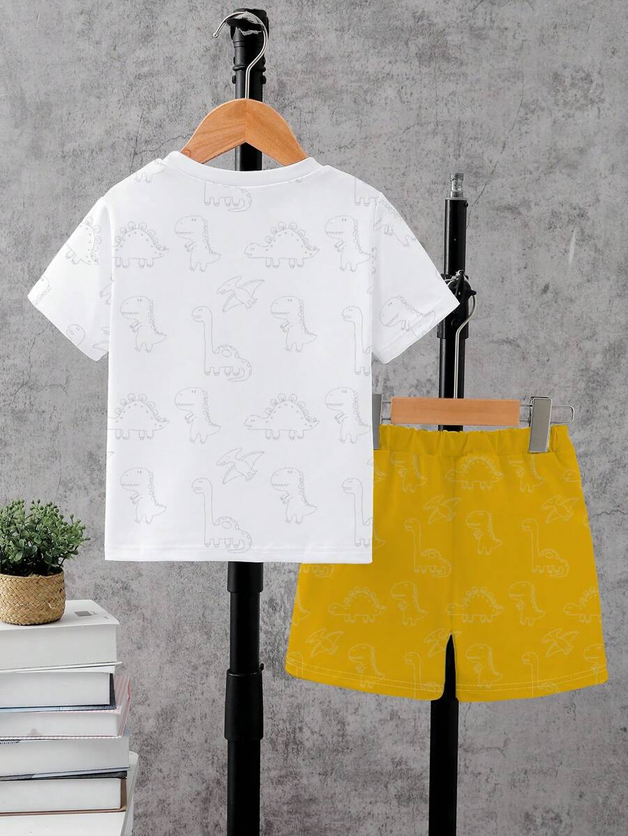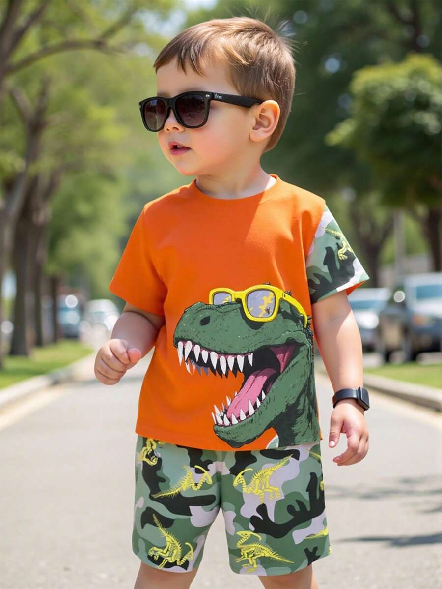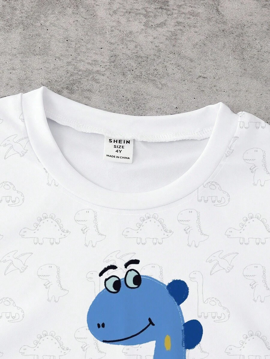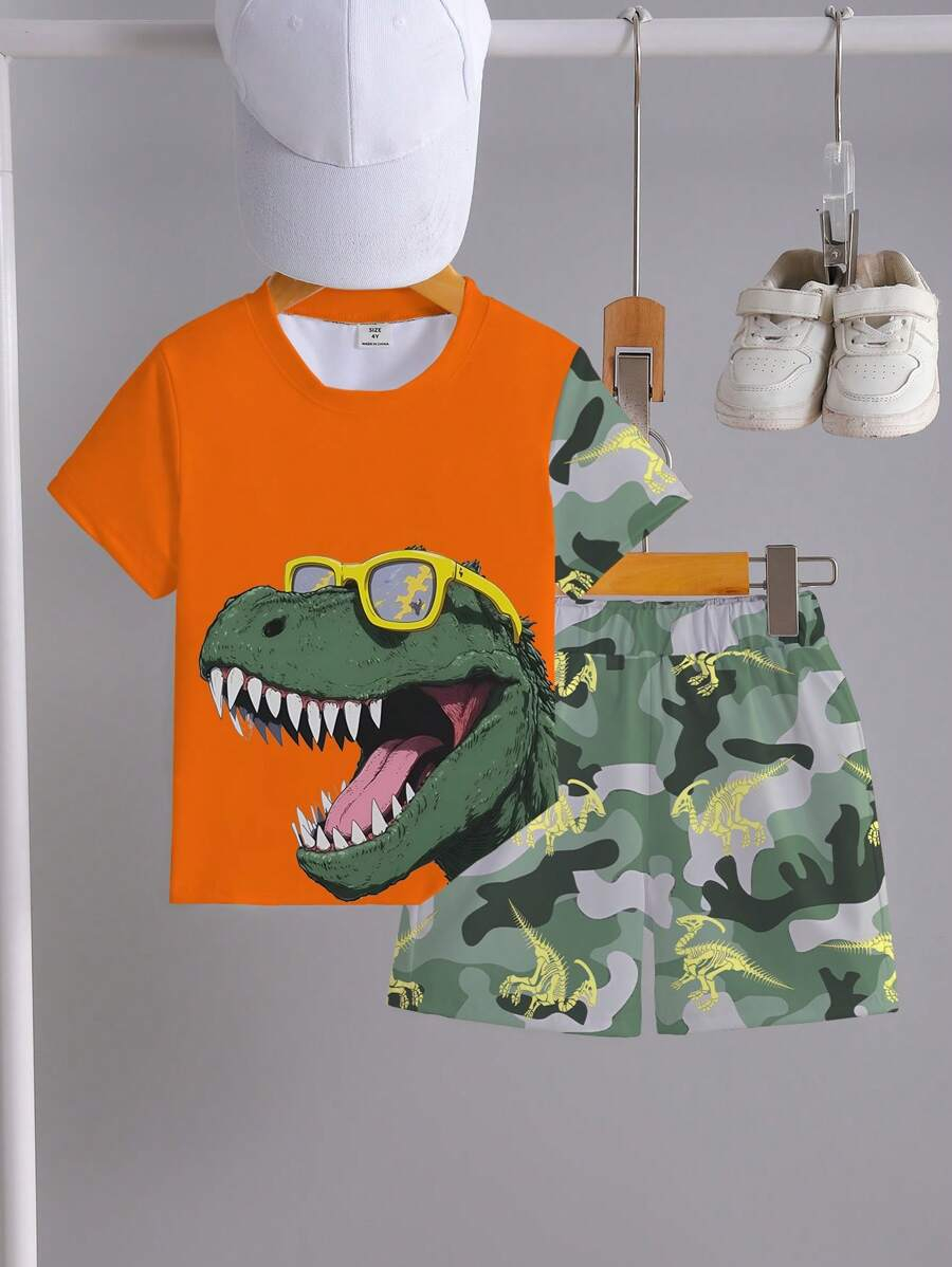 SHEIN 1 Set Toddler Boys Cartoon Dinosaur Print Short Sleeve T-Shirt And Shorts Set, Lightweight For Daily Wear, Suitable For Spring/Summer Dinosaur Clothes For Boys Summer Holiday YB00009