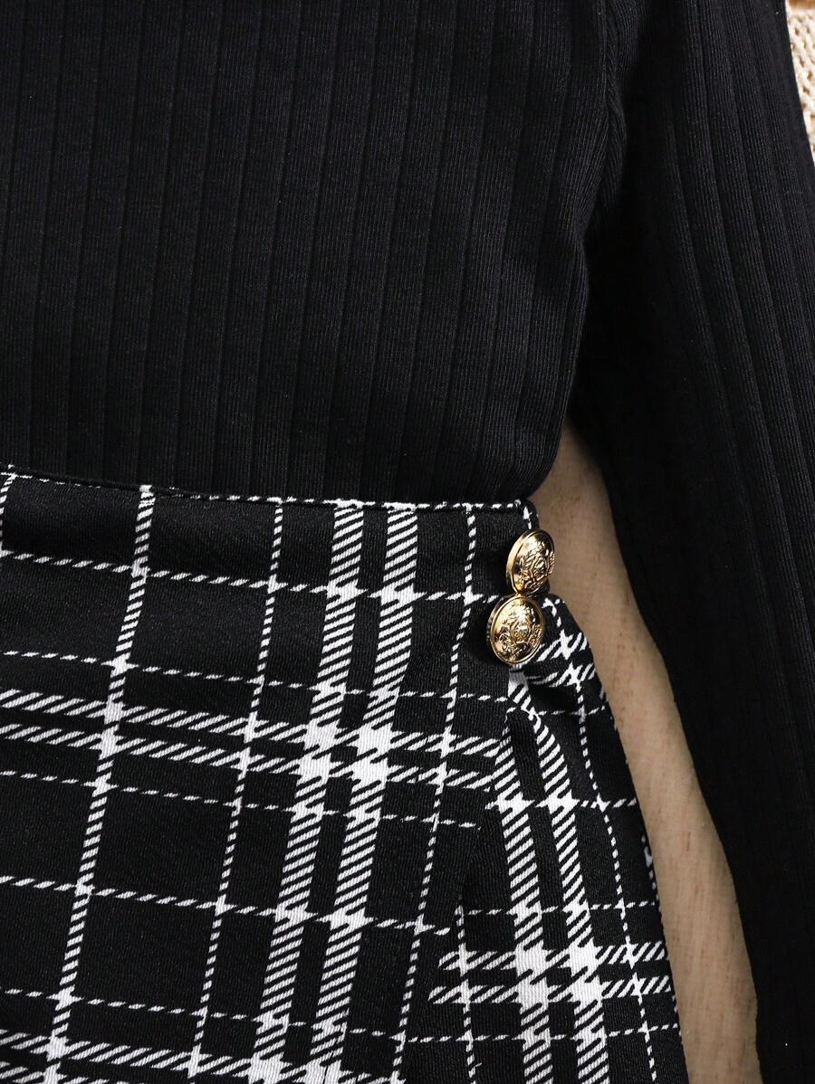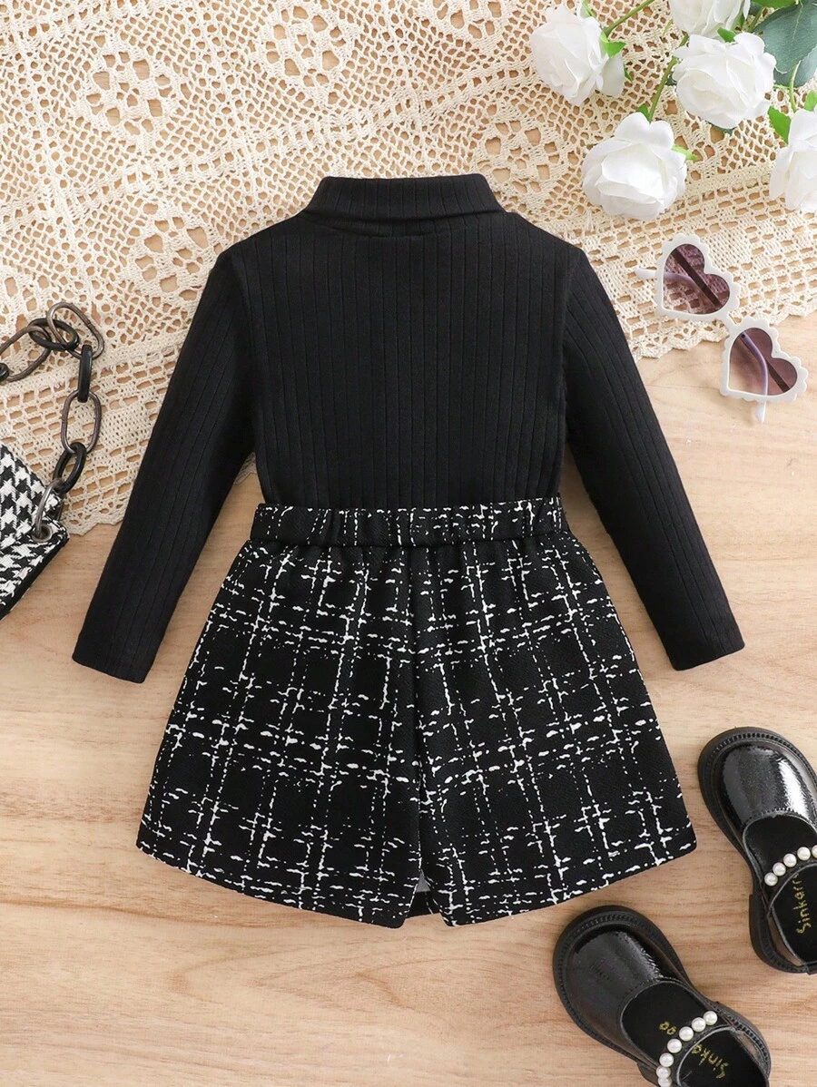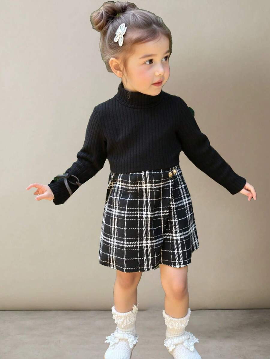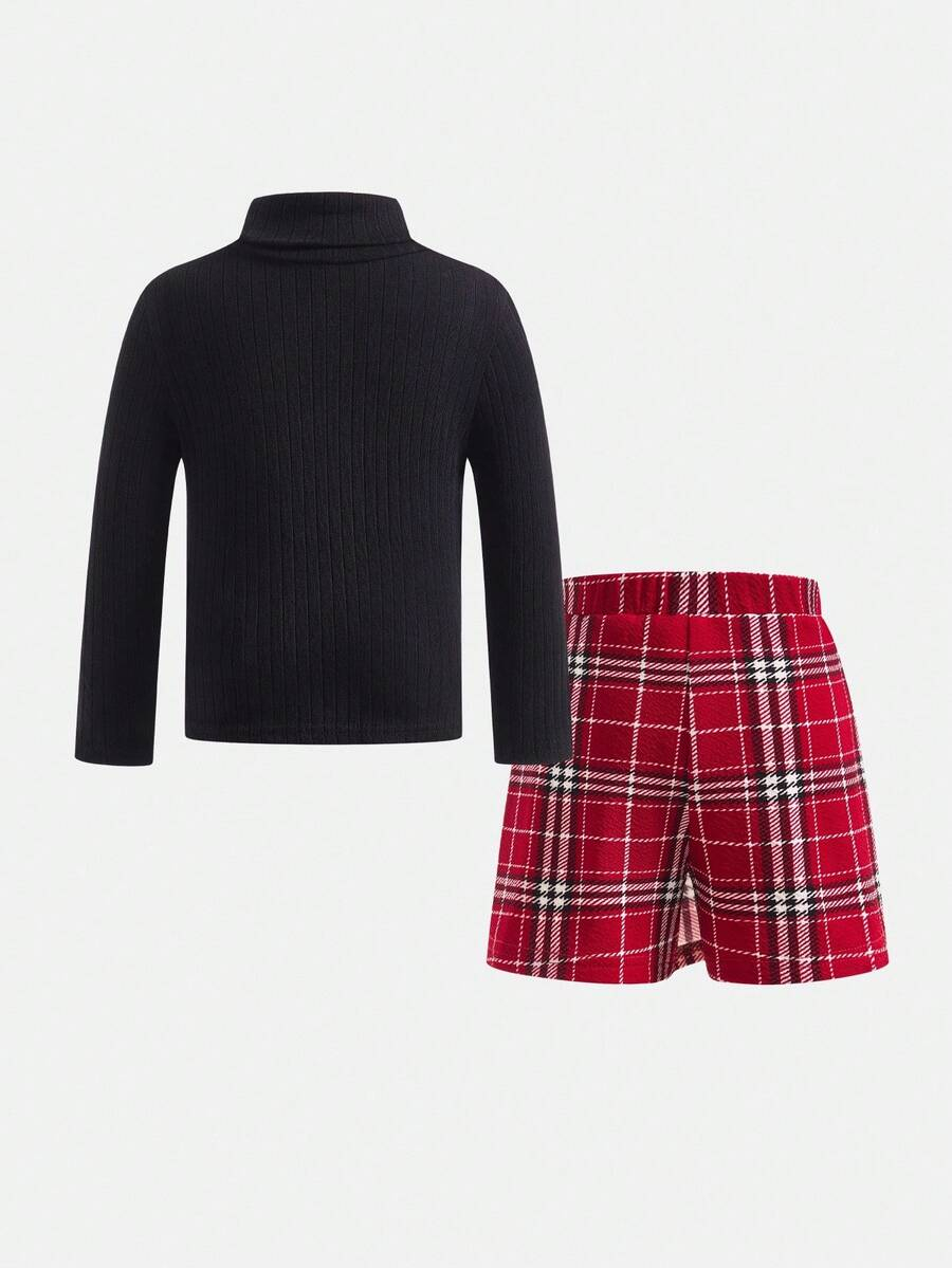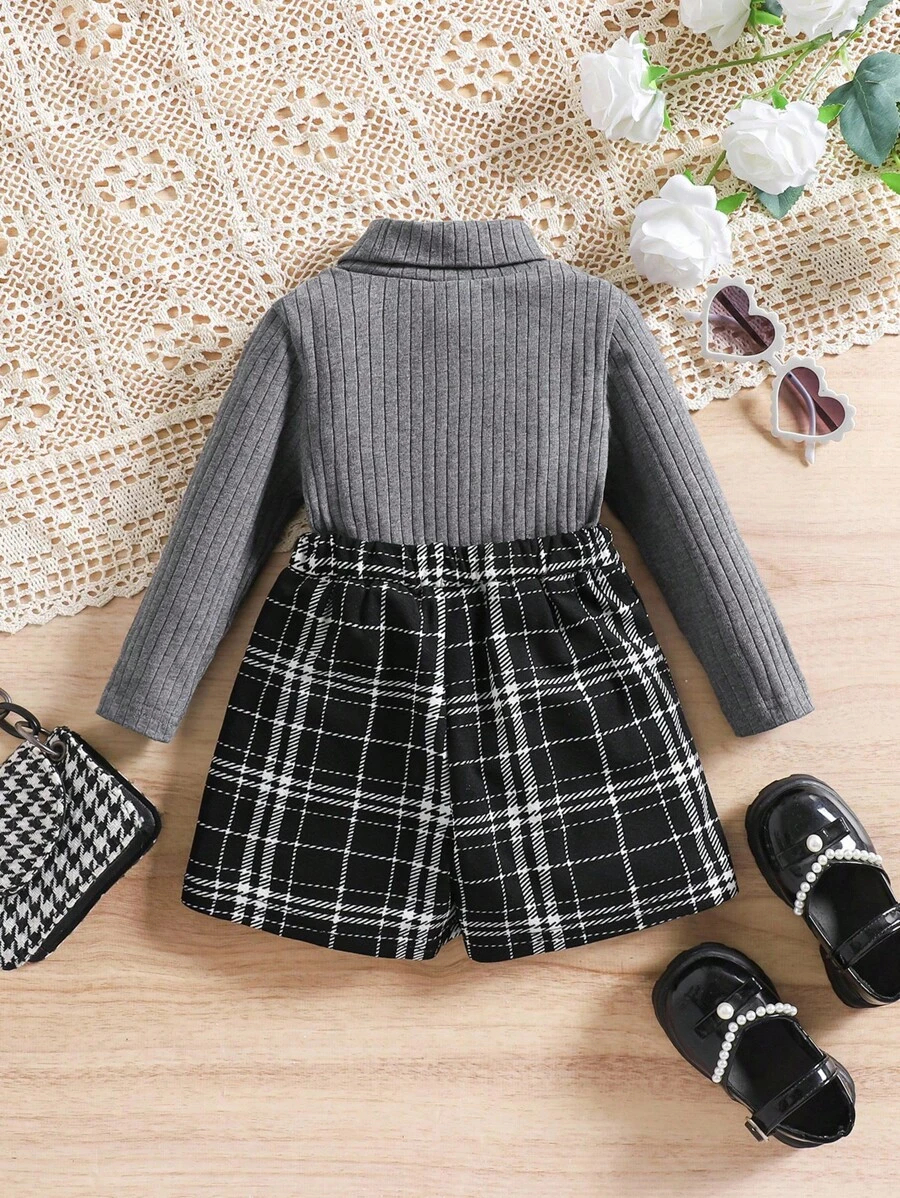 SHEIN 2pcs Baby Girl Knit Black Long Sleeve Shirt And Plaid Elastic Waist Shorts Set, Autumn/Winter WNTD0003