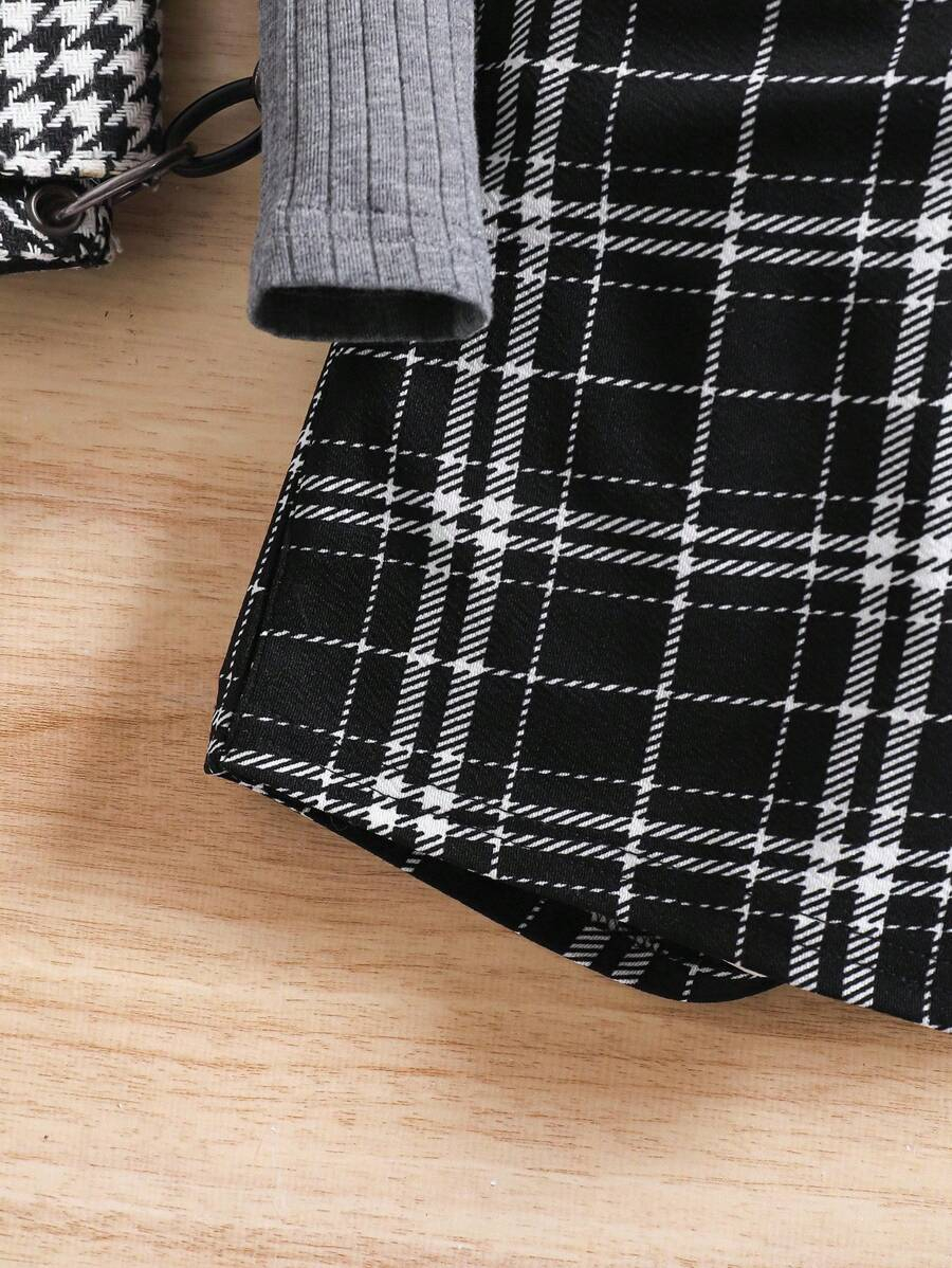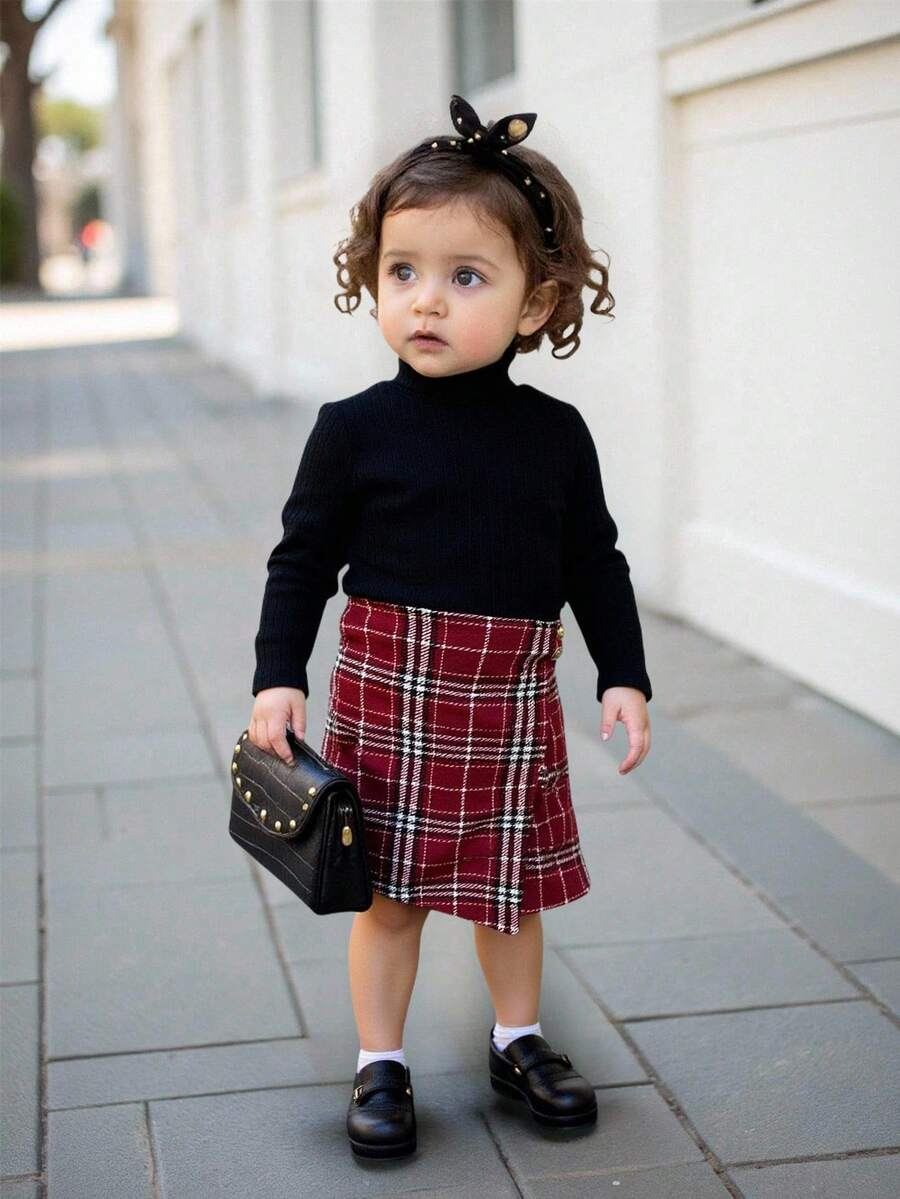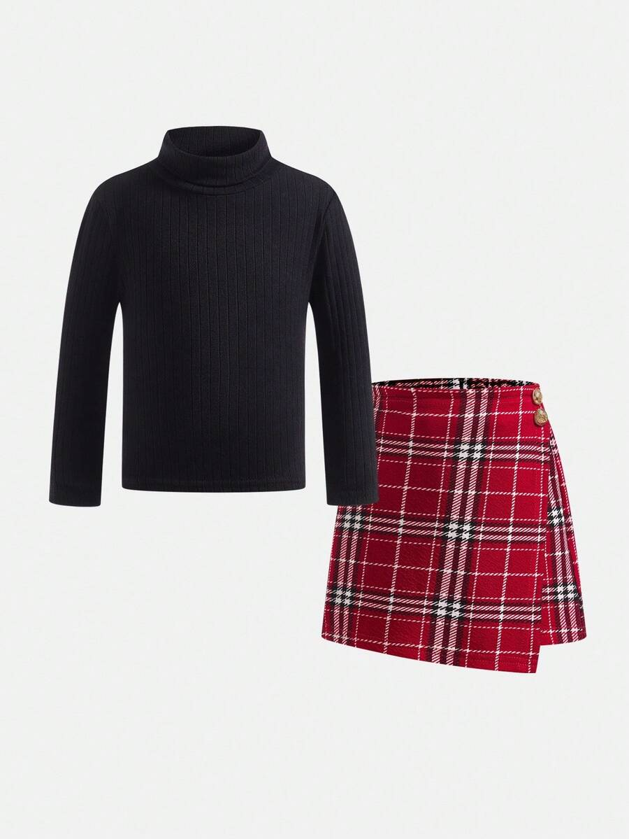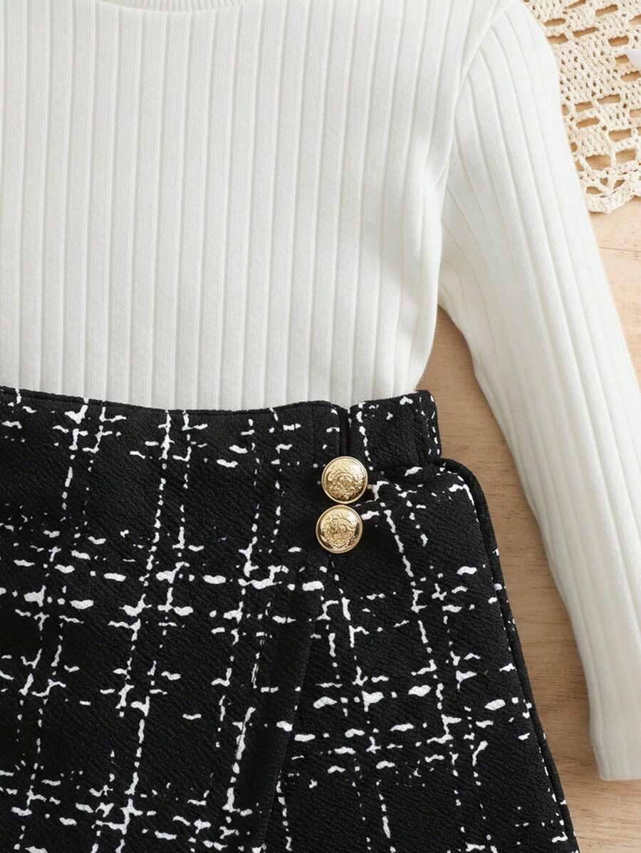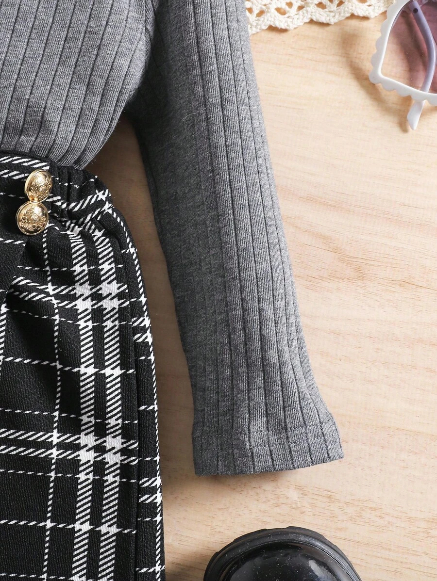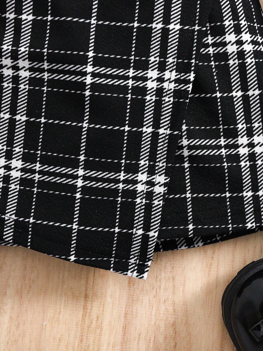 SHEIN 2pcs Baby Girl Knit Black Long Sleeve Shirt And Plaid Elastic Waist Shorts Set, Autumn/Winter WNTD0003