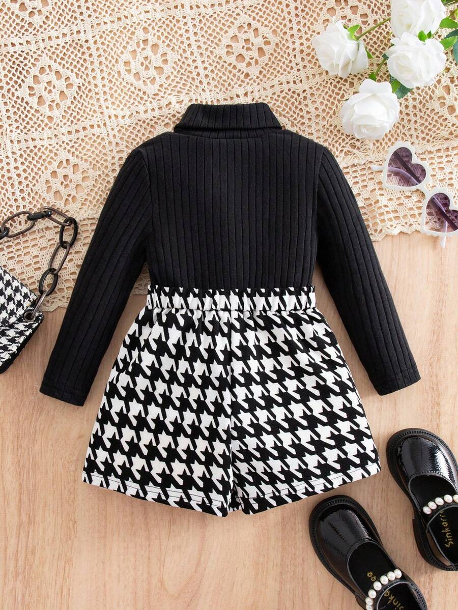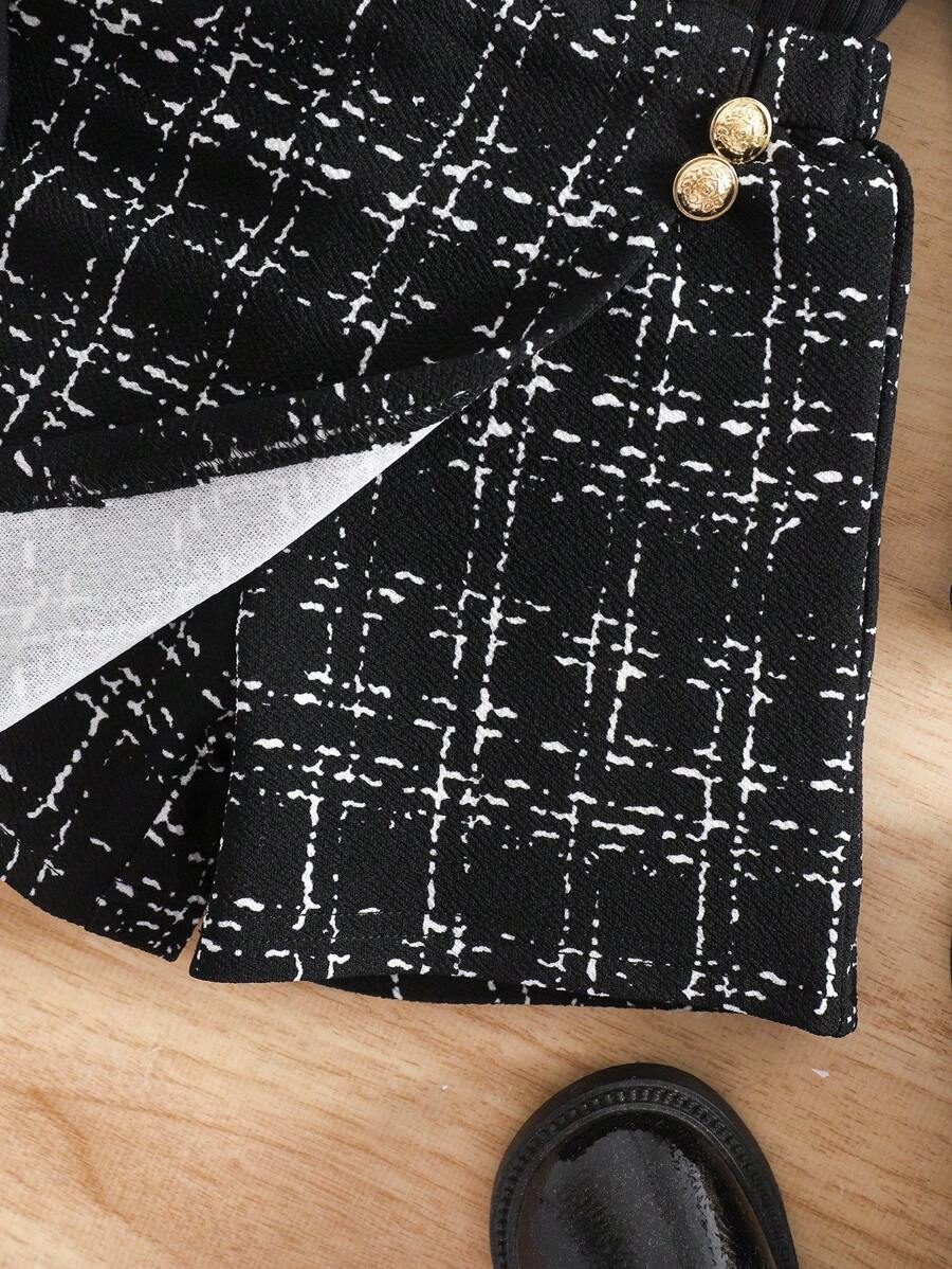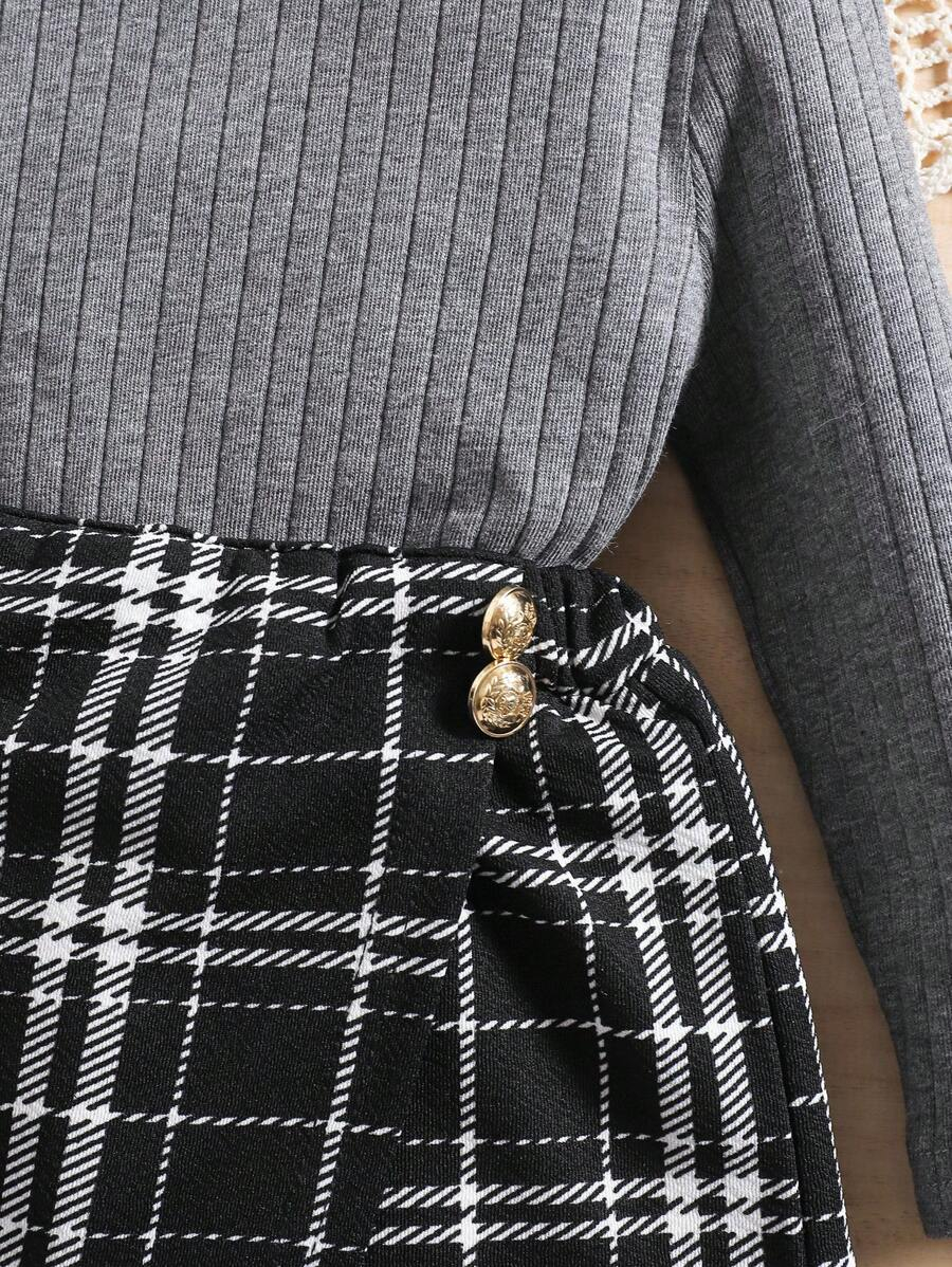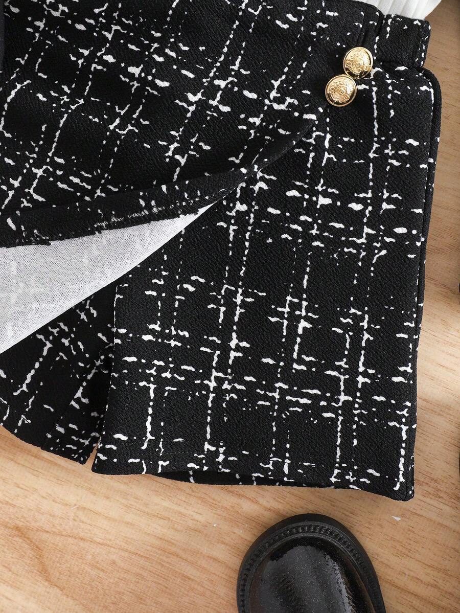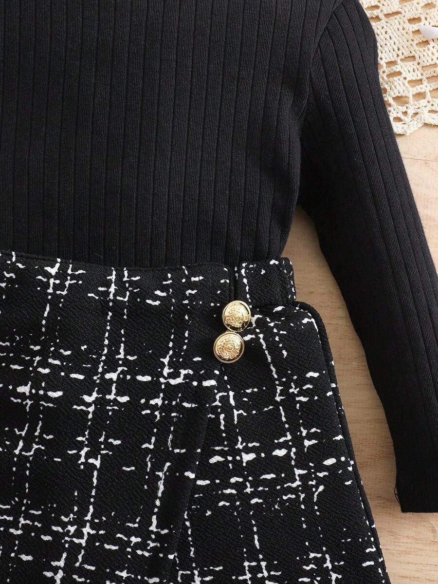 SHEIN 2pcs Baby Girl Knit Black Long Sleeve Shirt And Plaid Elastic Waist Shorts Set, Autumn/Winter WNTD0003