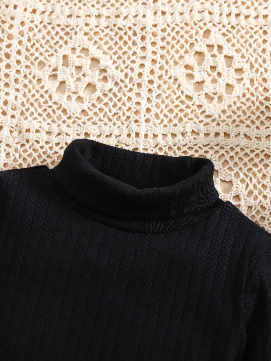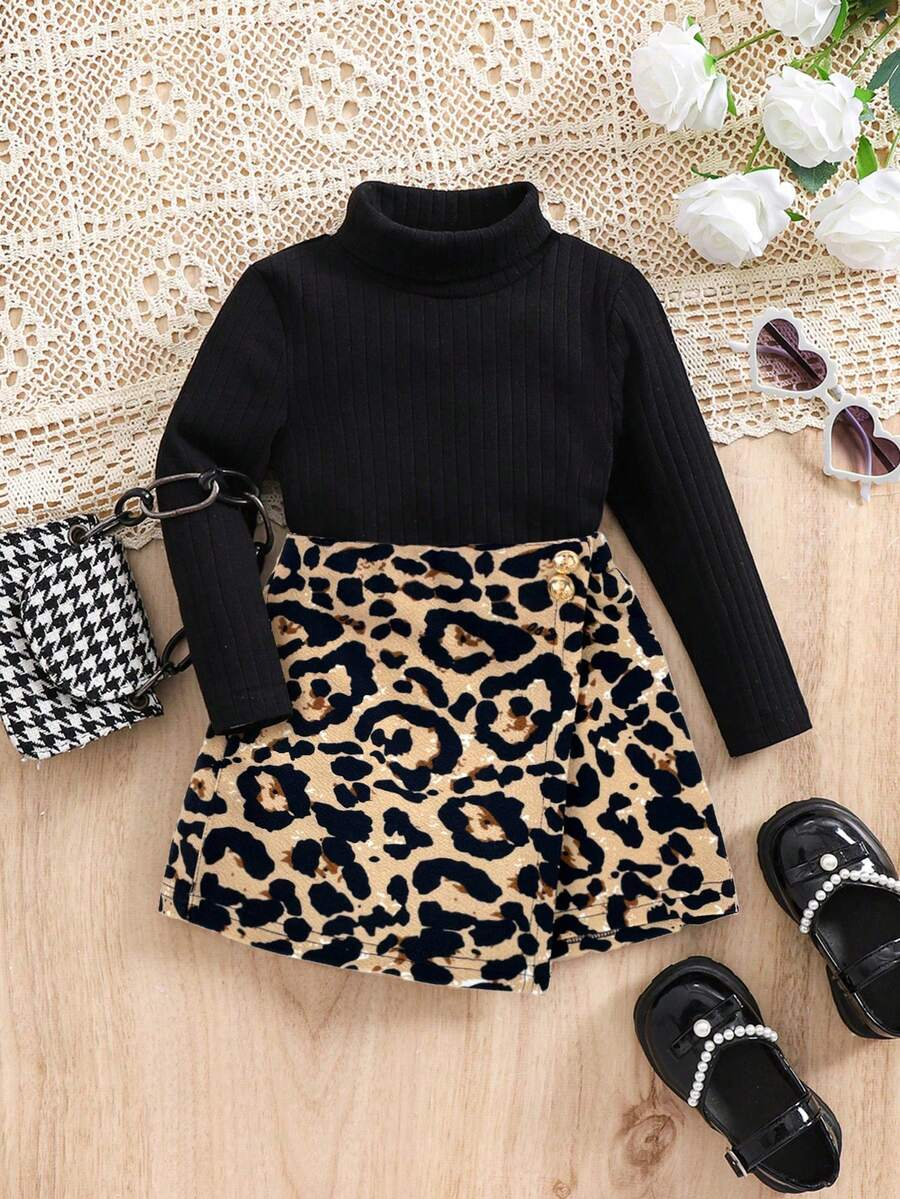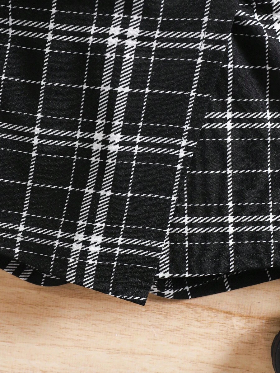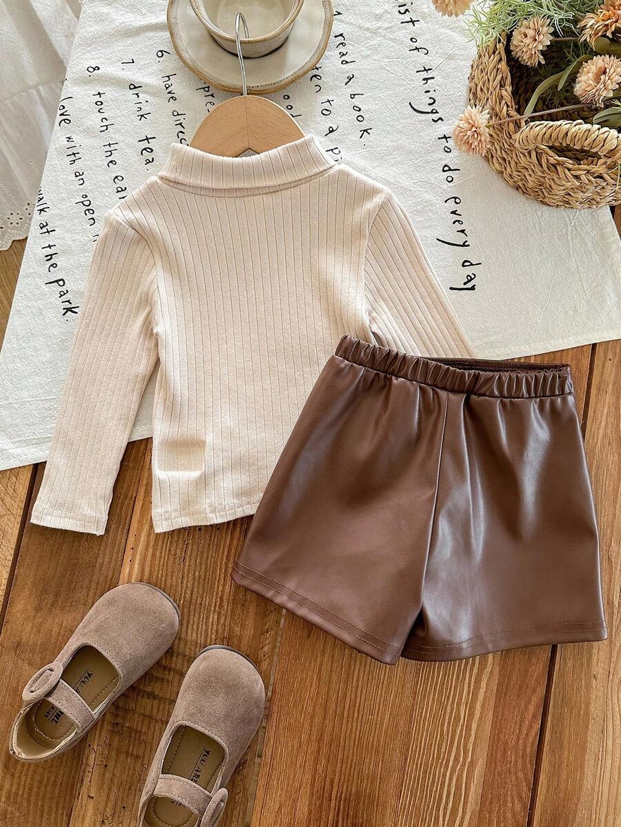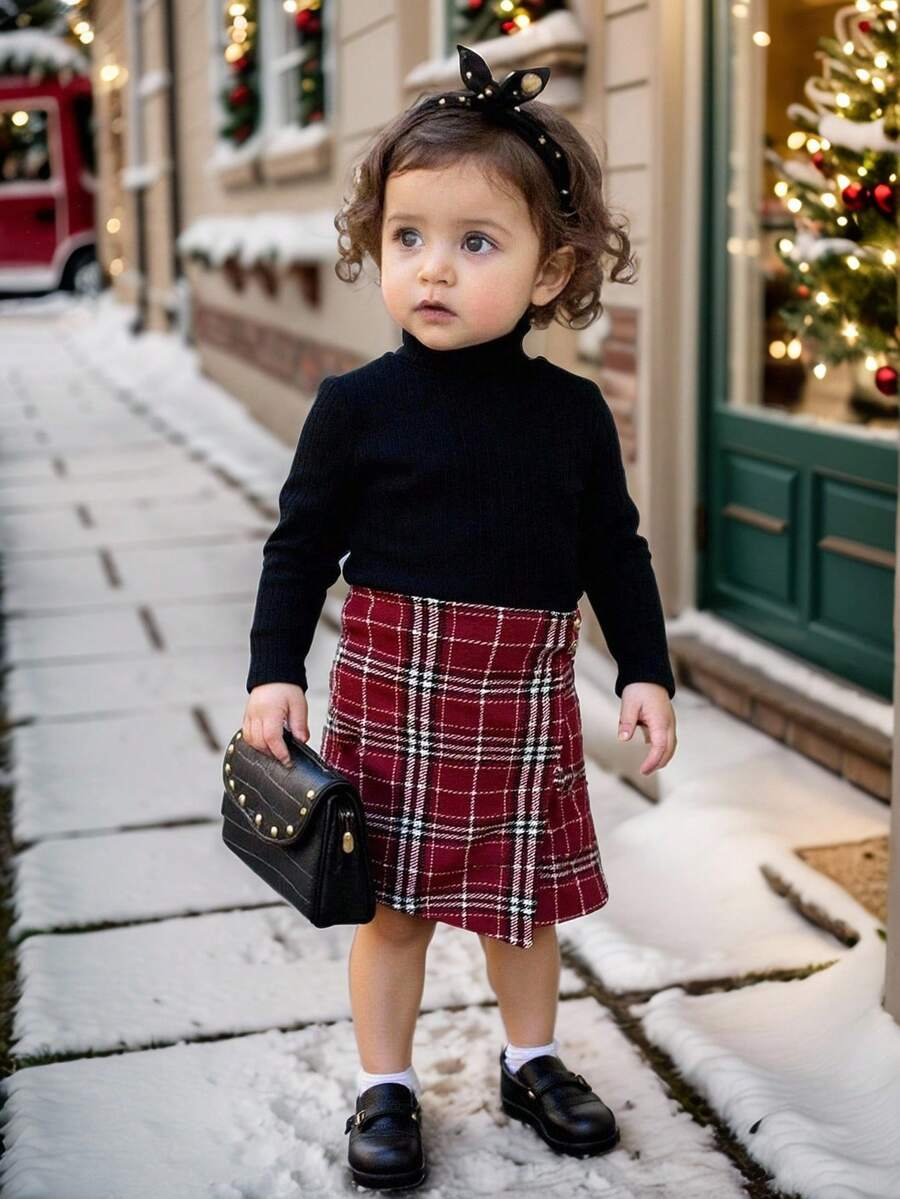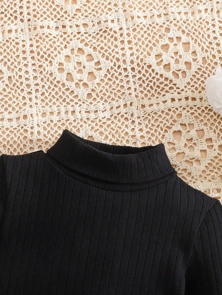 SHEIN 2pcs Baby Girl Knit Black Long Sleeve Shirt And Plaid Elastic Waist Shorts Set, Autumn/Winter WNTD0003