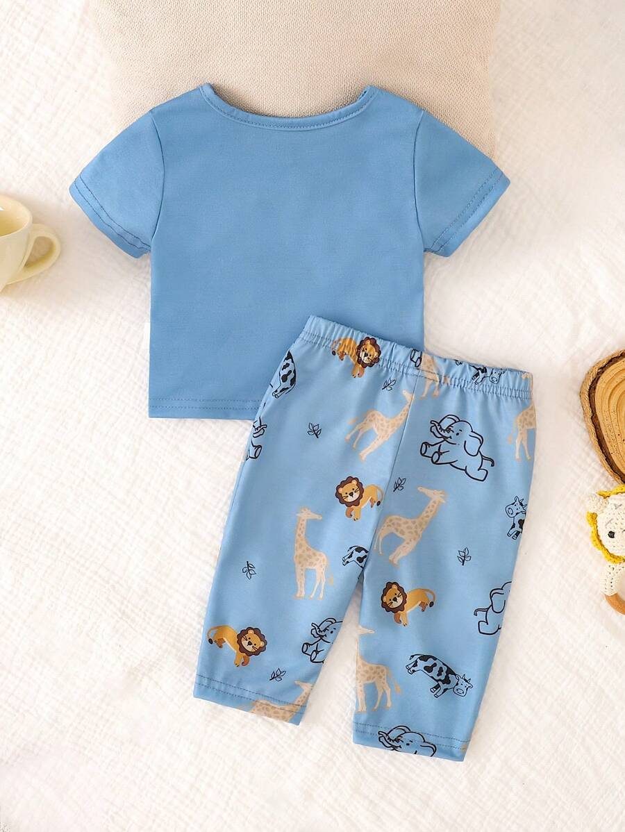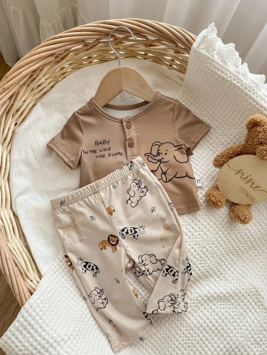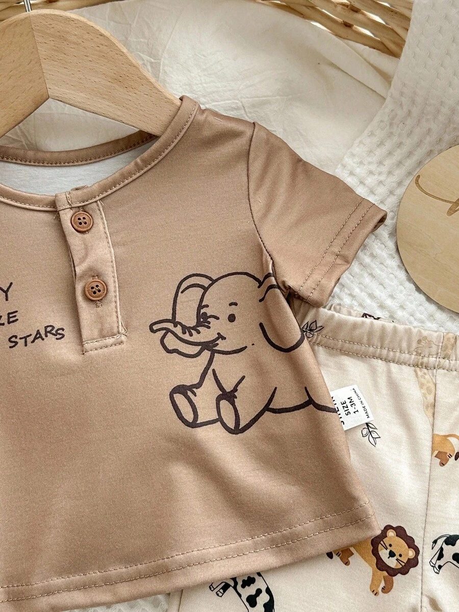 SHEIN 2pcs Newborn Baby Boy Cute Elephant Pattern Round Neck Front Open Short Sleeve Top And Shorts Soft Touch Pajama Set NB00079
