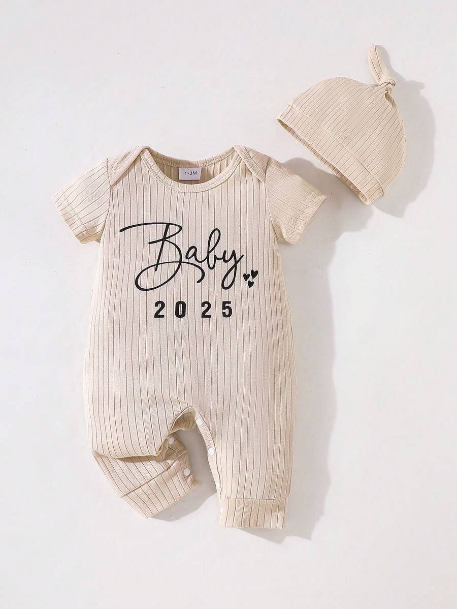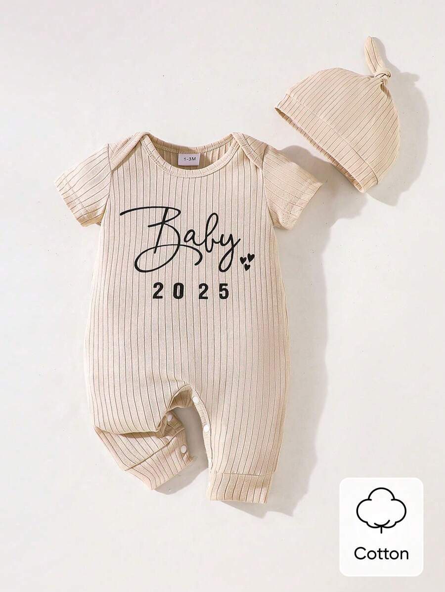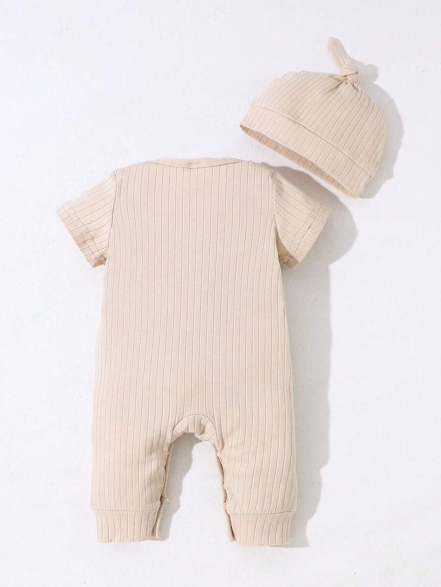 SHEIN 2pcs Newborn Infant Baby Boys Girls Casual Knitted Comfortable Letter Printed Solid Color Envelope Collar Short Sleeve Romper & Hat Set, Spring/Summer, Mother’s Day, Mother & Me Unisex Baby Clothes Neutral New Born Unisex Clothes Newborn Baby Clothing Unisex Newborn Clothing Baby Unisex Clothes NB00086