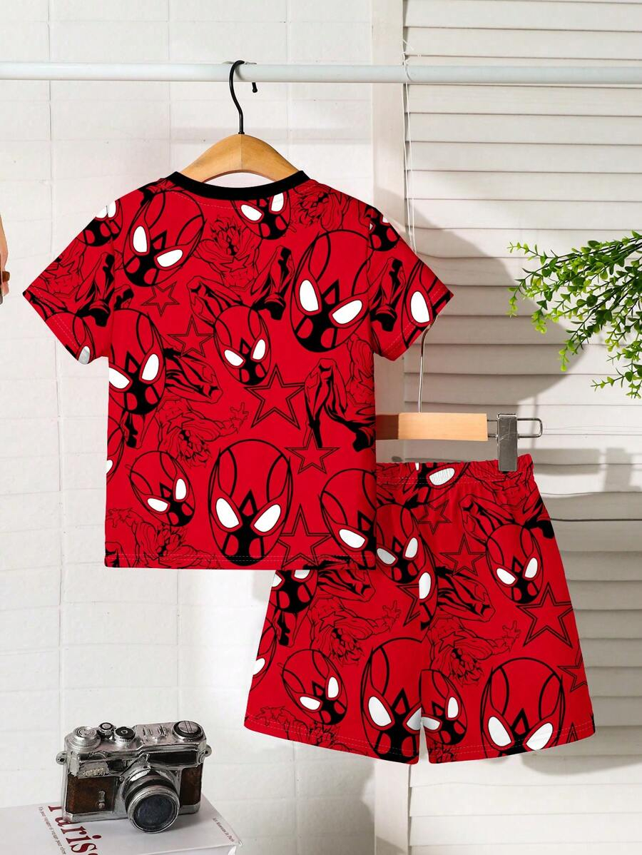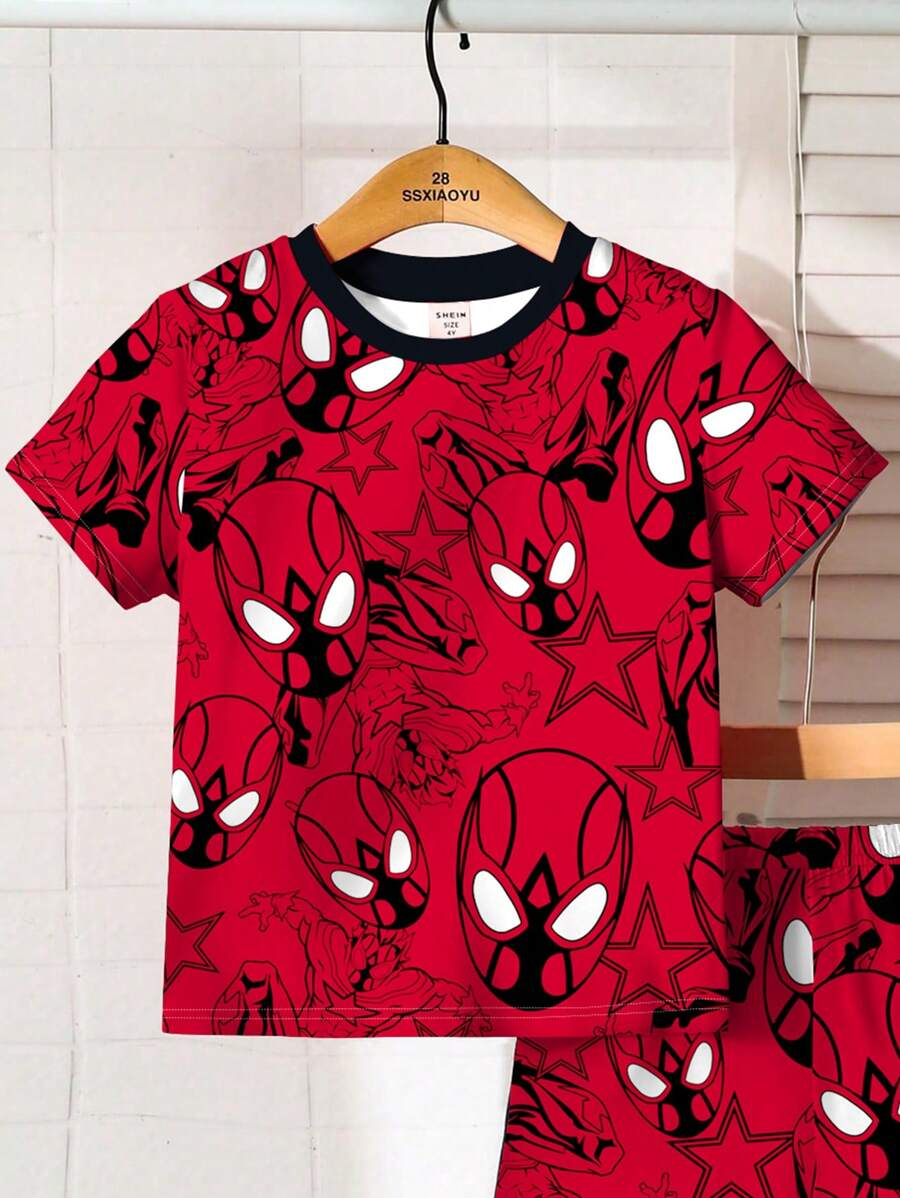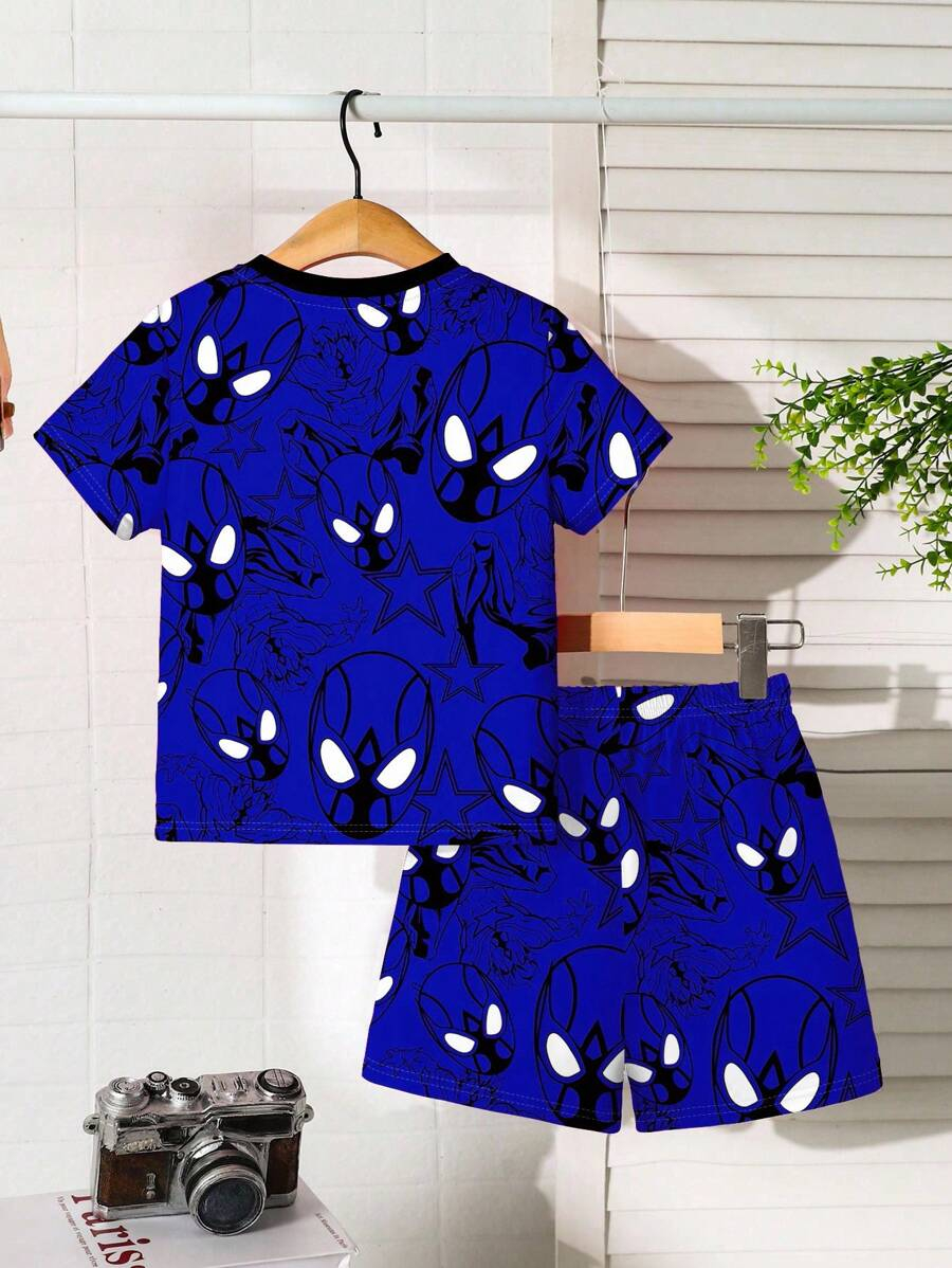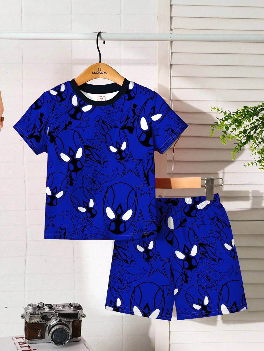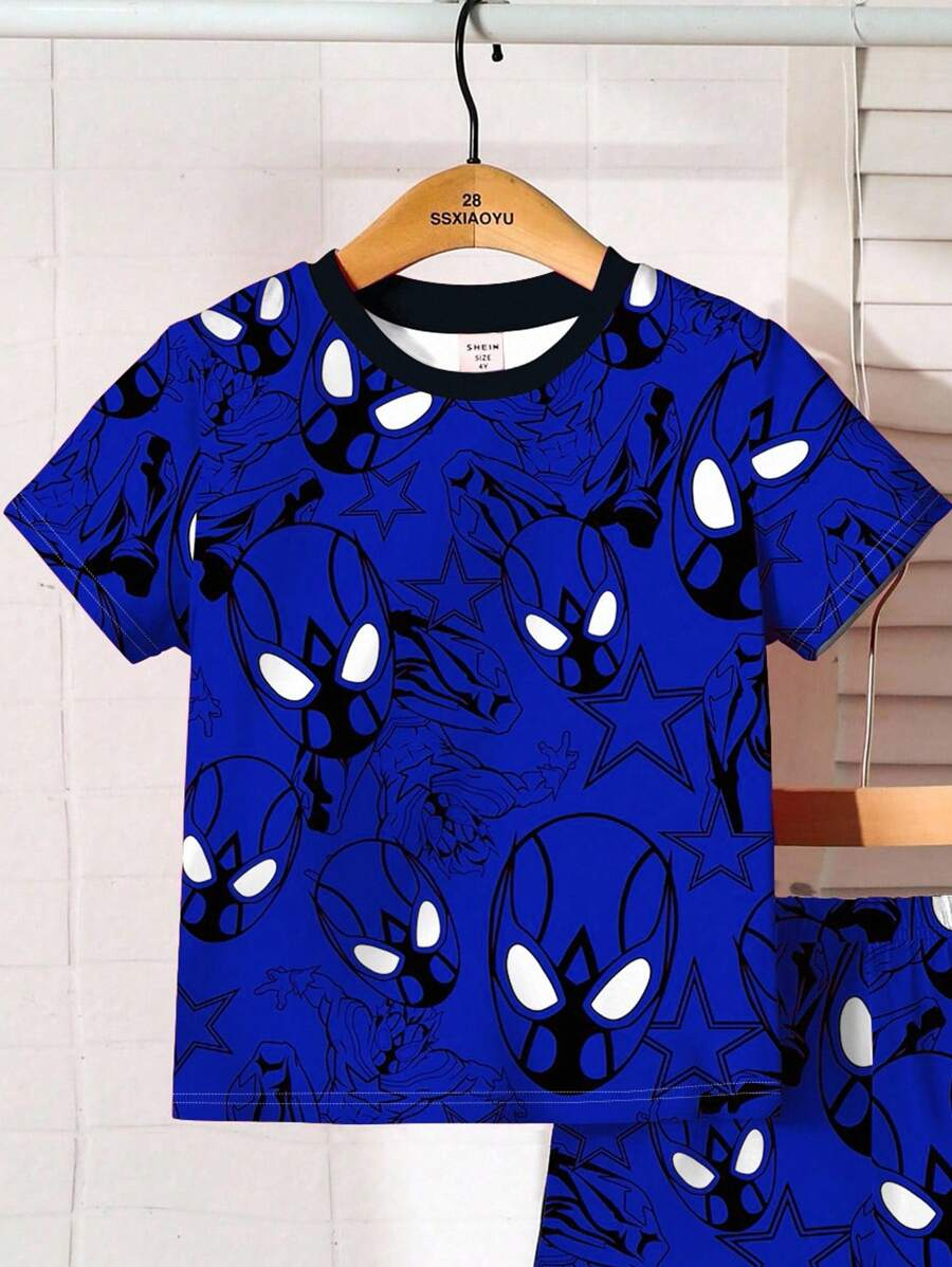 SHEIN 2pcs/Set Young Boys’ Superhero Cartoon Pattern Loose Casual Short Sleeve T-Shirt And Shorts Pajama Set, Summer YB00028