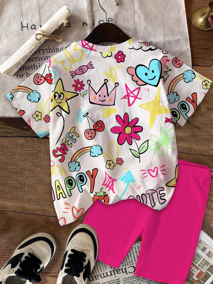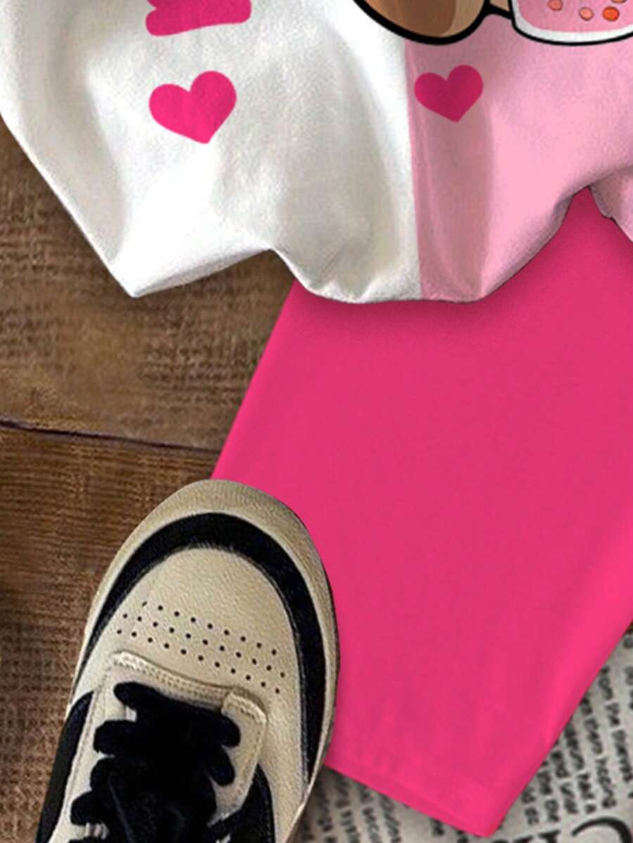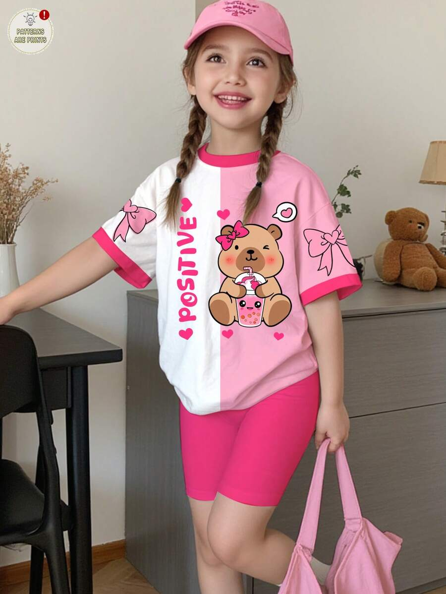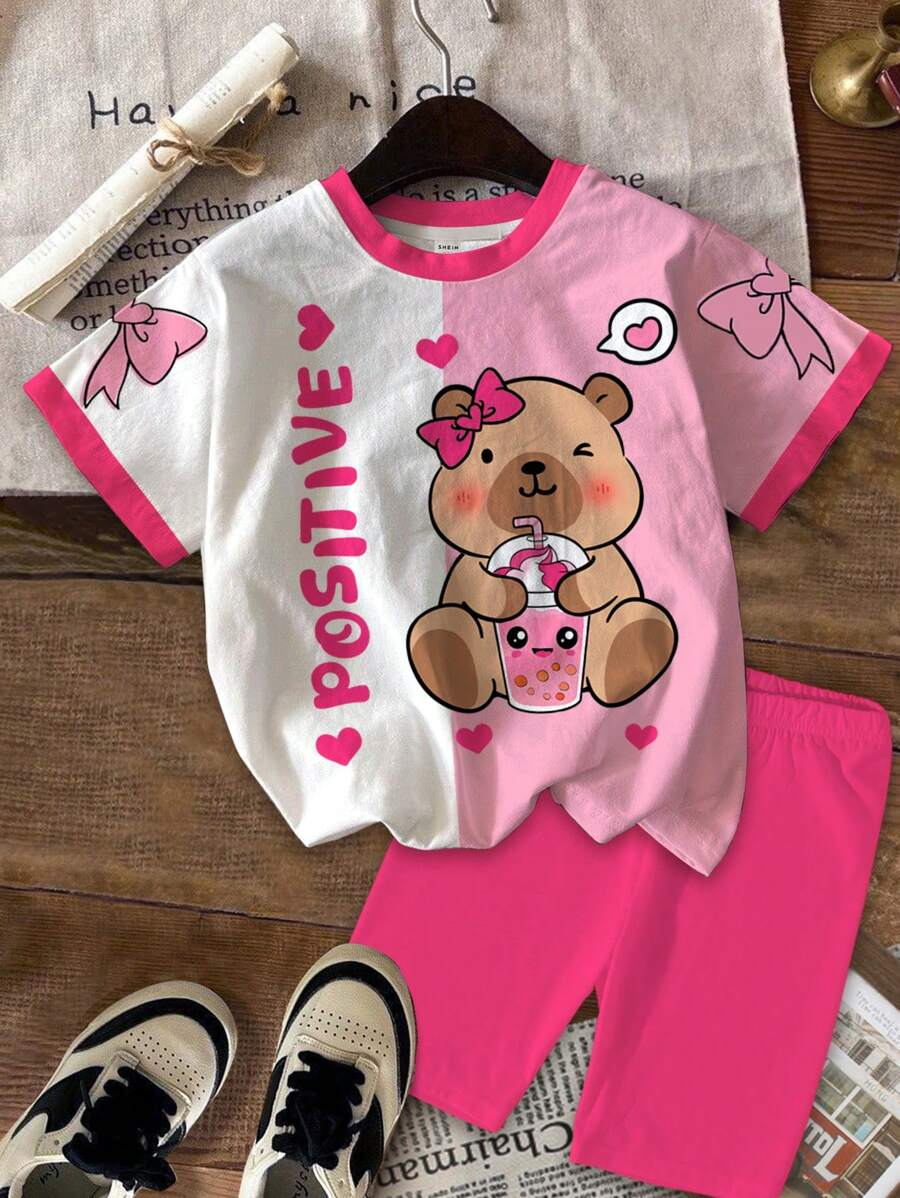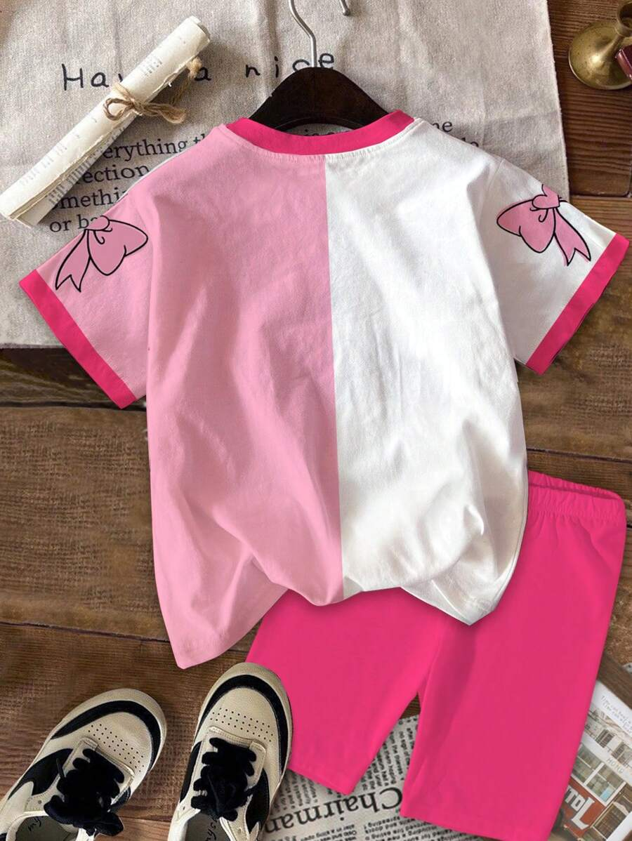 SHEIN 2pcs/Set Young Girl Casual Cute Cartoon Bow Short Sleeve Top And Shorts Set YG00094