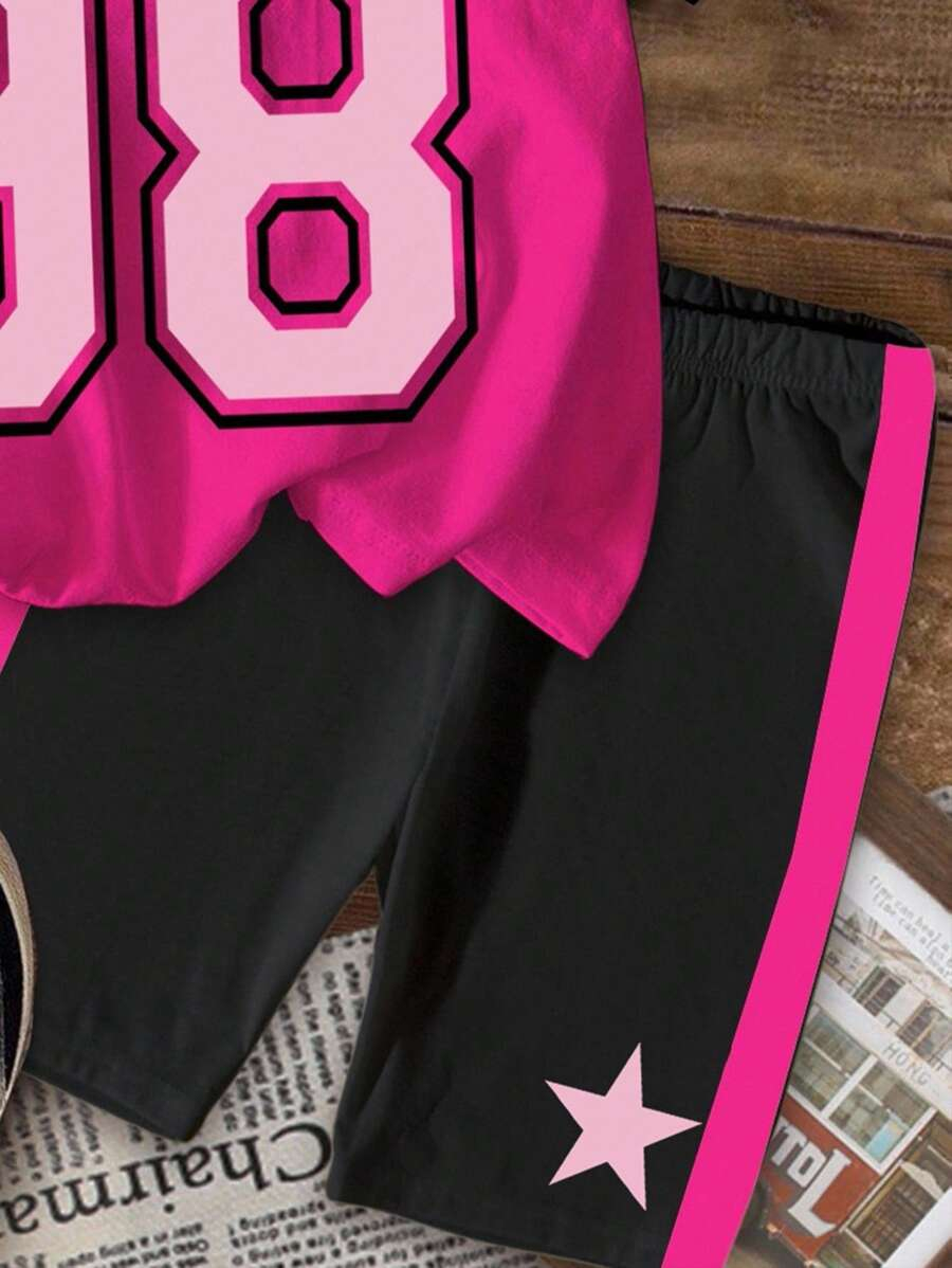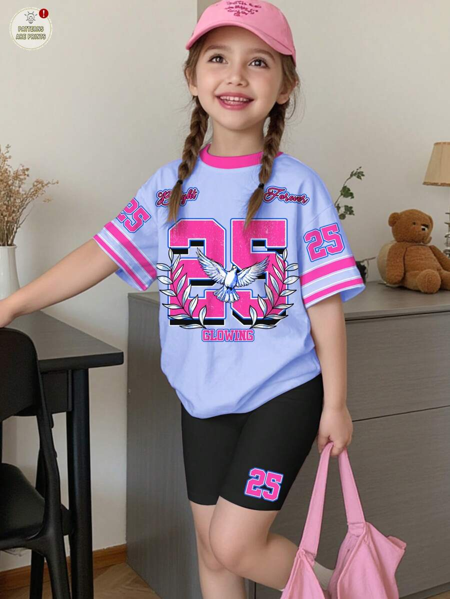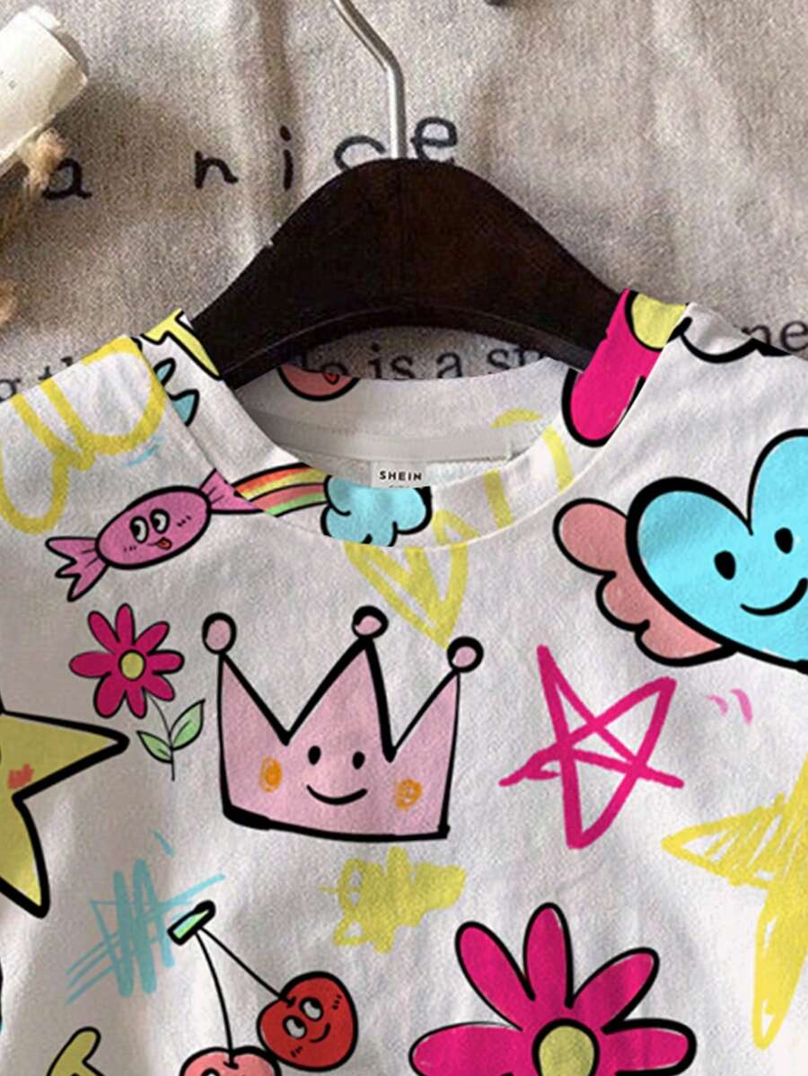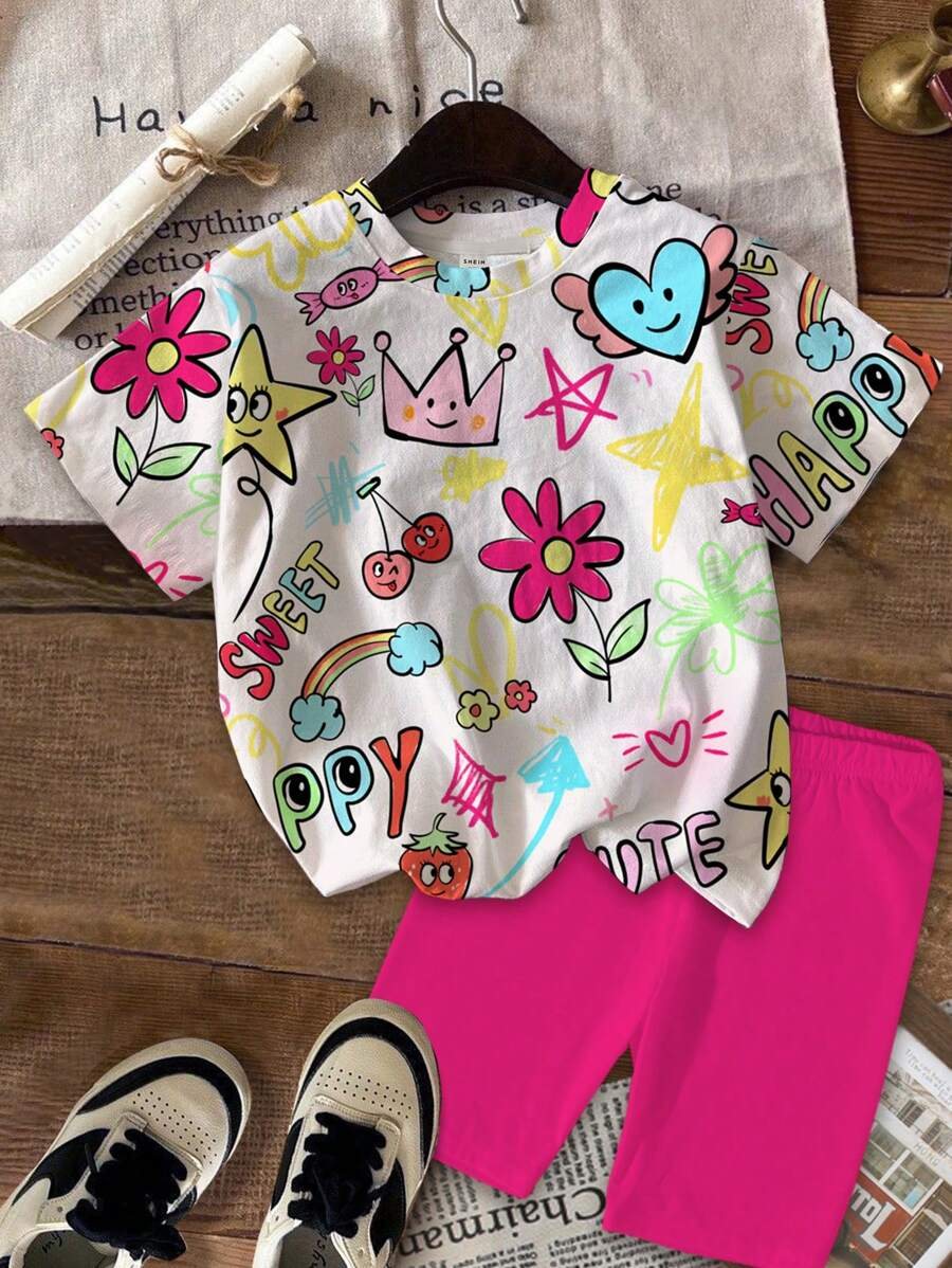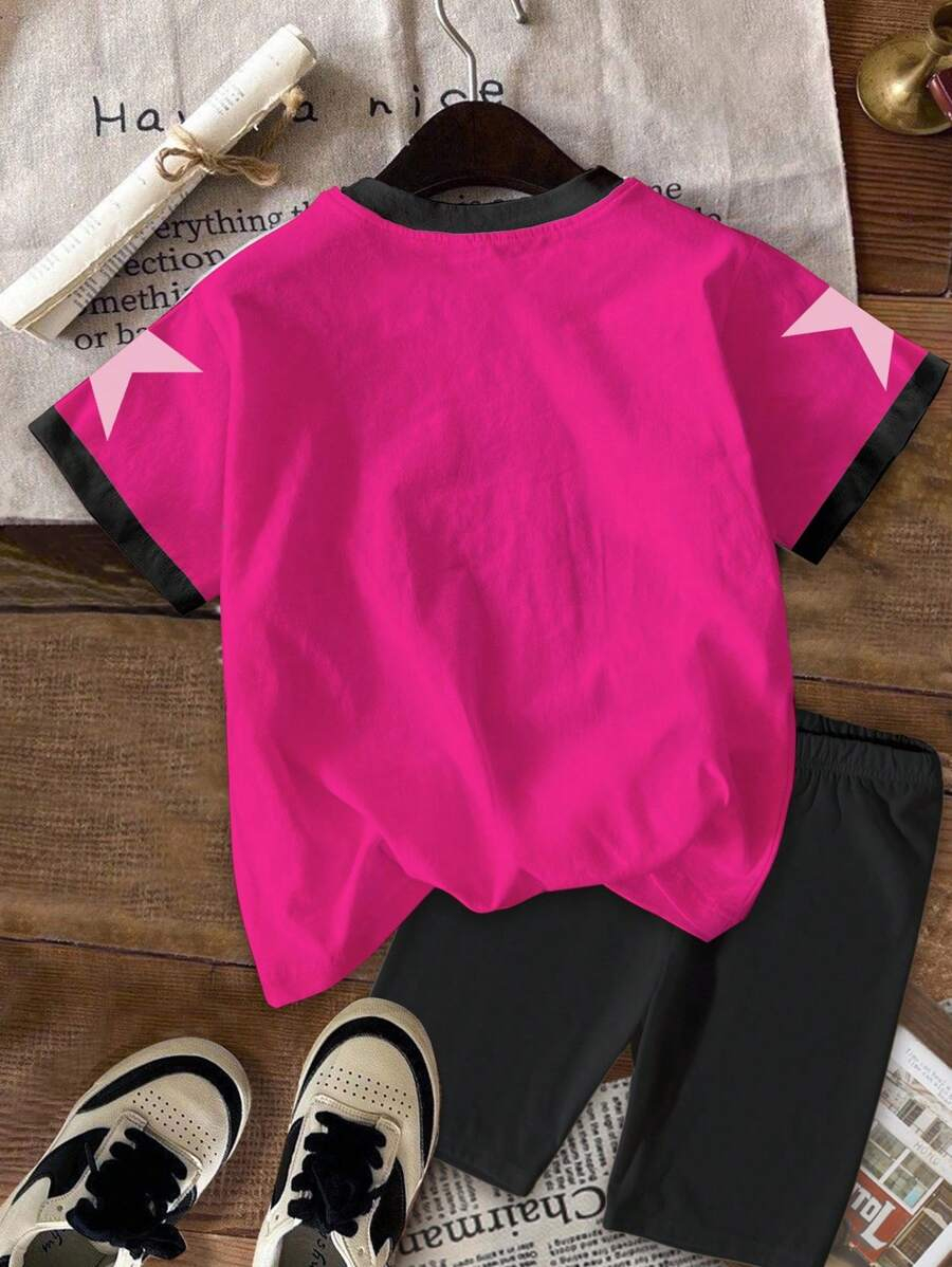 SHEIN 2pcs/Set Young Girl Casual Cute Cartoon Bow Short Sleeve Top And Shorts Set YG00094