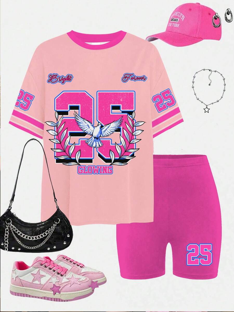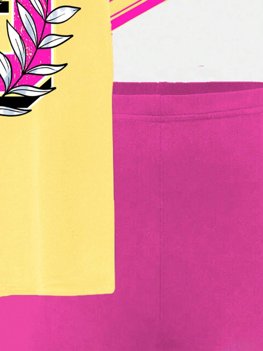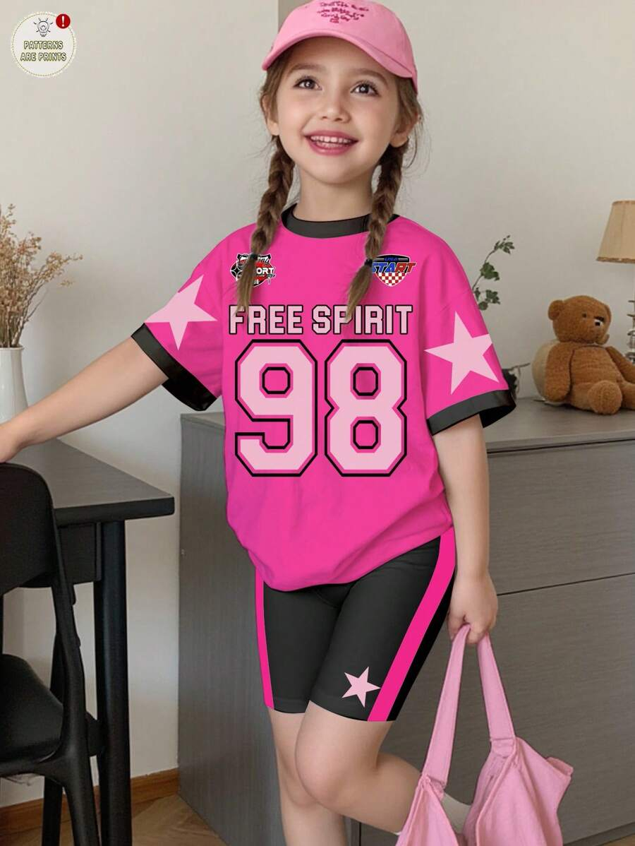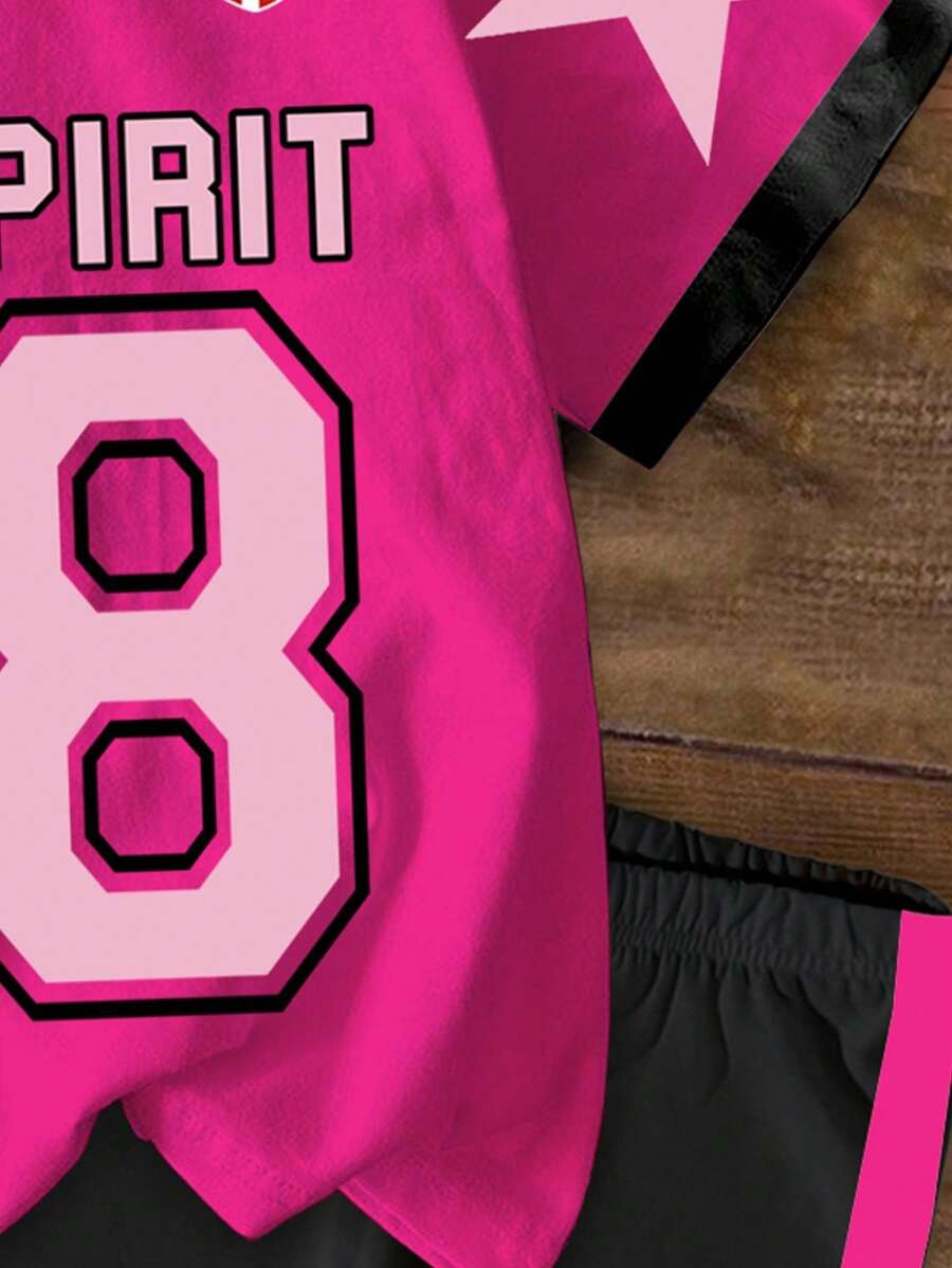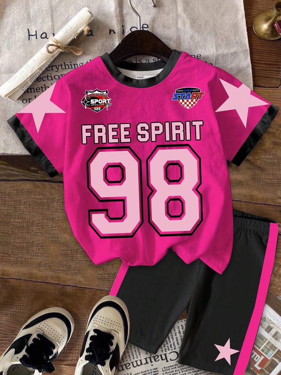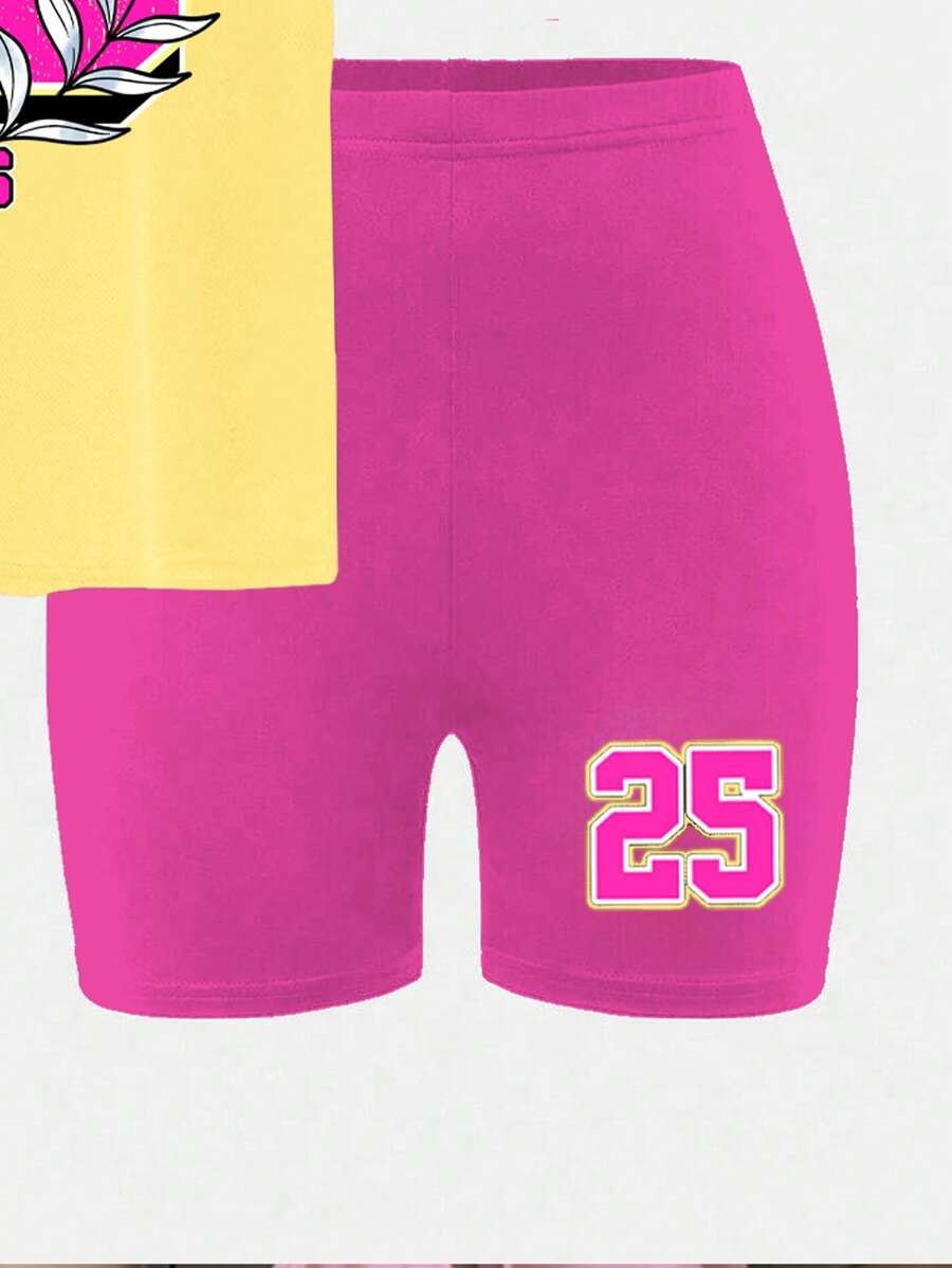 SHEIN 2pcs/Set Young Girl Casual Cute Cartoon Bow Short Sleeve Top And Shorts Set YG00094