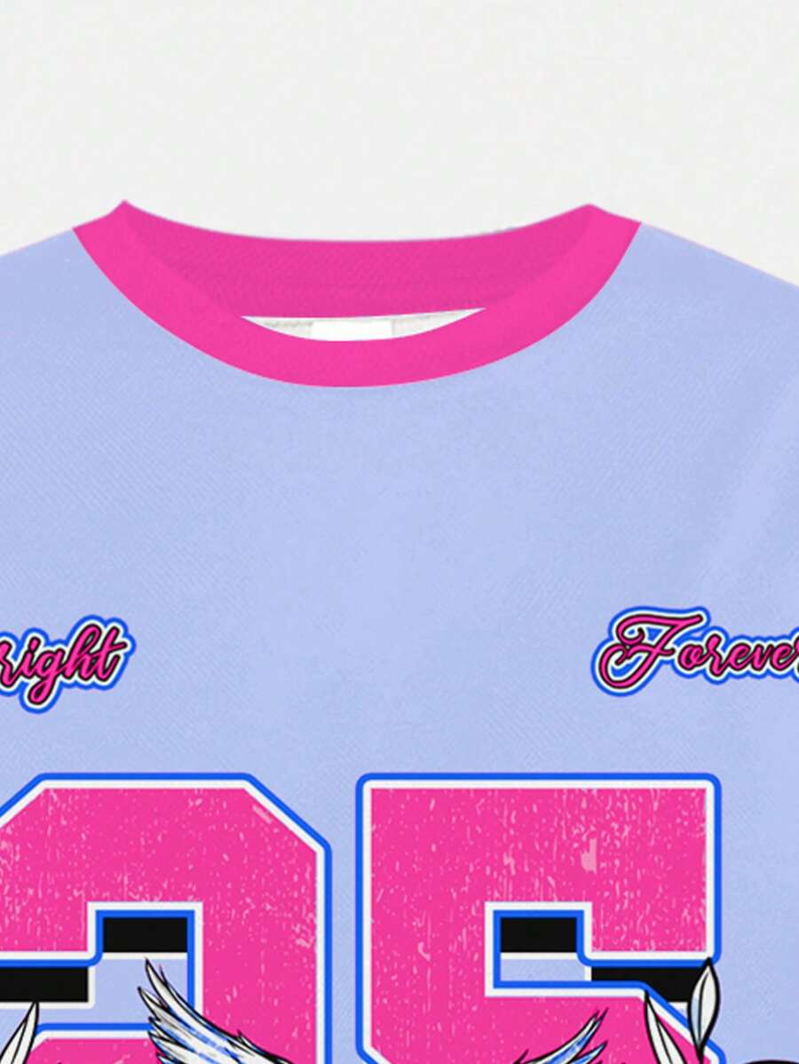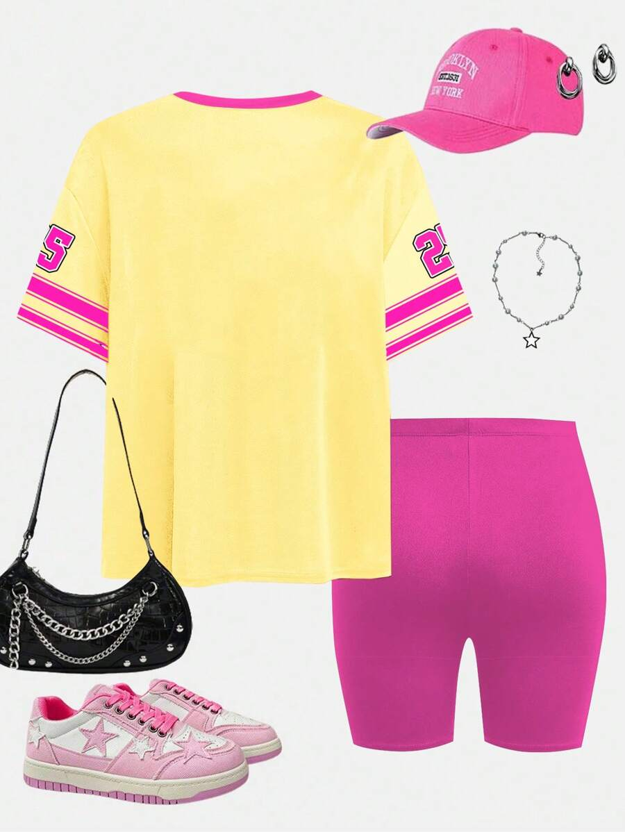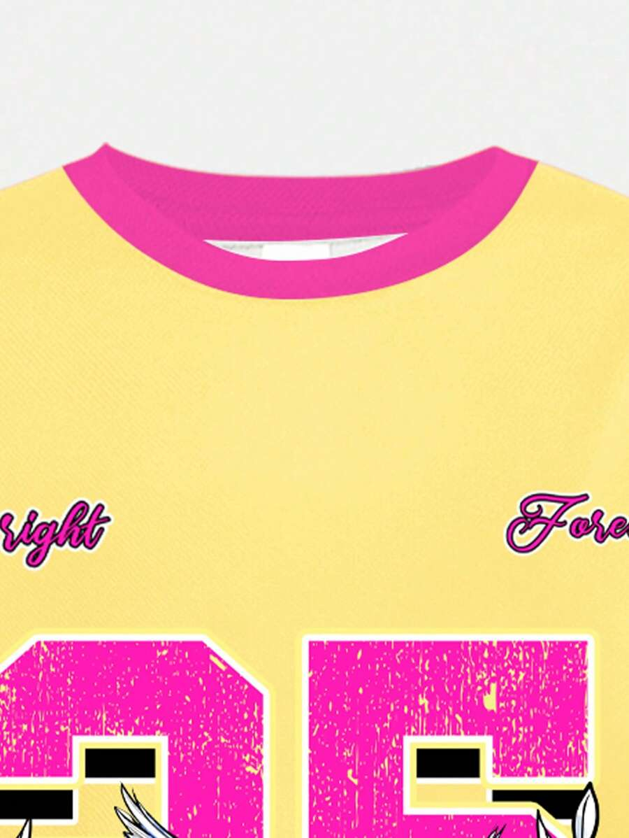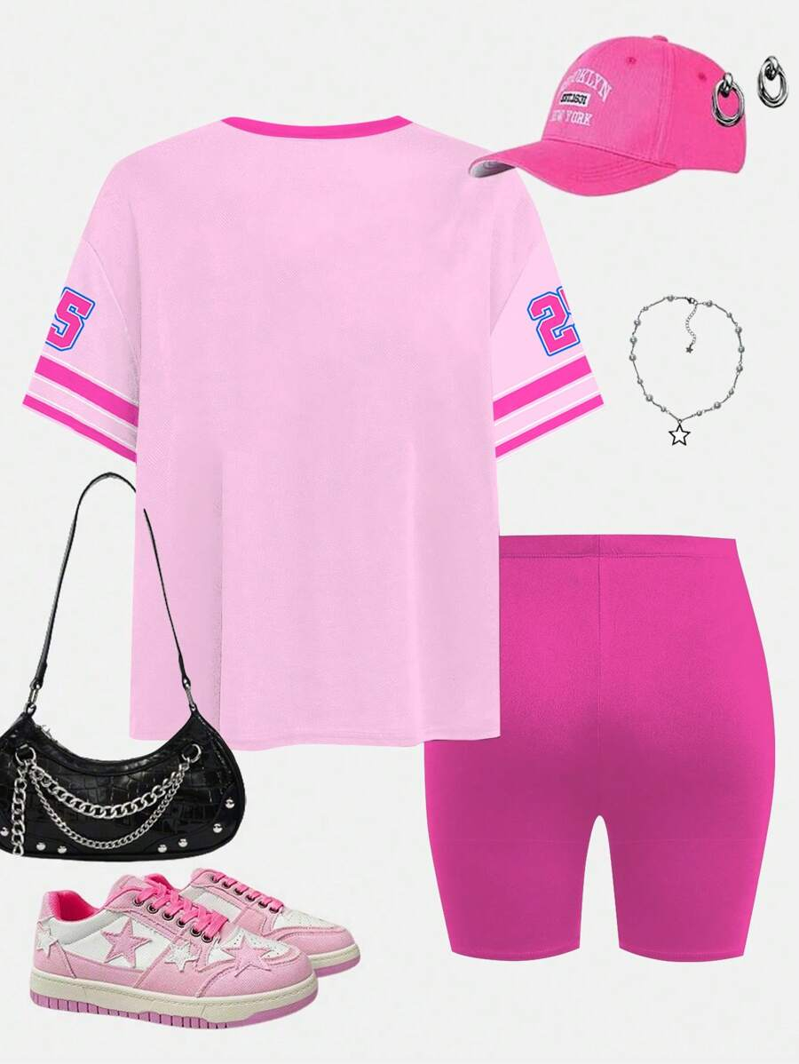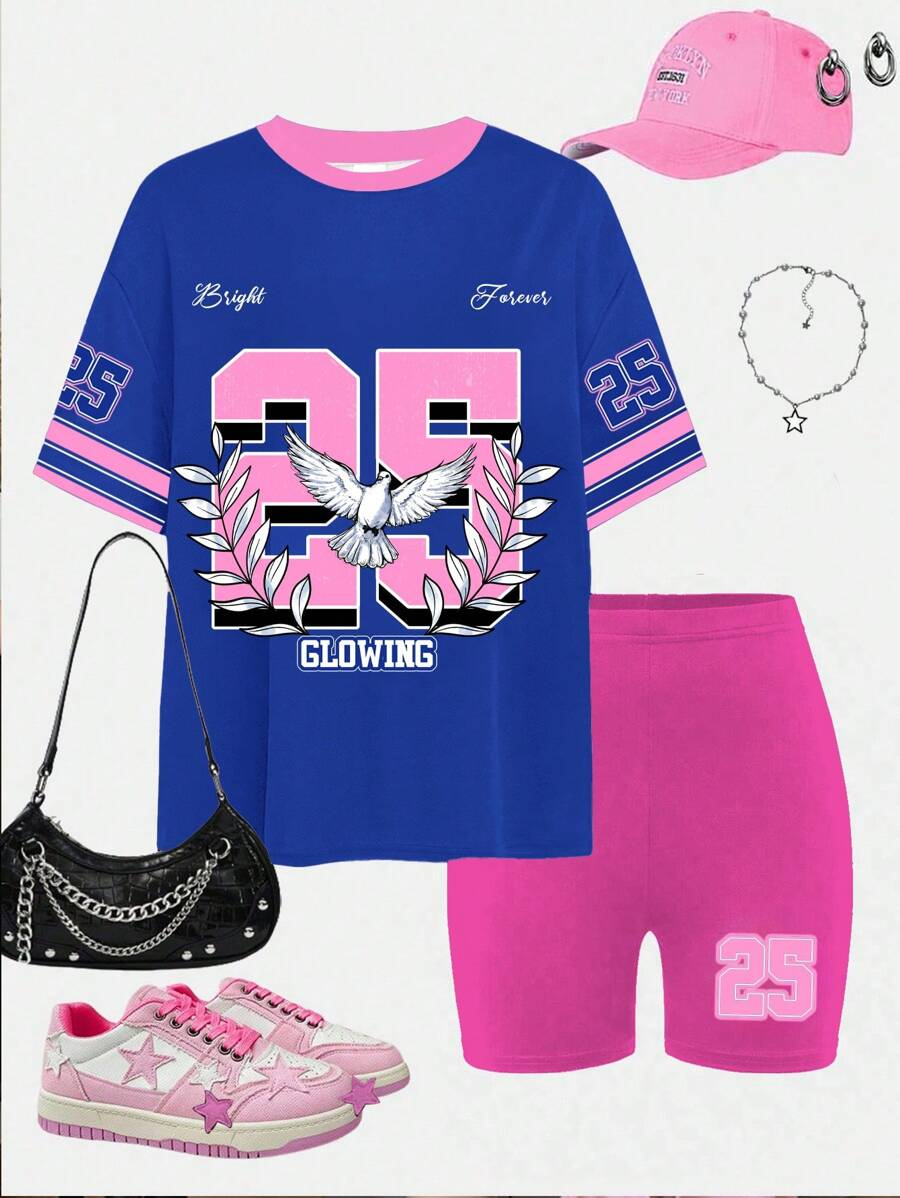 SHEIN 2pcs/Set Young Girl Casual Cute Cartoon Bow Short Sleeve Top And Shorts Set YG00094
