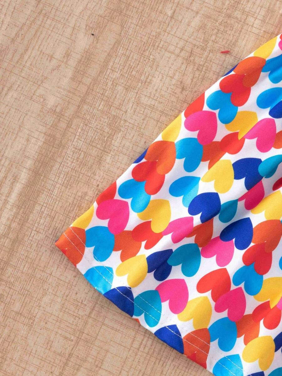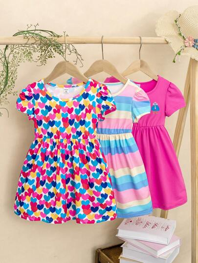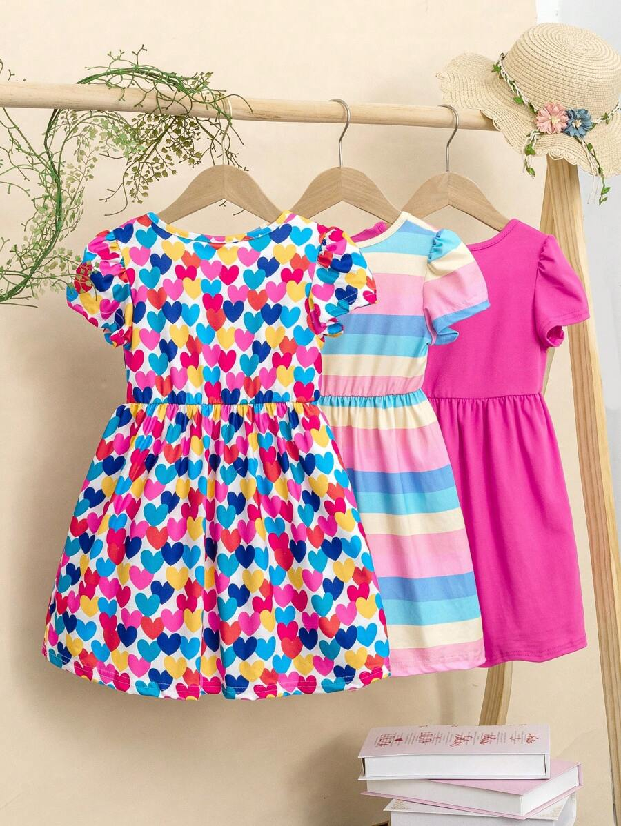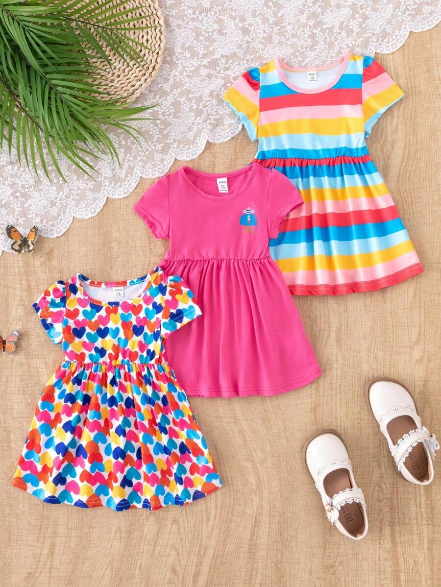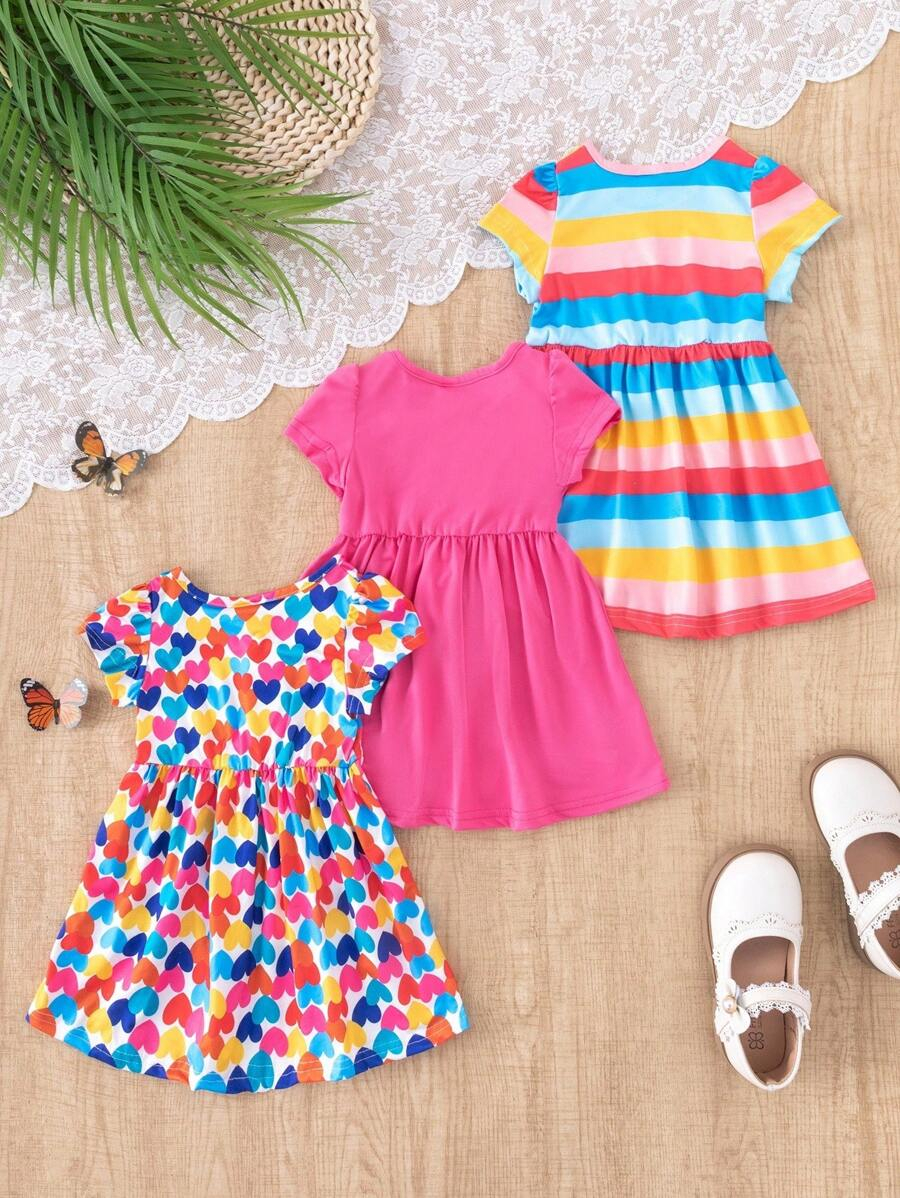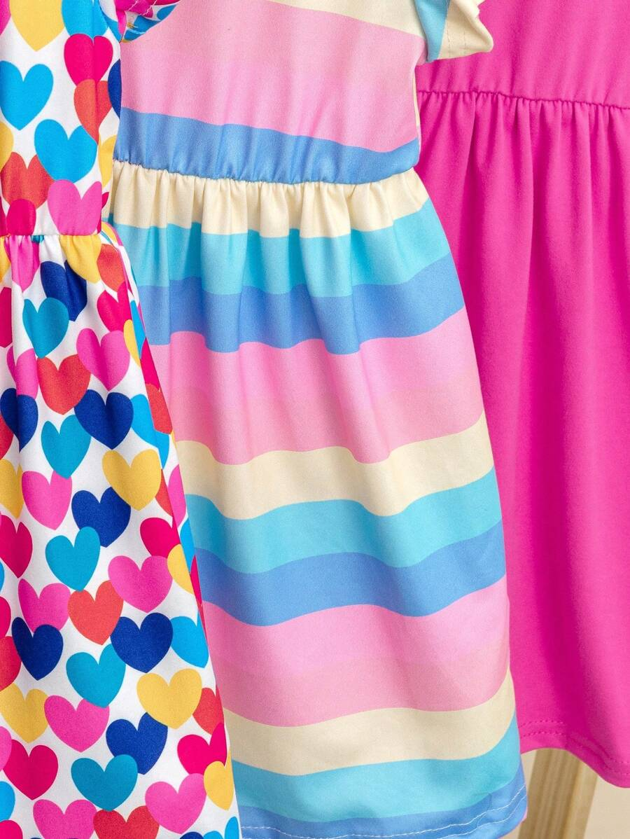 SHEIN 3pcs/Set Baby Girl Casual Colorful Striped Heart BG00100Print Crew Neck Dress With Hat