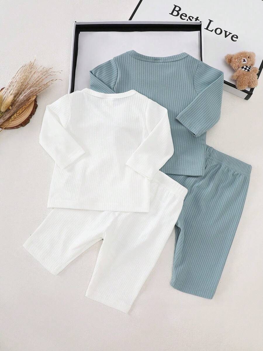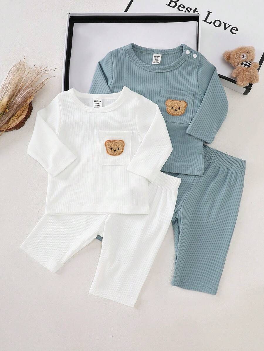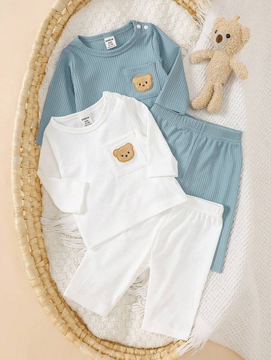 SHEIN 4-Piece/Set Long Sleeved Newborn Baby Boy Unisex Pocket Cartoon Teddy Bear Embroidered Portrait Long Sleeved T-Shirt And Pants Blue&White 2 Sets, Comfortable, Soft, Skin Friendly Elastic Ribbed Knitted Fabric, 0-3 Months Cute Casual Simple White Outfit, Spring And Autumn New Style, Suitable For Home, Vacation, Photography, Baby Boy Clothing NB00006