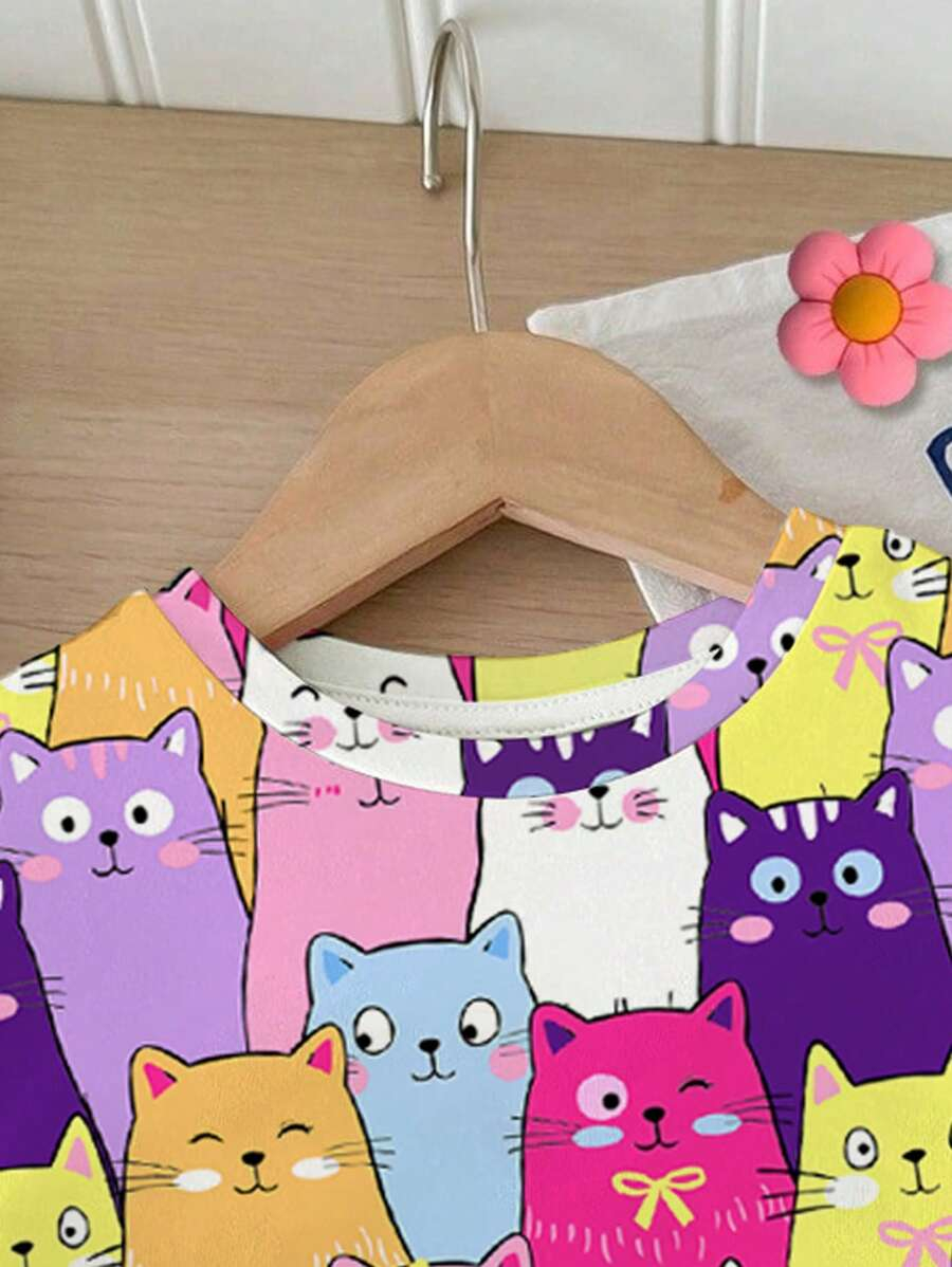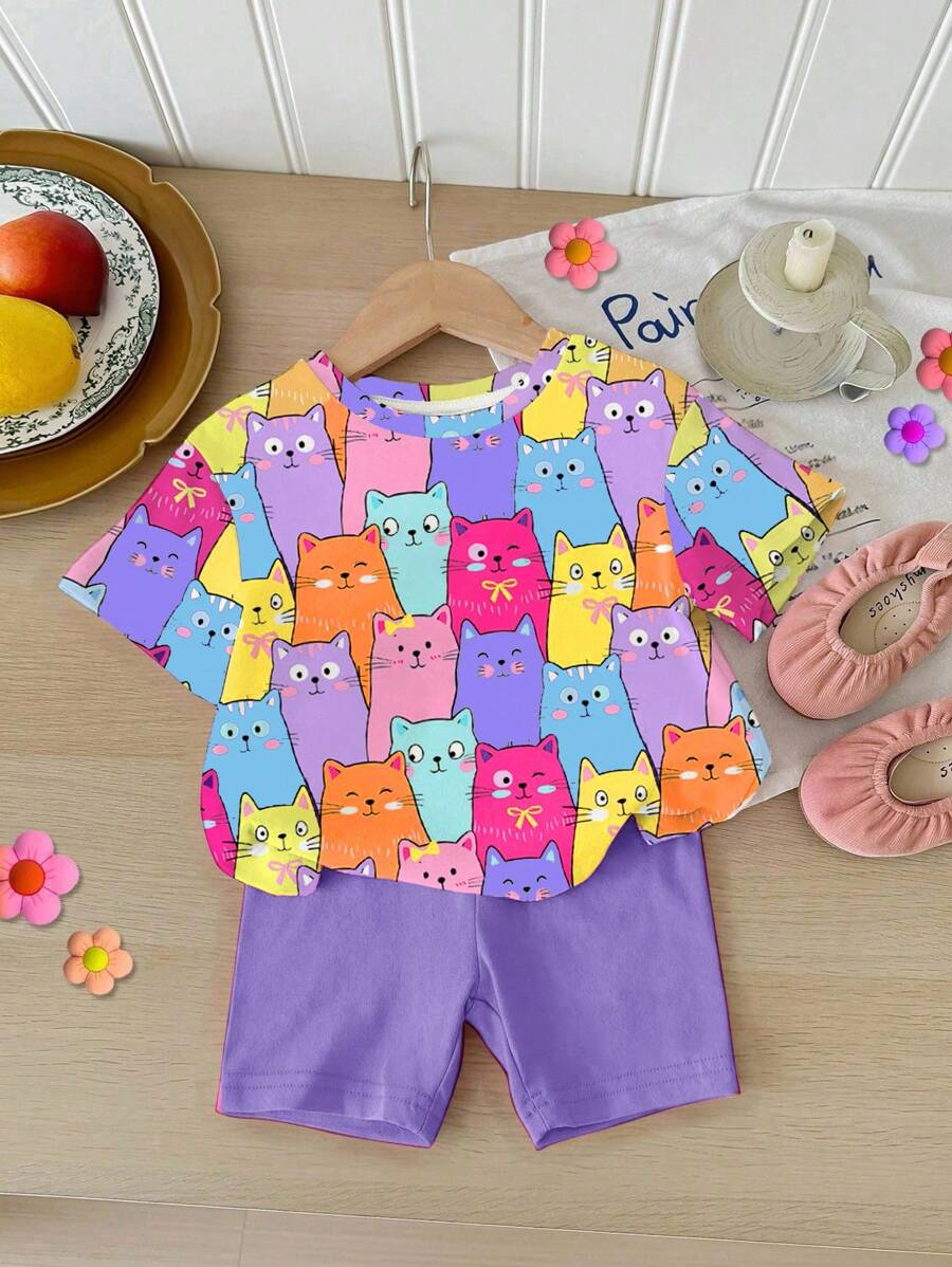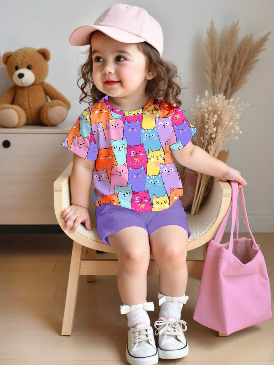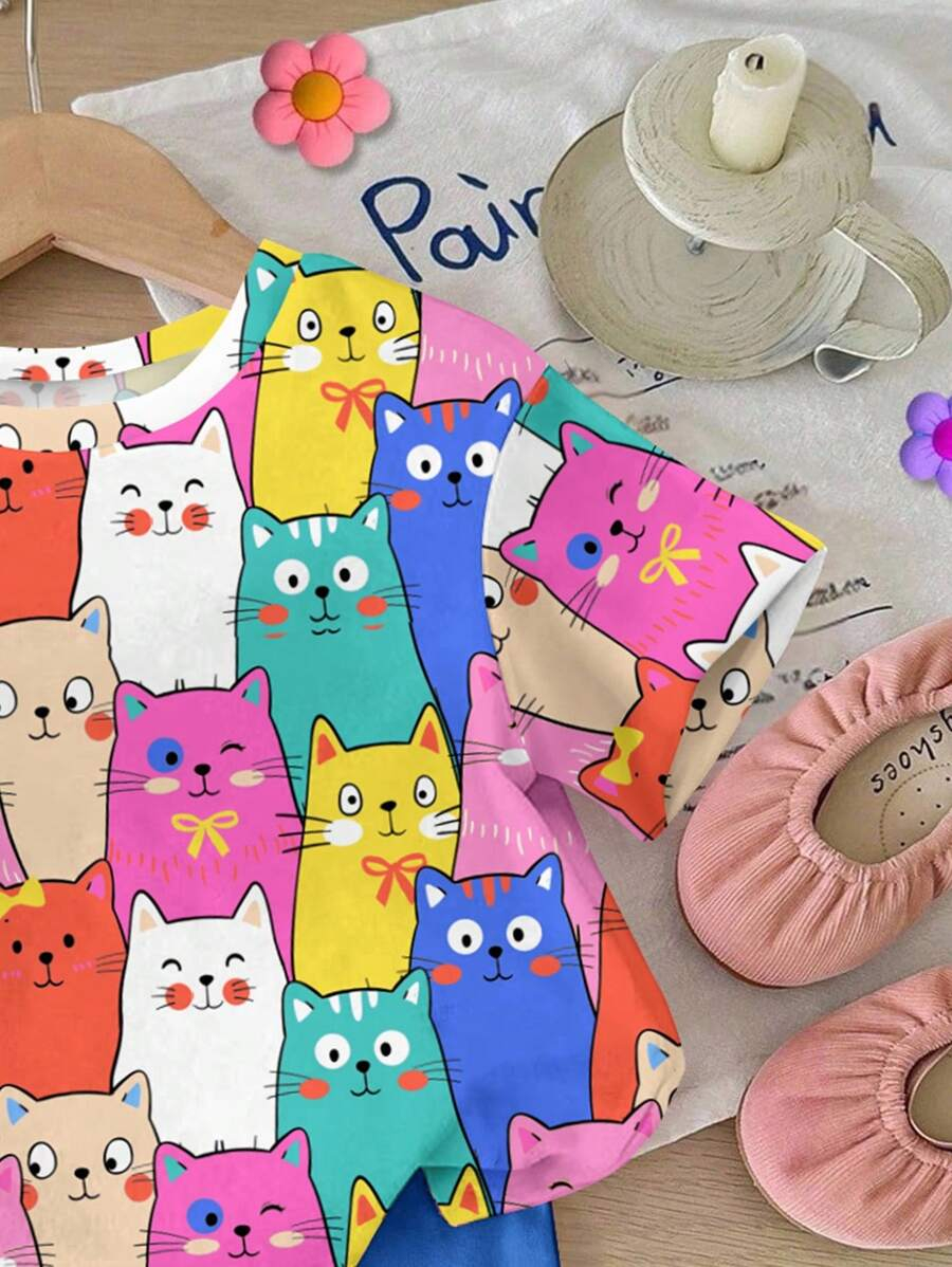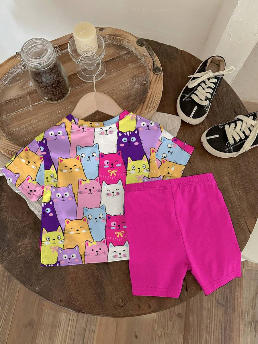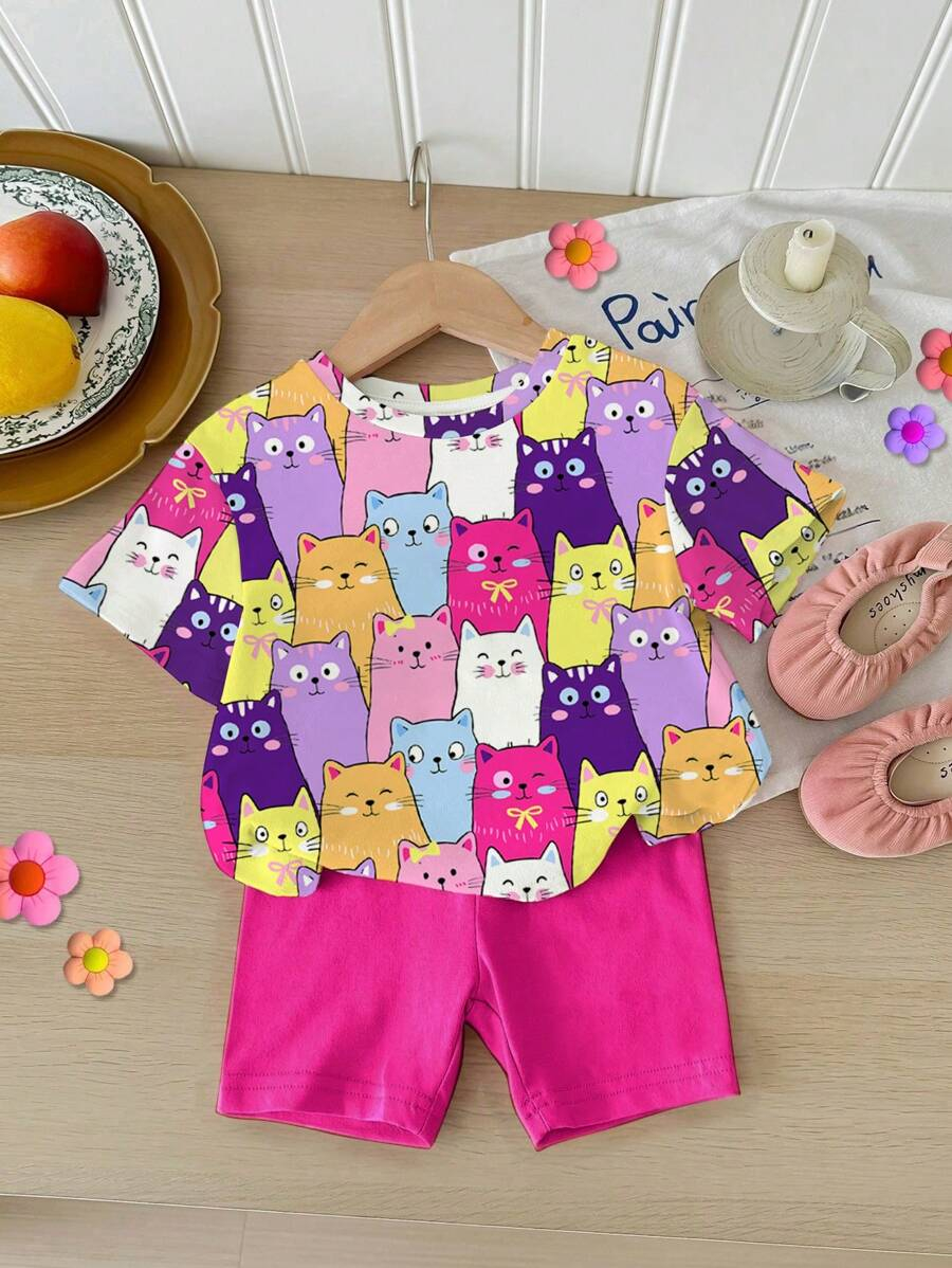 SHEIN Baby Girl Simple Casual Cute Colorful Cat Print Fashionable Round Neck Short Sleeve T-Shirt And Leggings Set, Suitable For Spring/Summer BG00046
