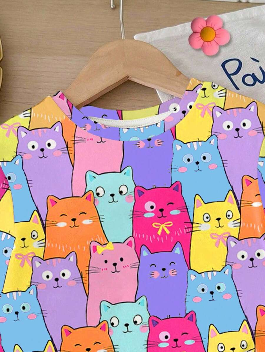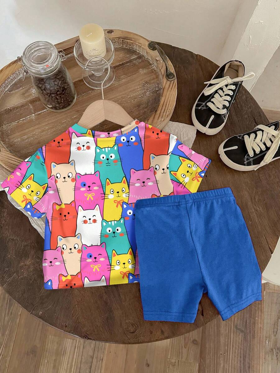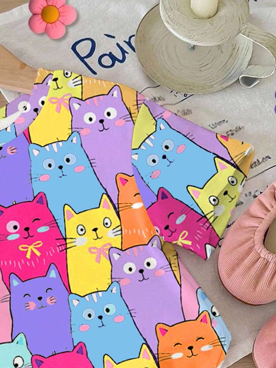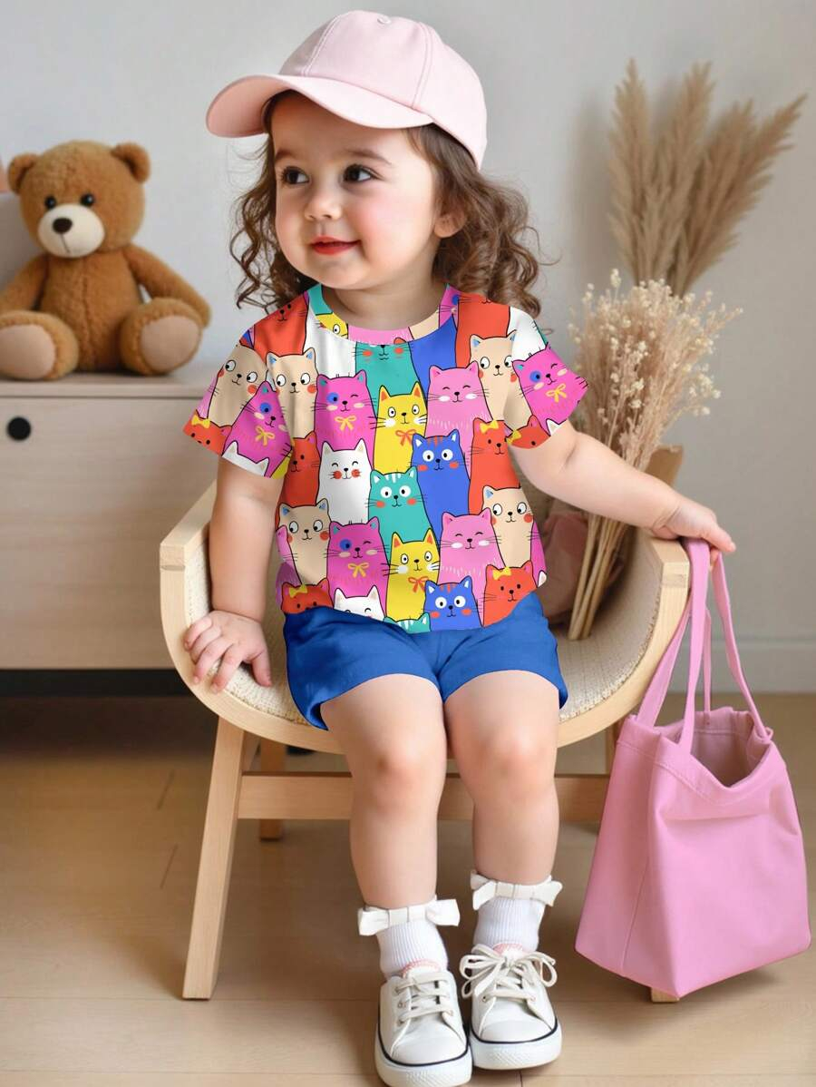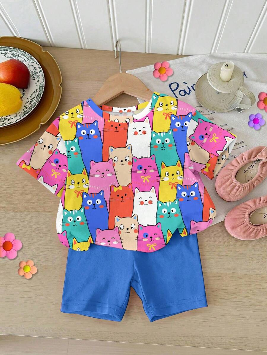 SHEIN Baby Girl Simple Casual Cute Colorful Cat Print Fashionable Round Neck Short Sleeve T-Shirt And Leggings Set, Suitable For Spring/Summer BG00046