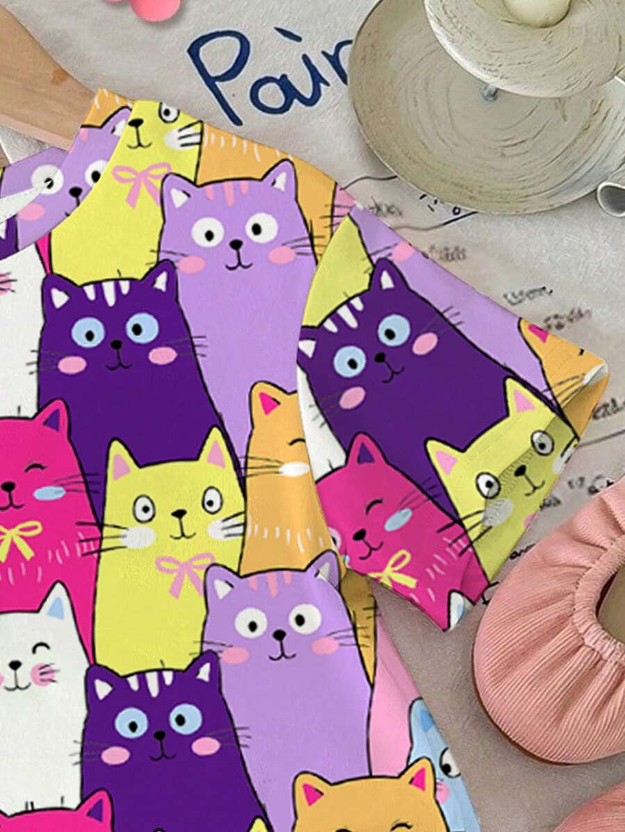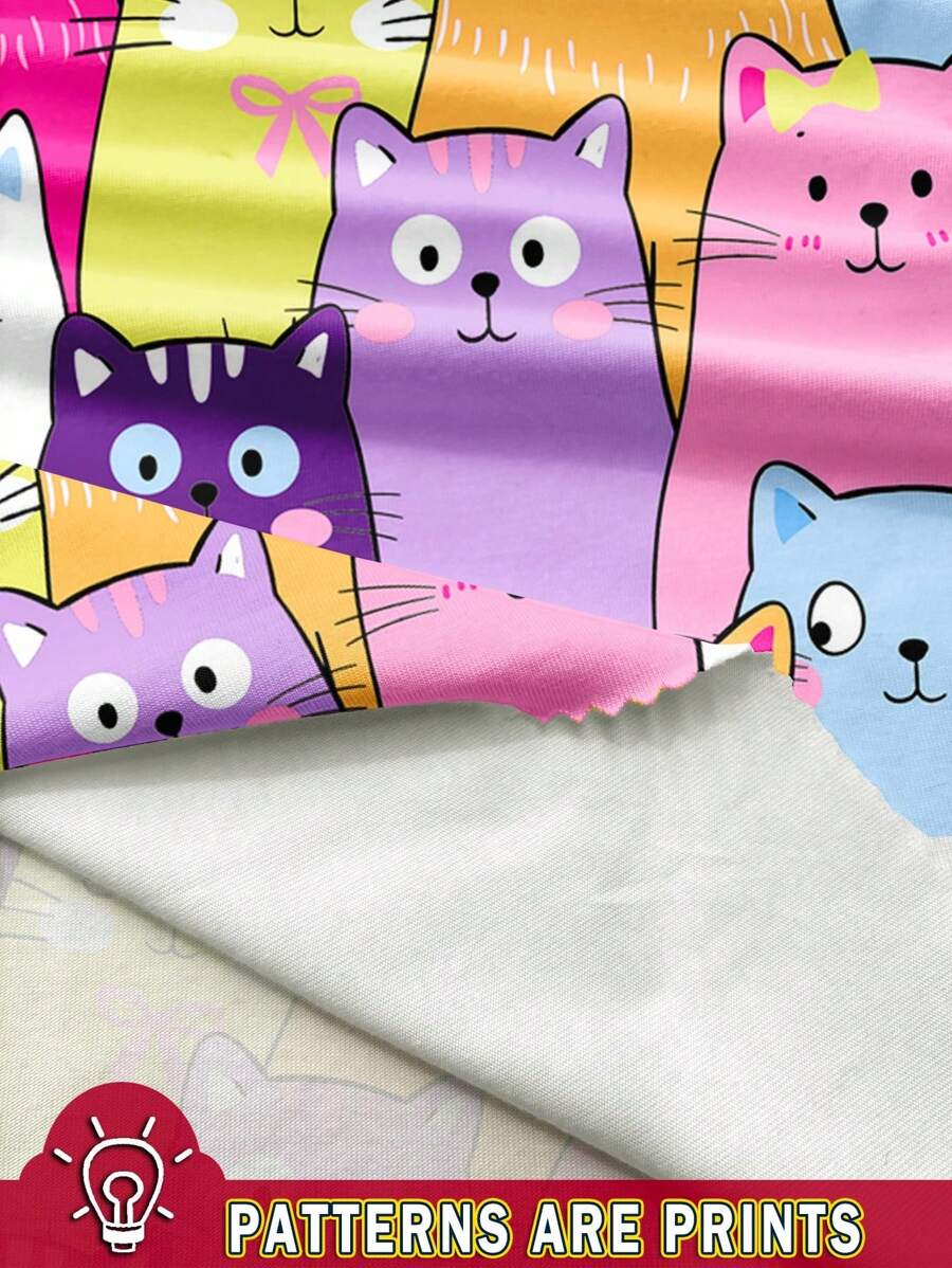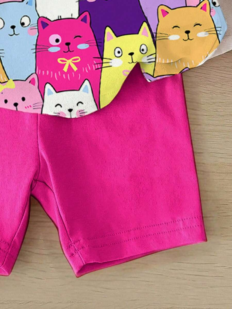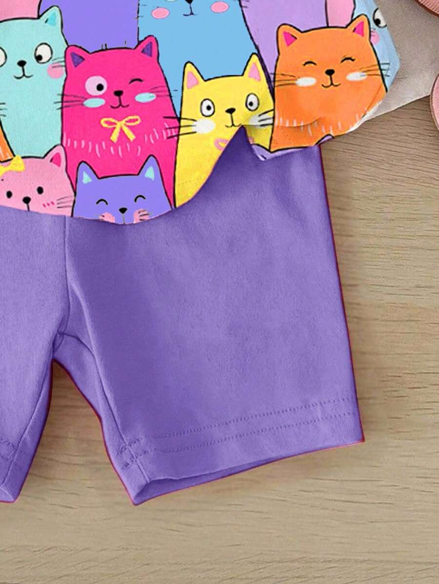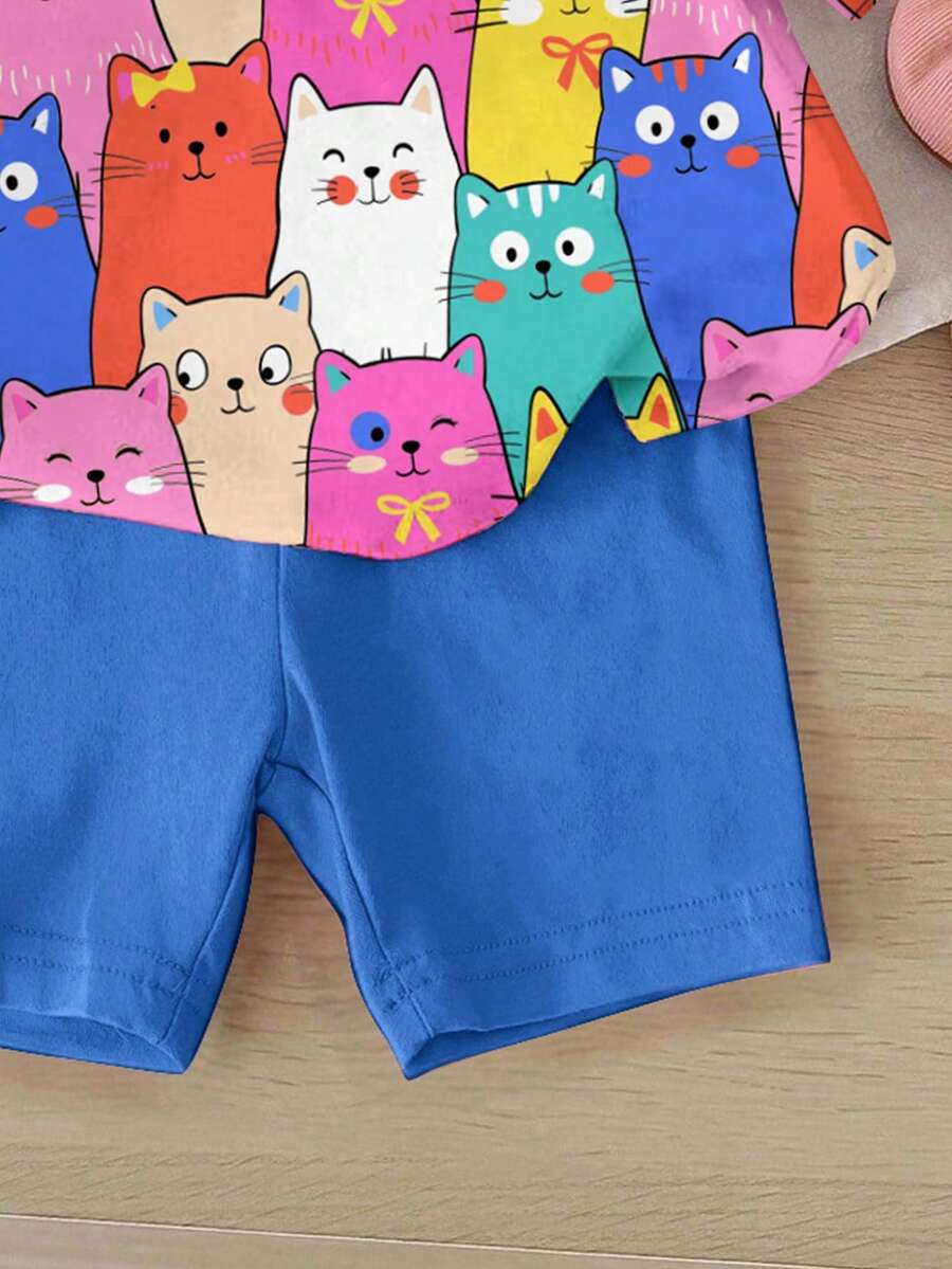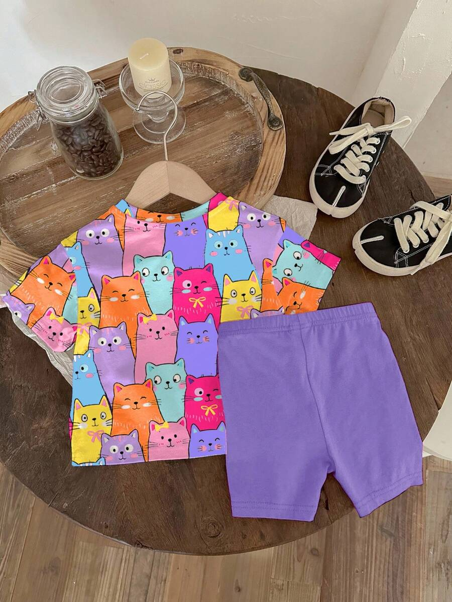 SHEIN Baby Girl Simple Casual Cute Colorful Cat Print Fashionable Round Neck Short Sleeve T-Shirt And Leggings Set, Suitable For Spring/Summer BG00046