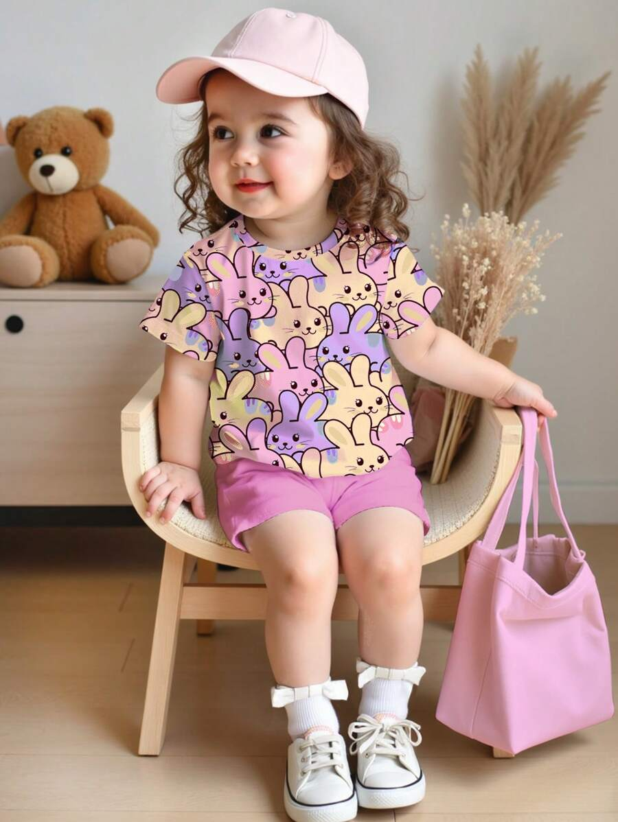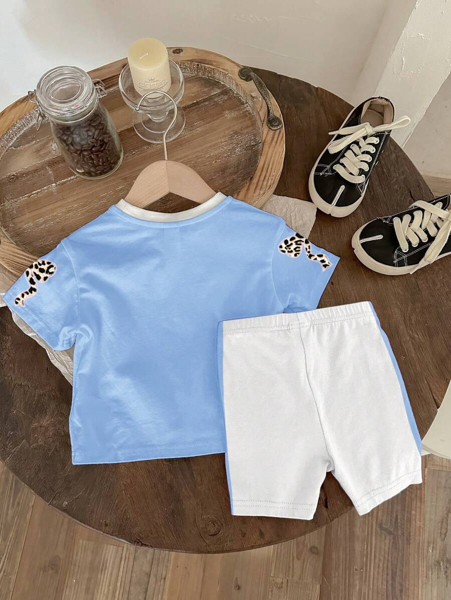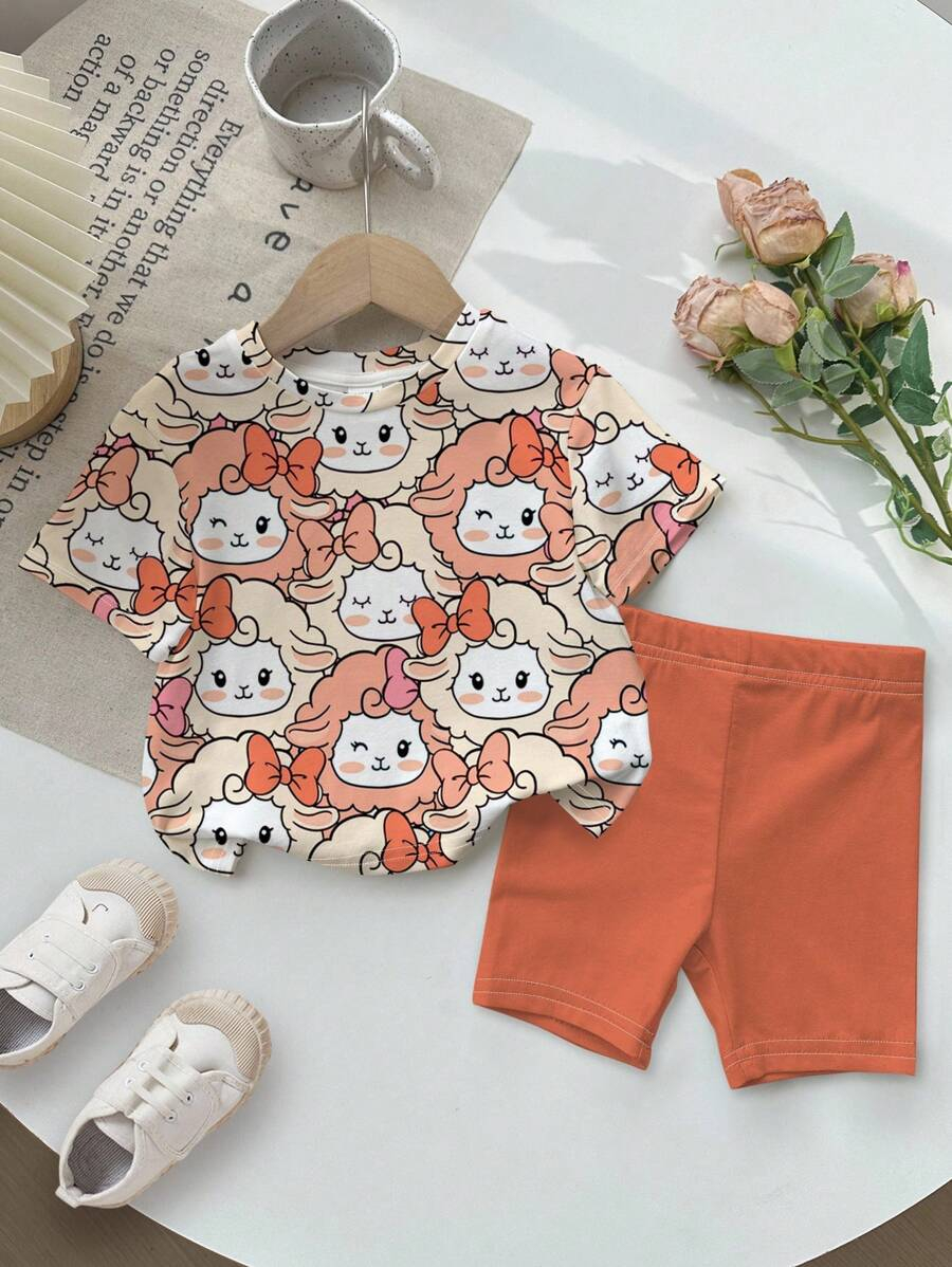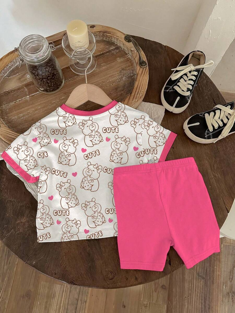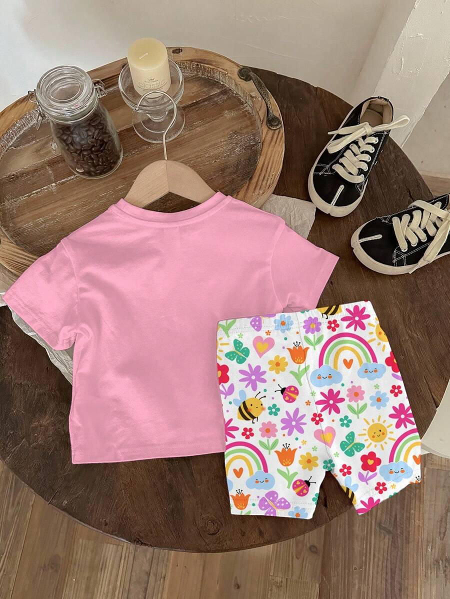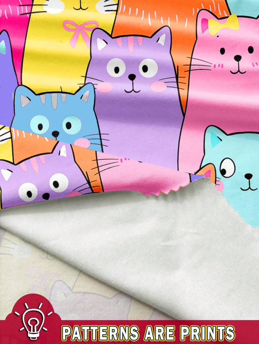 SHEIN Baby Girl Simple Casual Cute Colorful Cat Print Fashionable Round Neck Short Sleeve T-Shirt And Leggings Set, Suitable For Spring/Summer BG00046