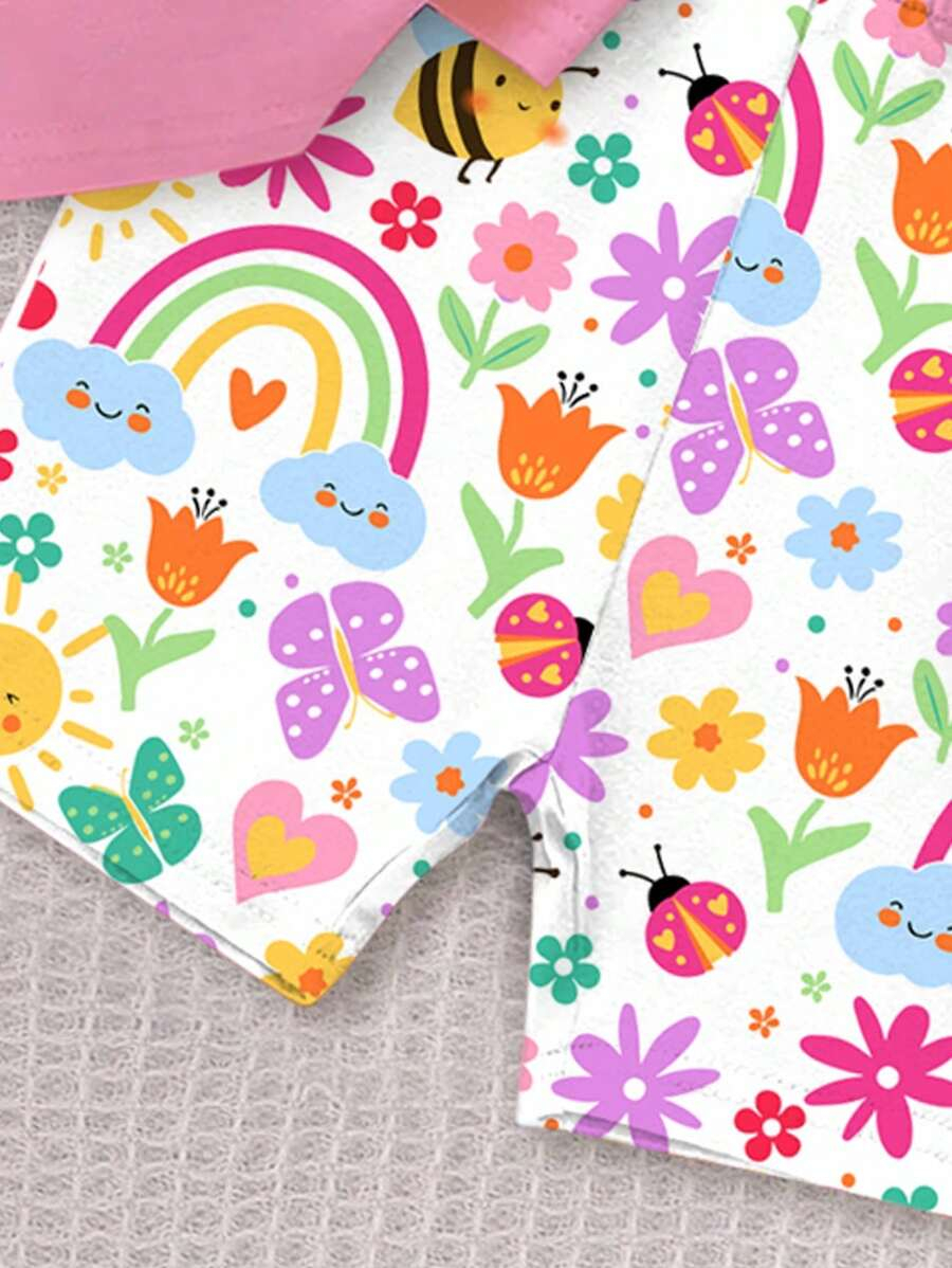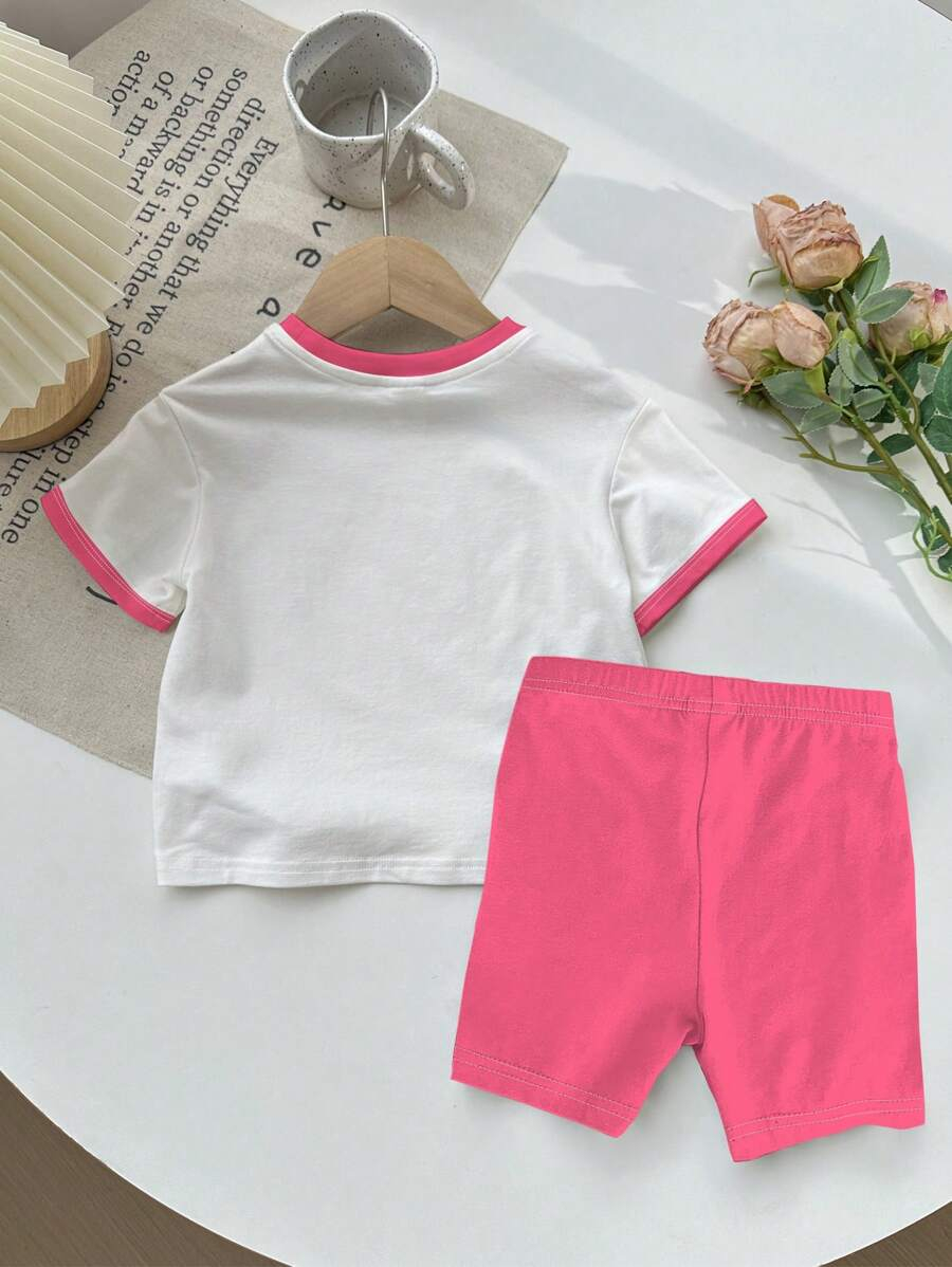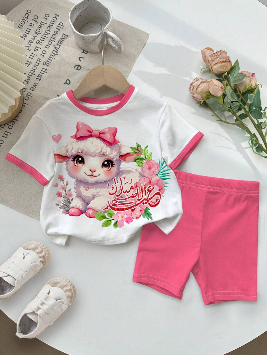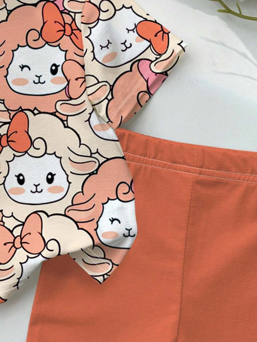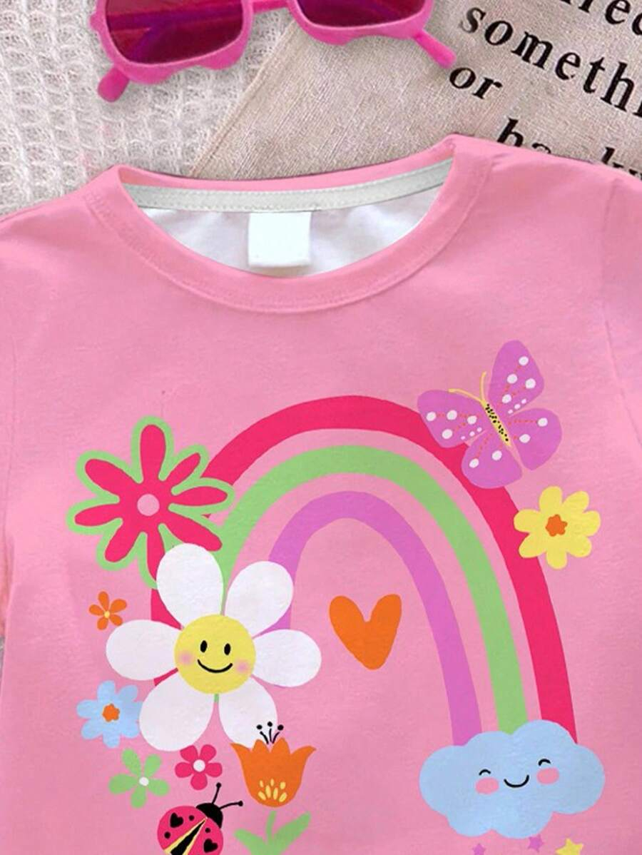 SHEIN Baby Girl Simple Casual Cute Colorful Cat Print Fashionable Round Neck Short Sleeve T-Shirt And Leggings Set, Suitable For Spring/Summer BG00046