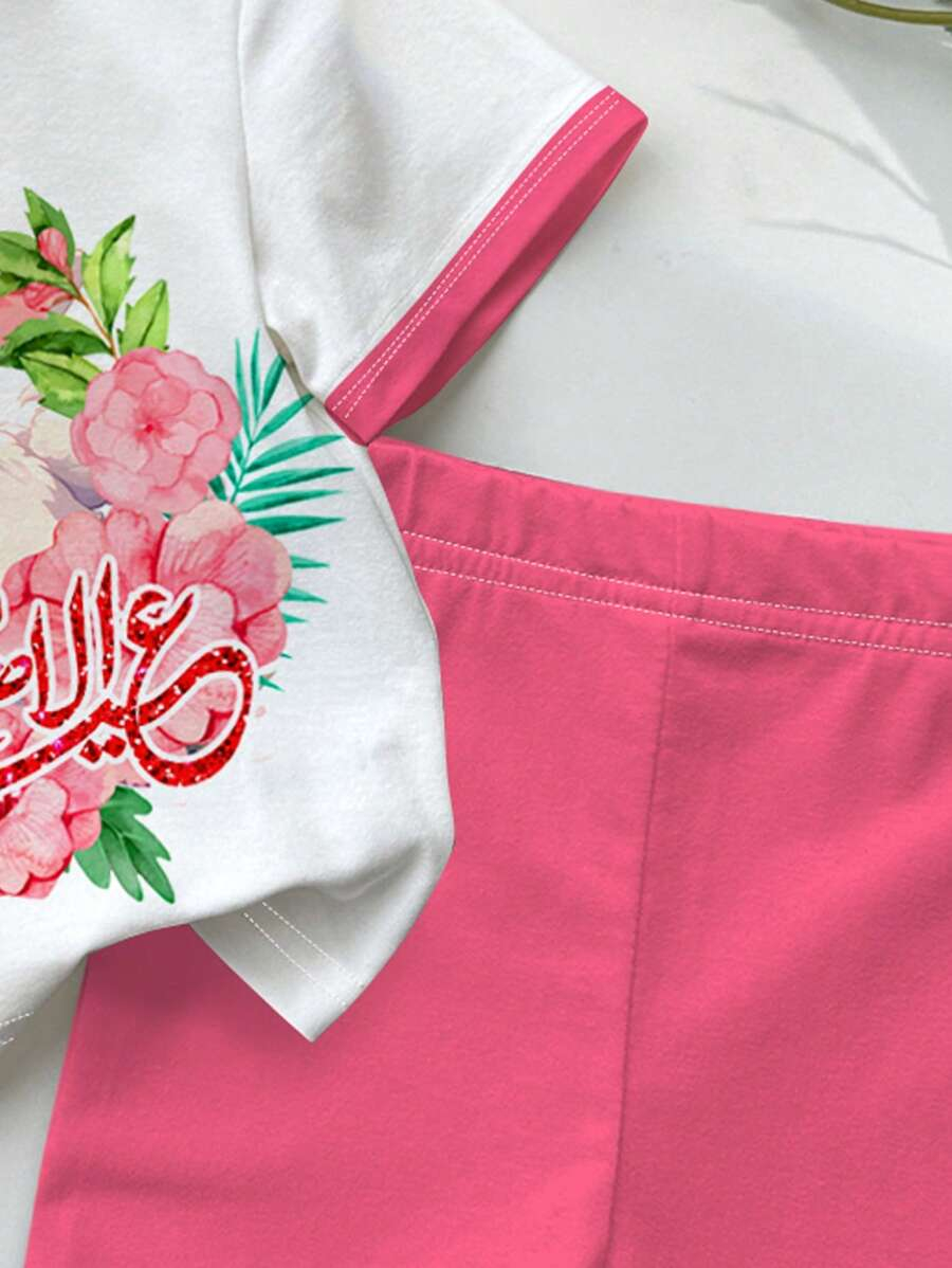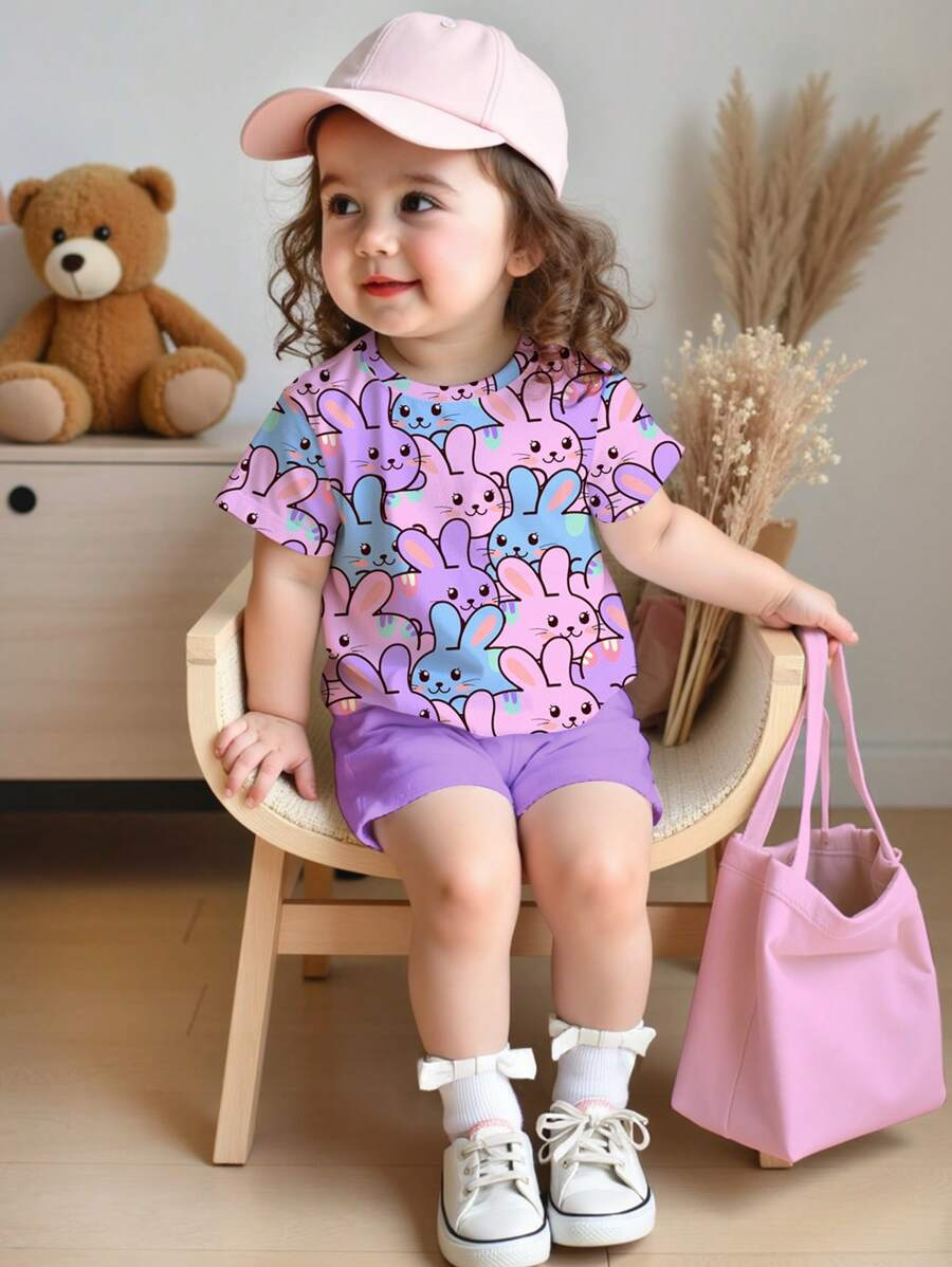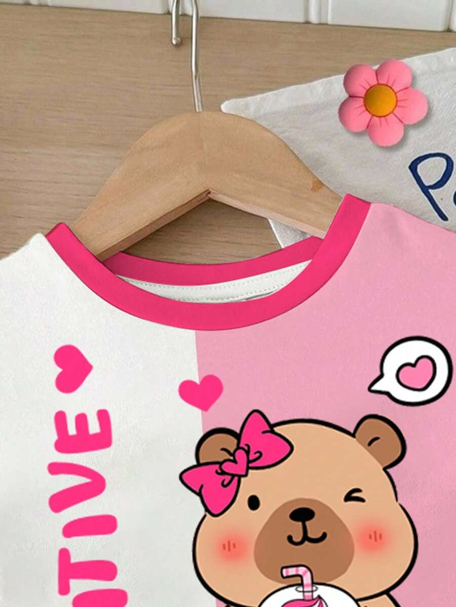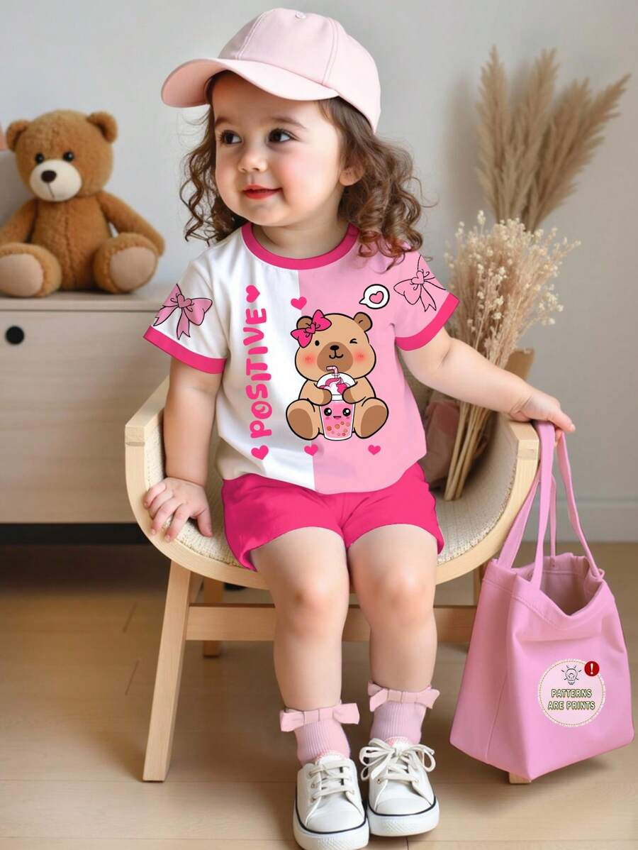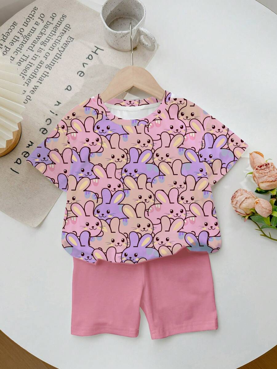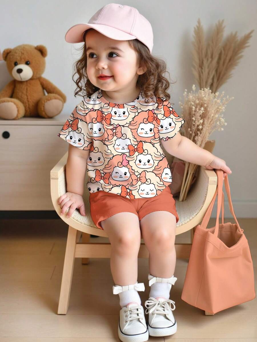 SHEIN Baby Girl Simple Casual Cute Colorful Cat Print Fashionable Round Neck Short Sleeve T-Shirt And Leggings Set, Suitable For Spring/Summer BG00046