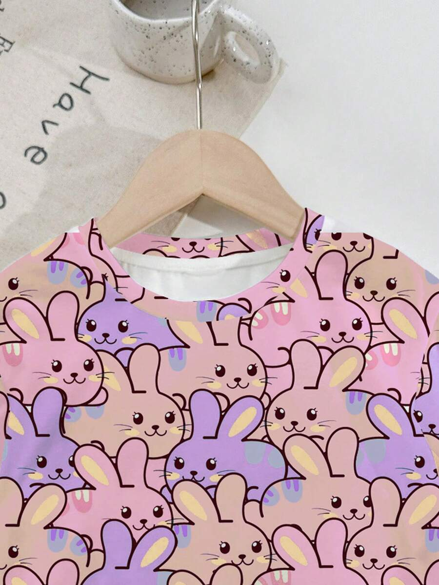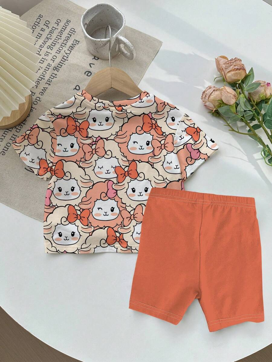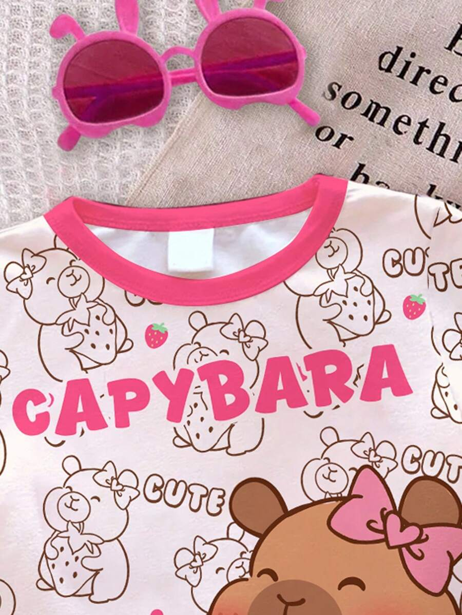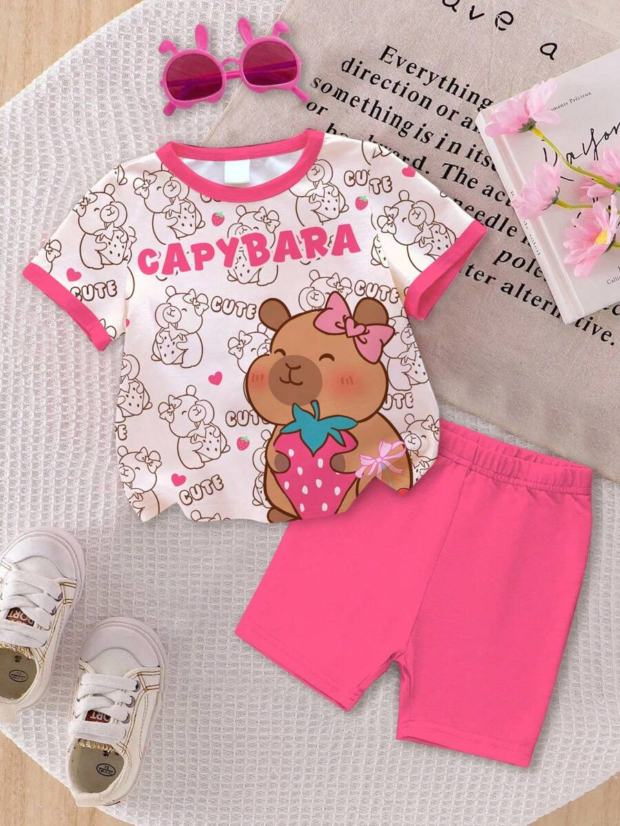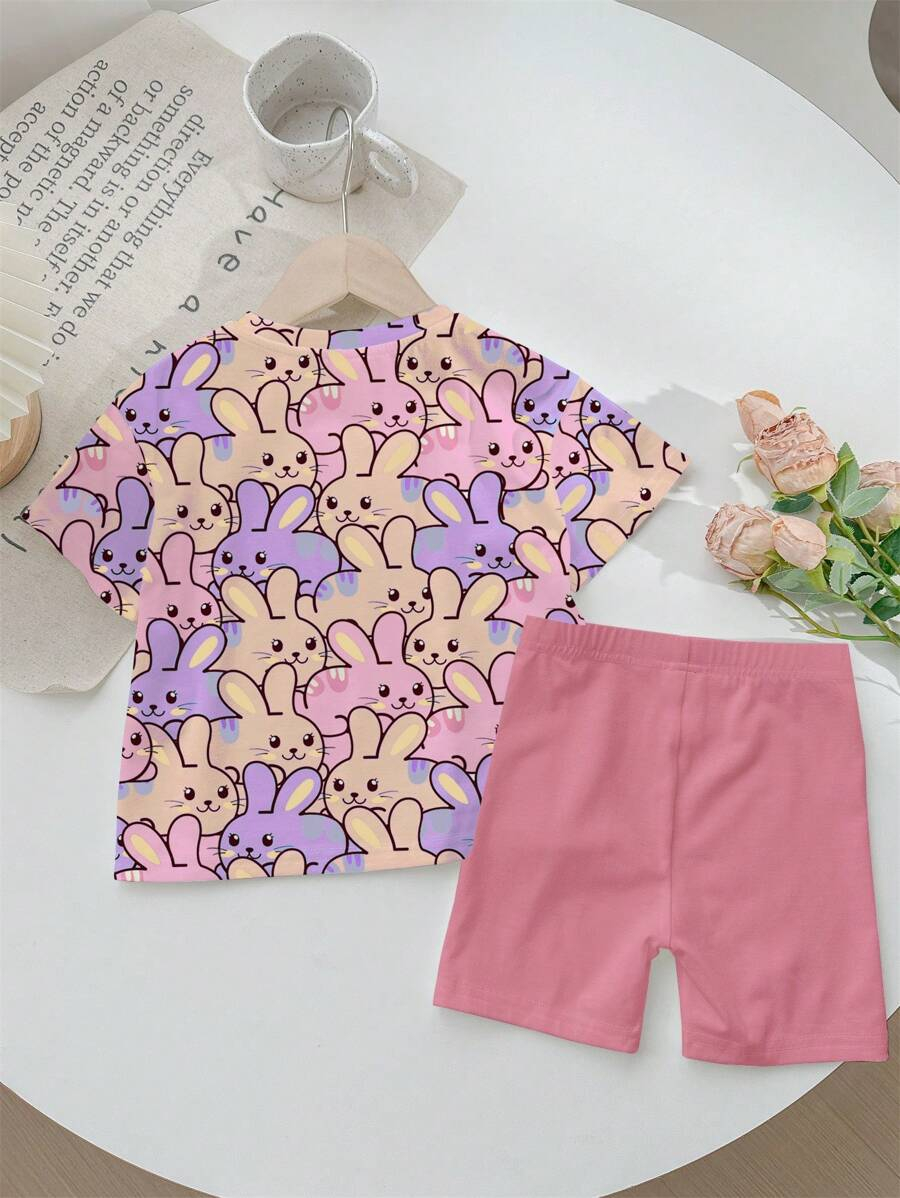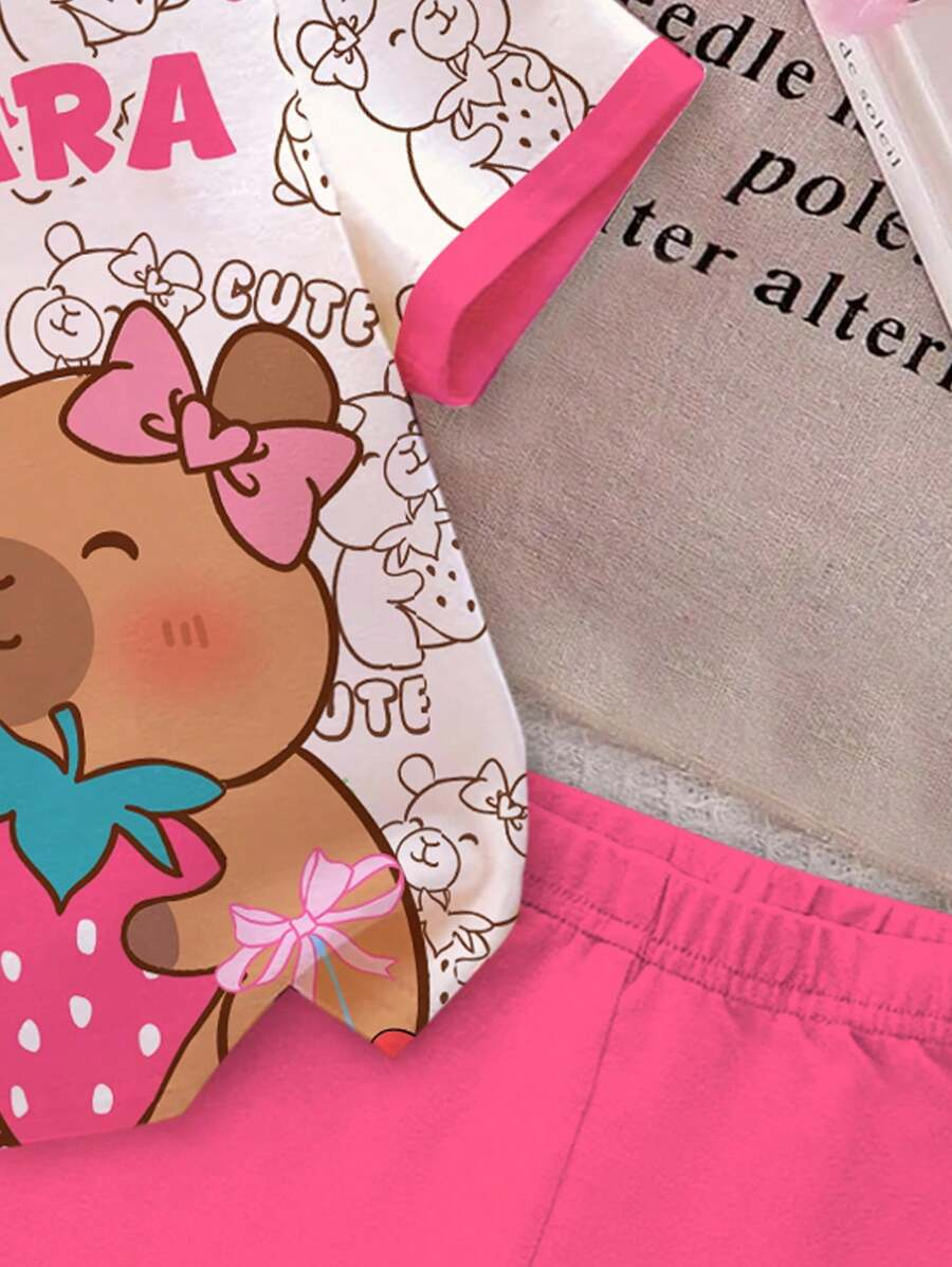 SHEIN Baby Girl Simple Casual Cute Colorful Cat Print Fashionable Round Neck Short Sleeve T-Shirt And Leggings Set, Suitable For Spring/Summer BG00046