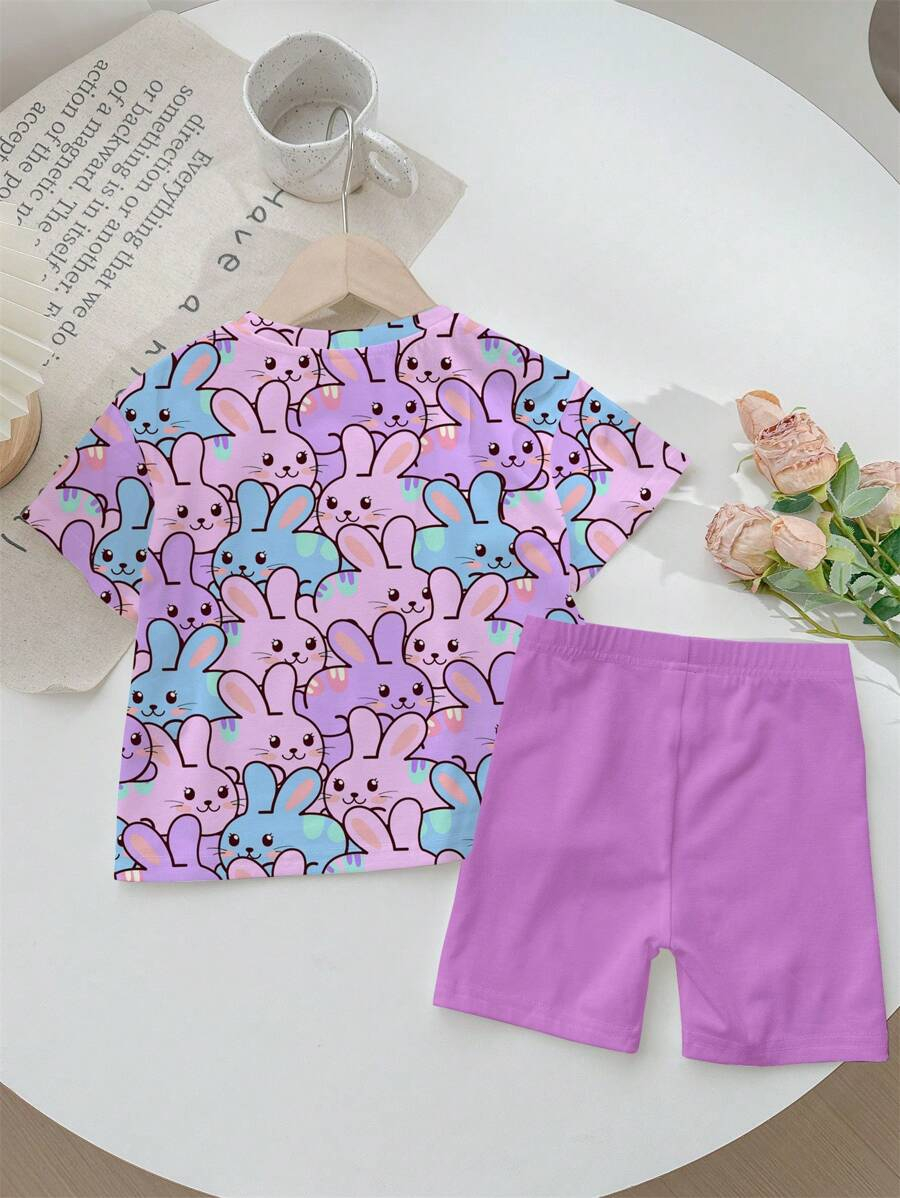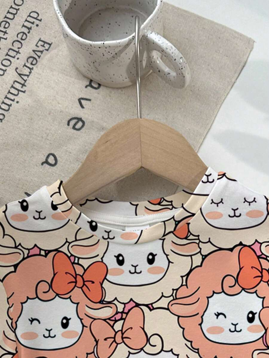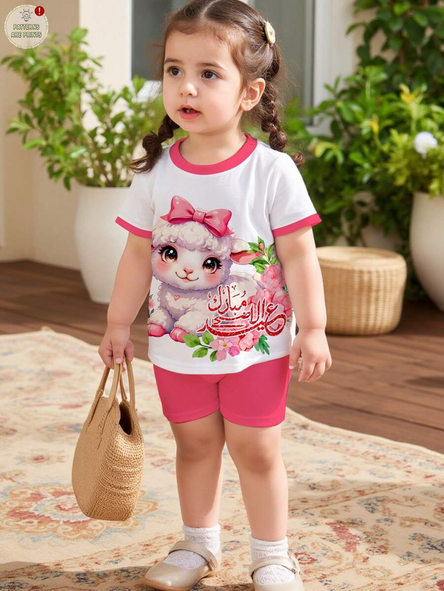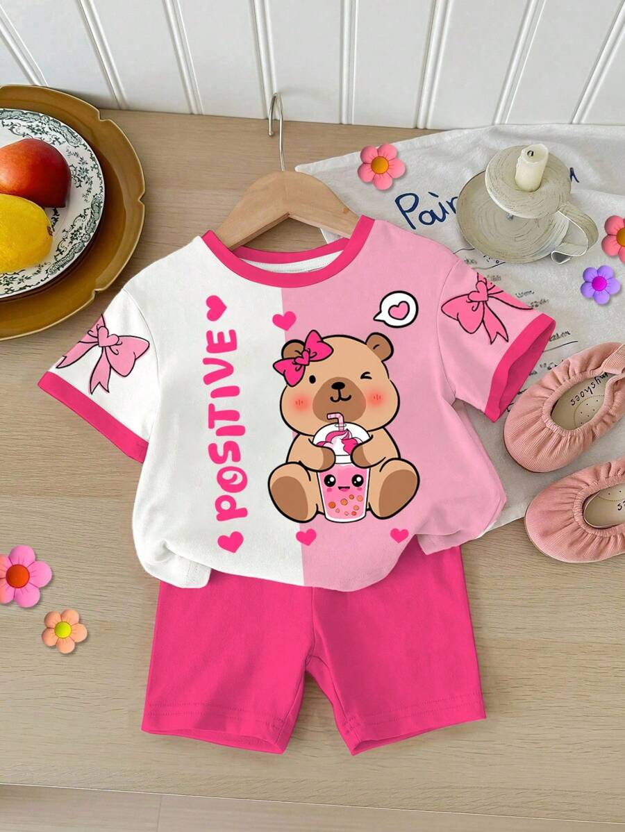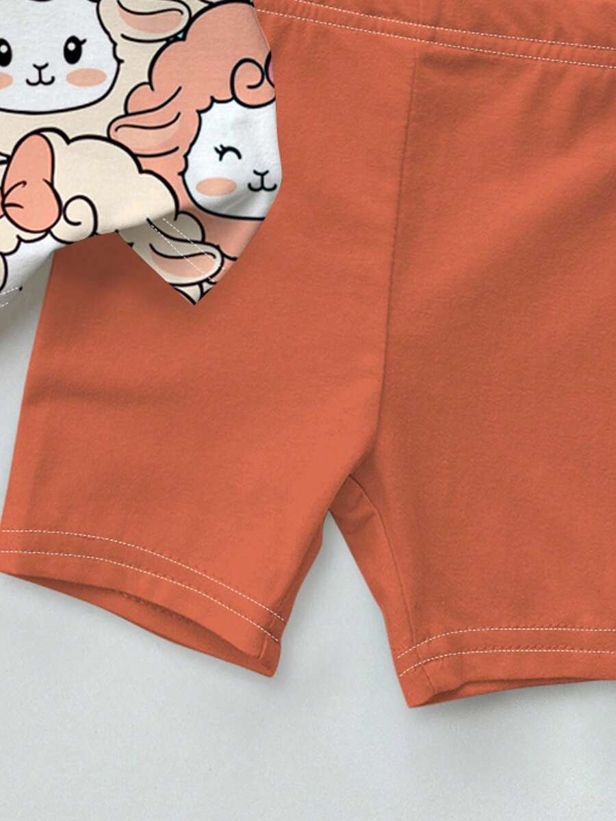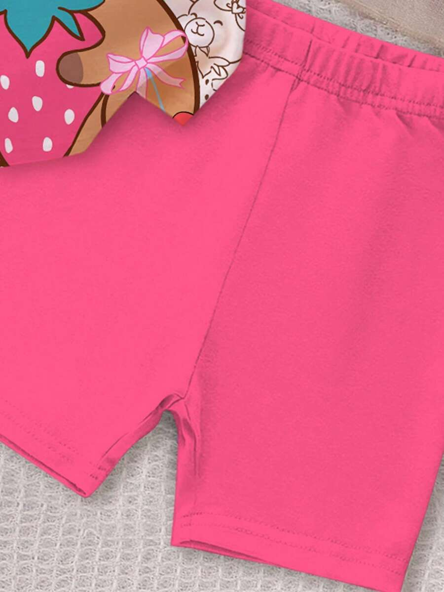 SHEIN Baby Girl Simple Casual Cute Colorful Cat Print Fashionable Round Neck Short Sleeve T-Shirt And Leggings Set, Suitable For Spring/Summer BG00046