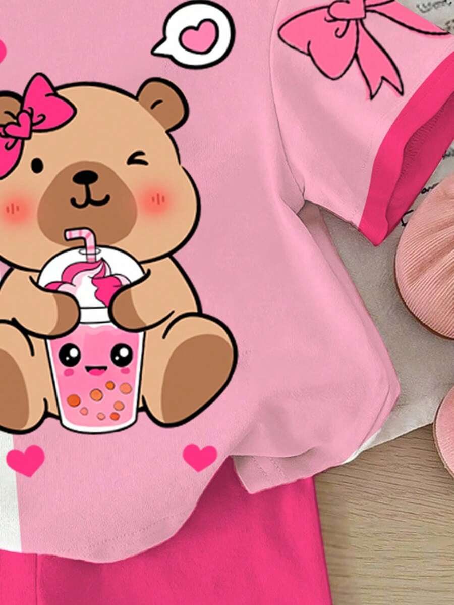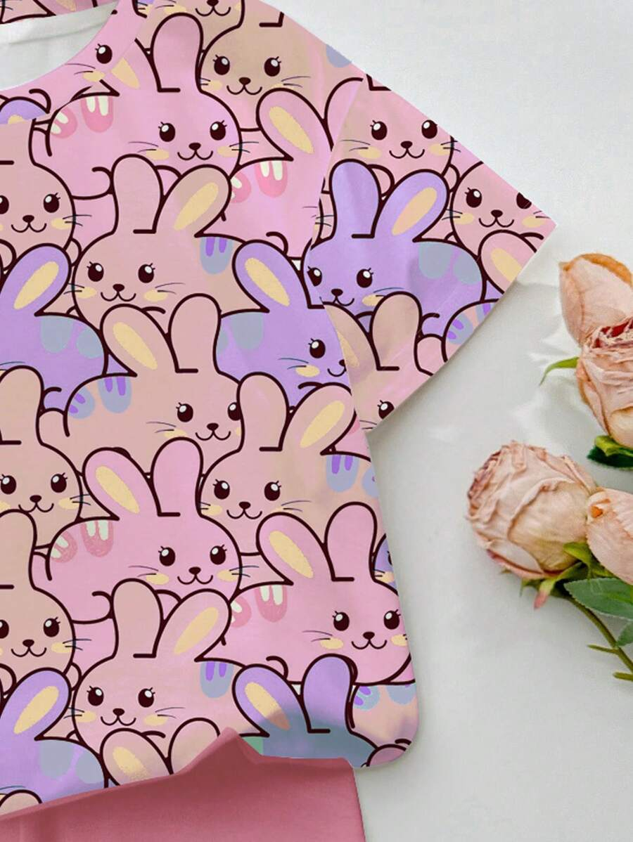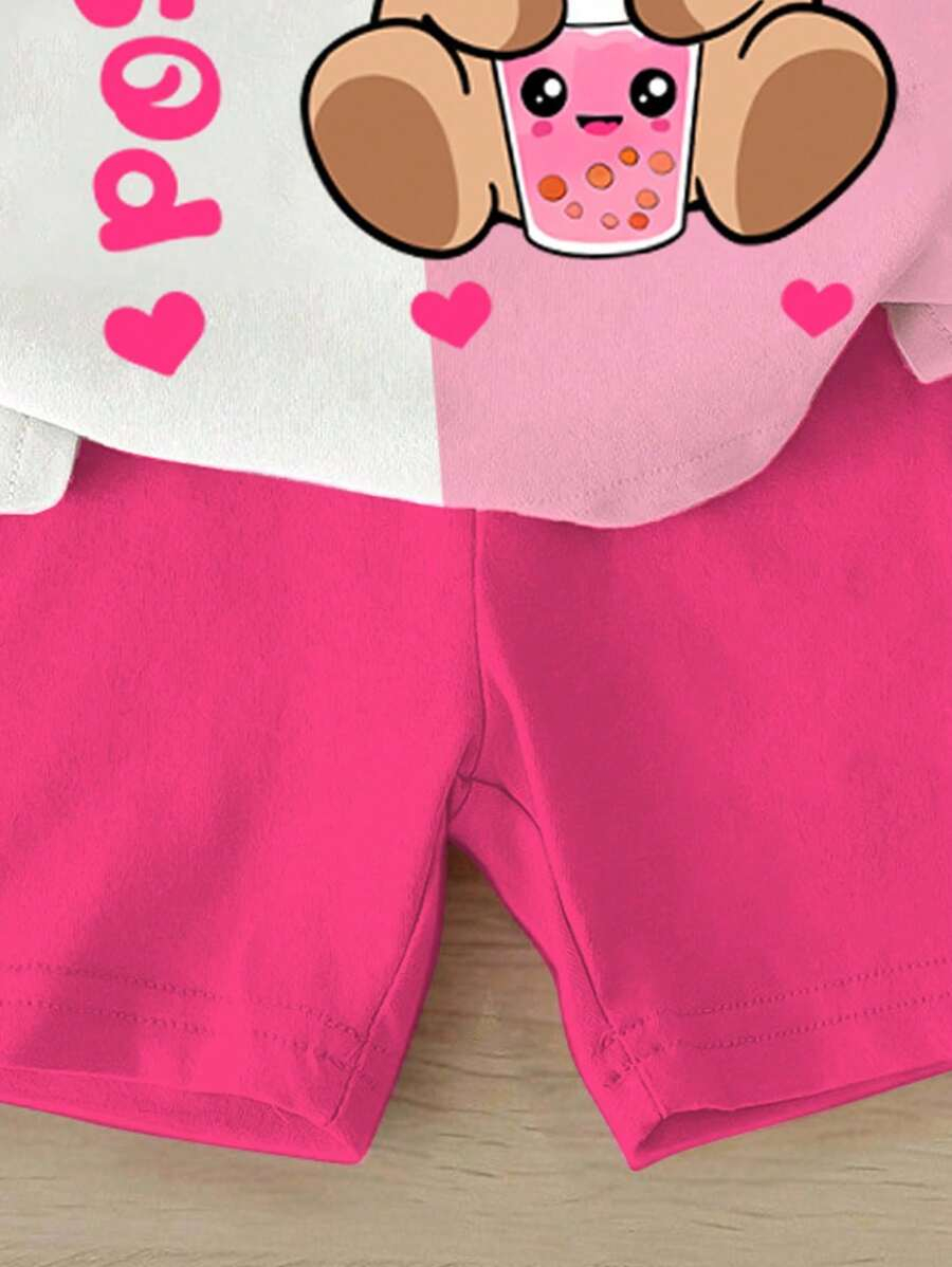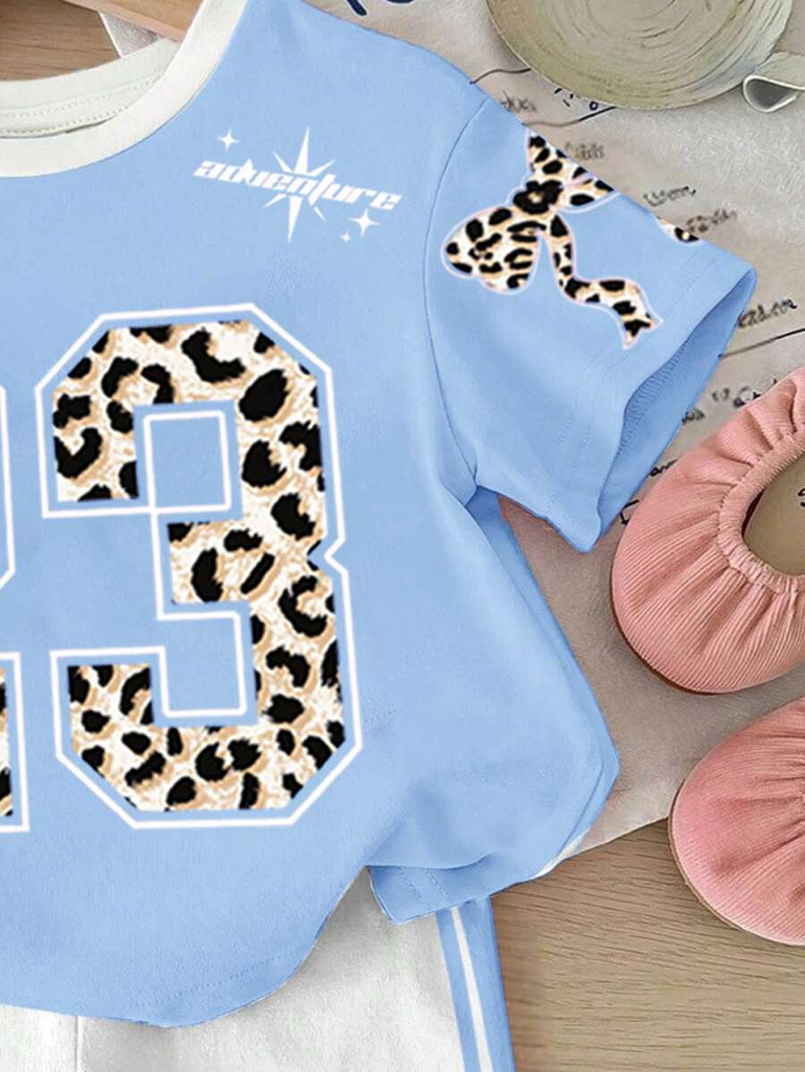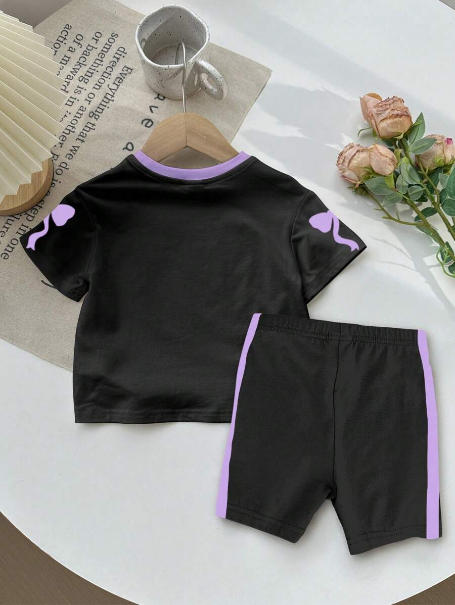 SHEIN Baby Girl Simple Casual Cute Colorful Cat Print Fashionable Round Neck Short Sleeve T-Shirt And Leggings Set, Suitable For Spring/Summer BG00046