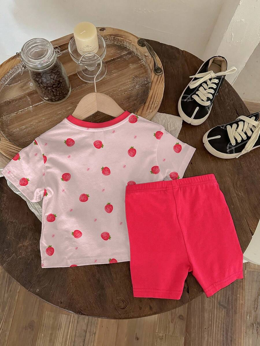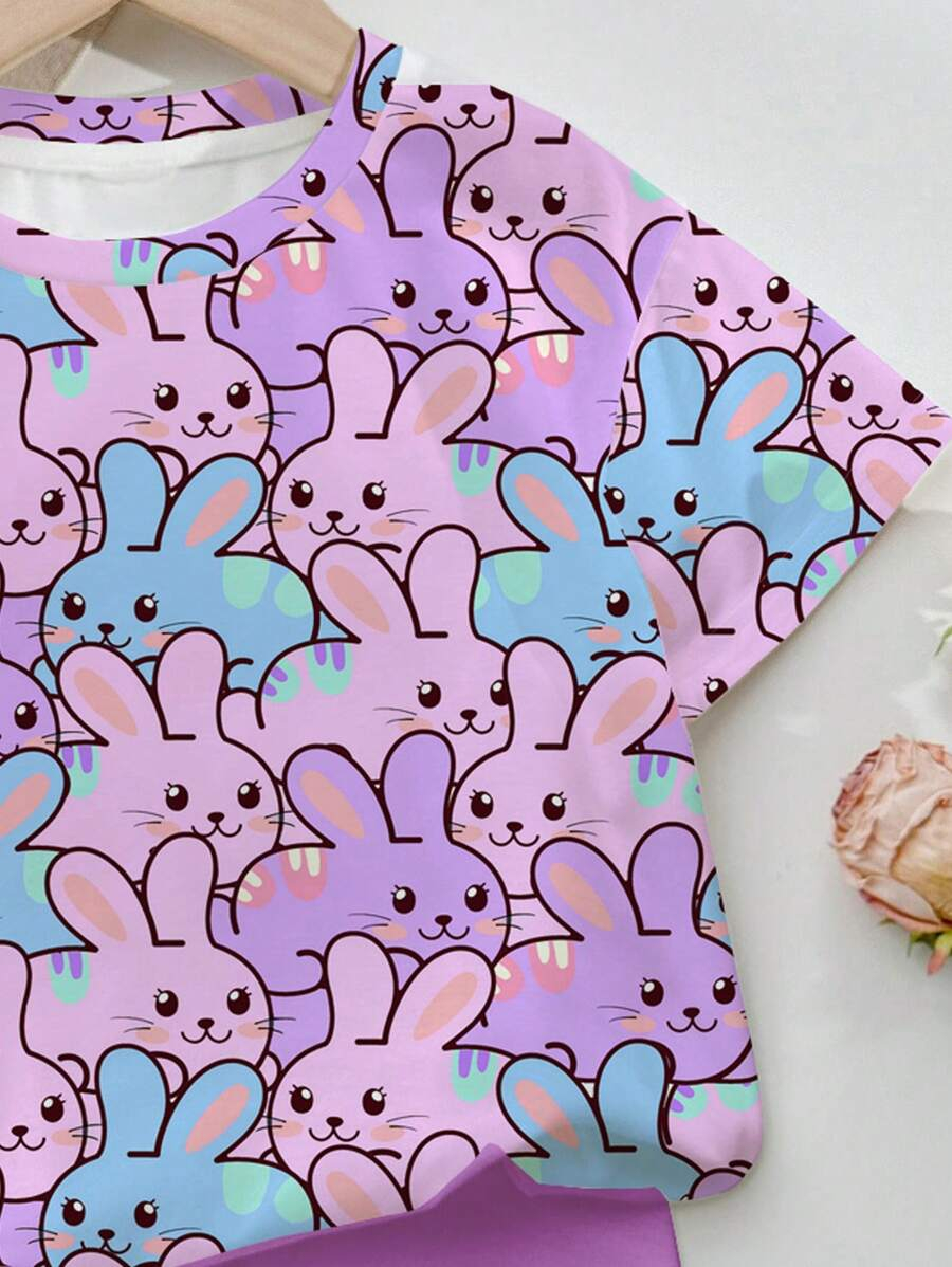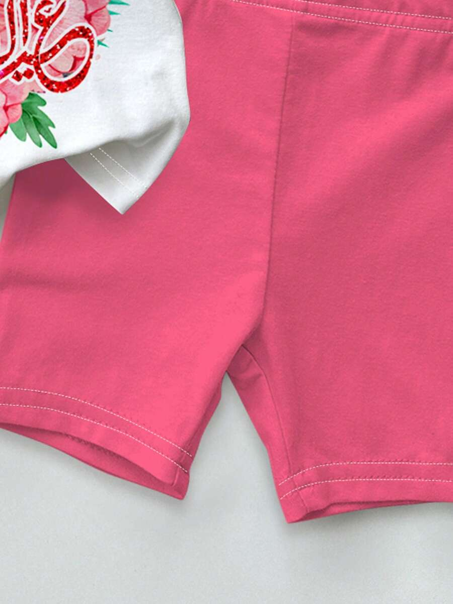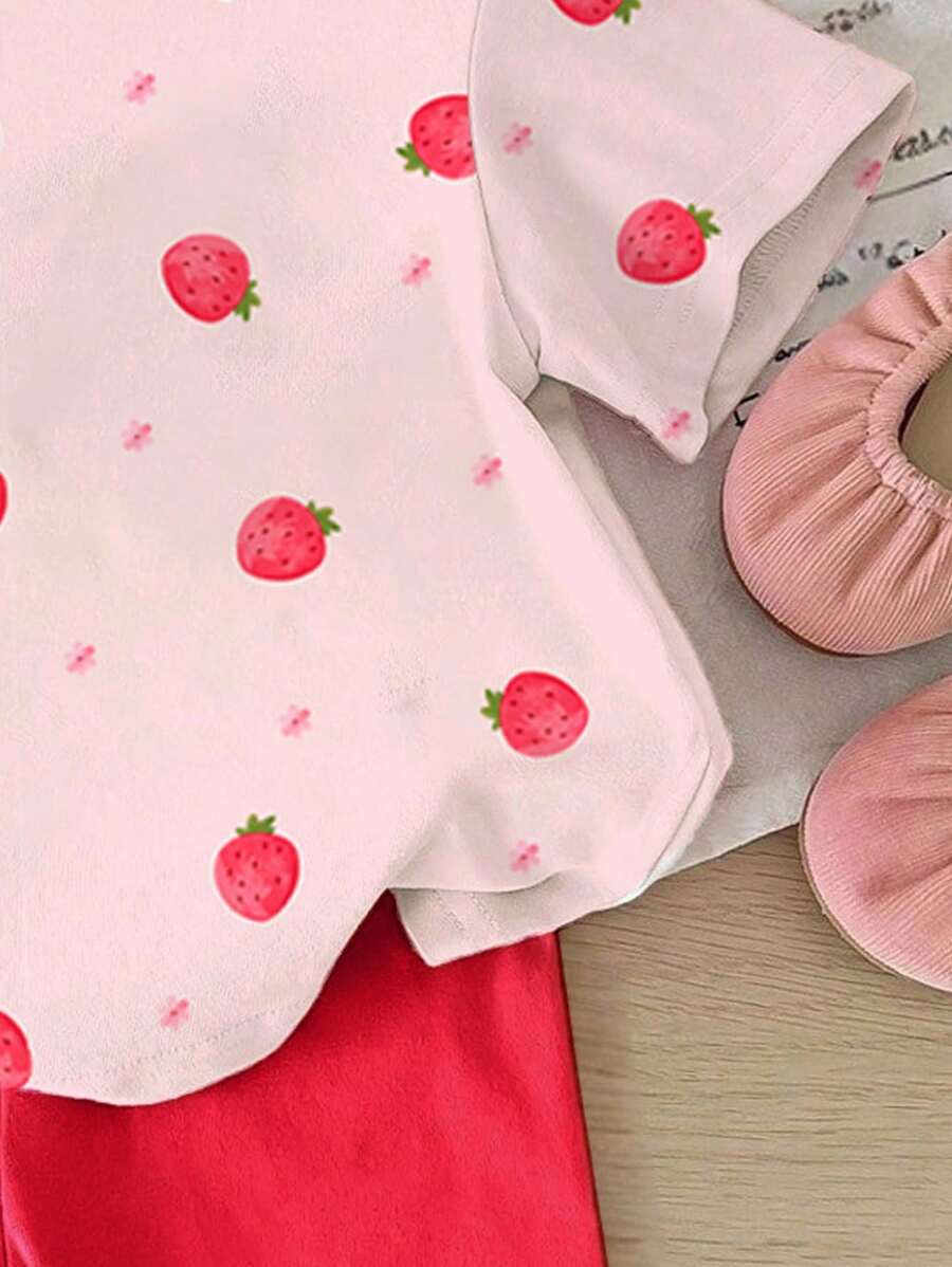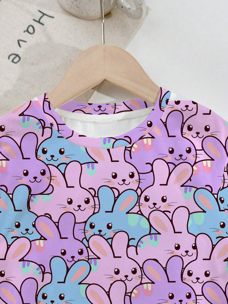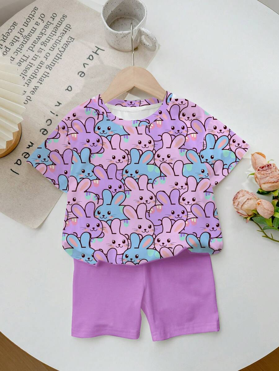 SHEIN Baby Girl Simple Casual Cute Colorful Cat Print Fashionable Round Neck Short Sleeve T-Shirt And Leggings Set, Suitable For Spring/Summer BG00046