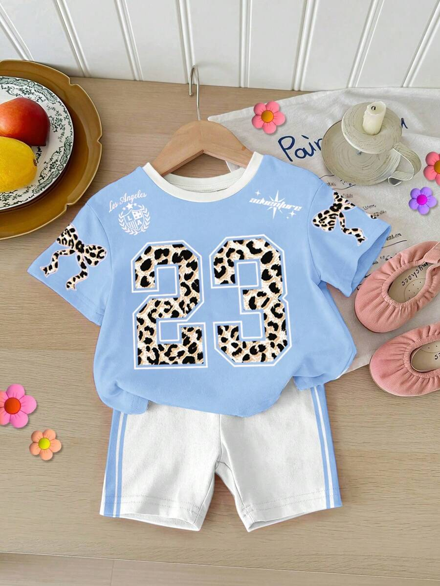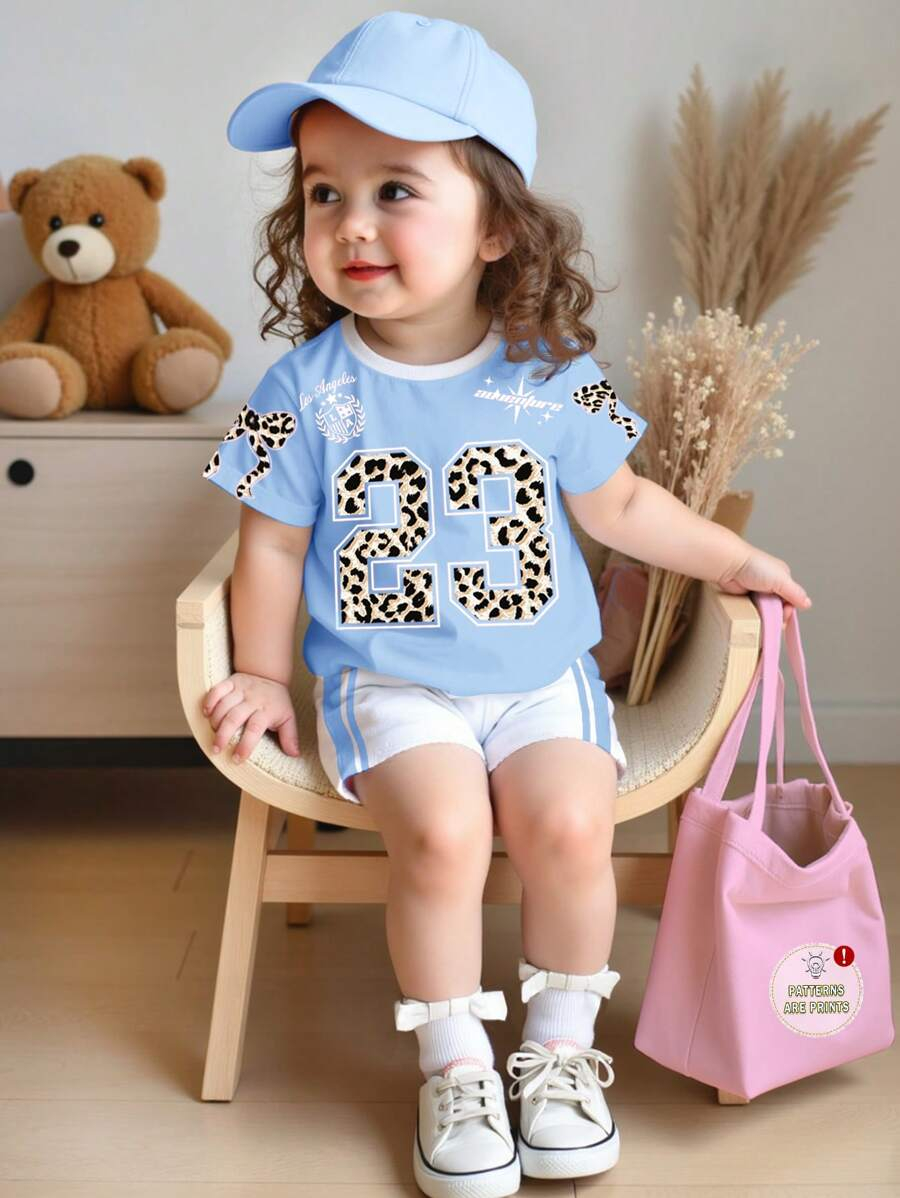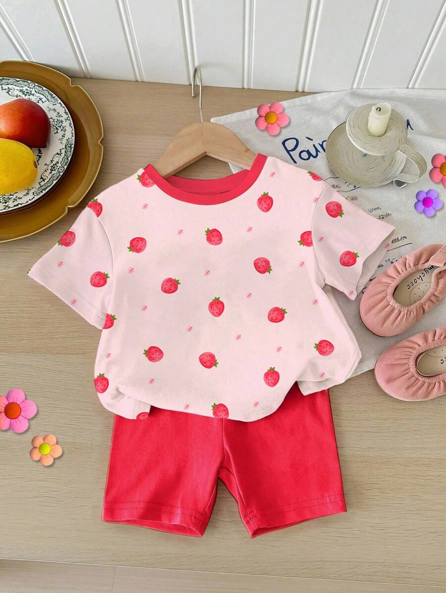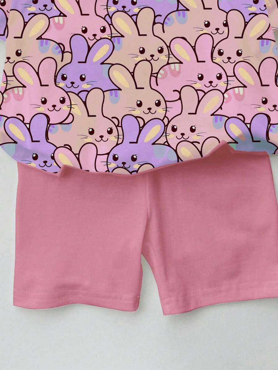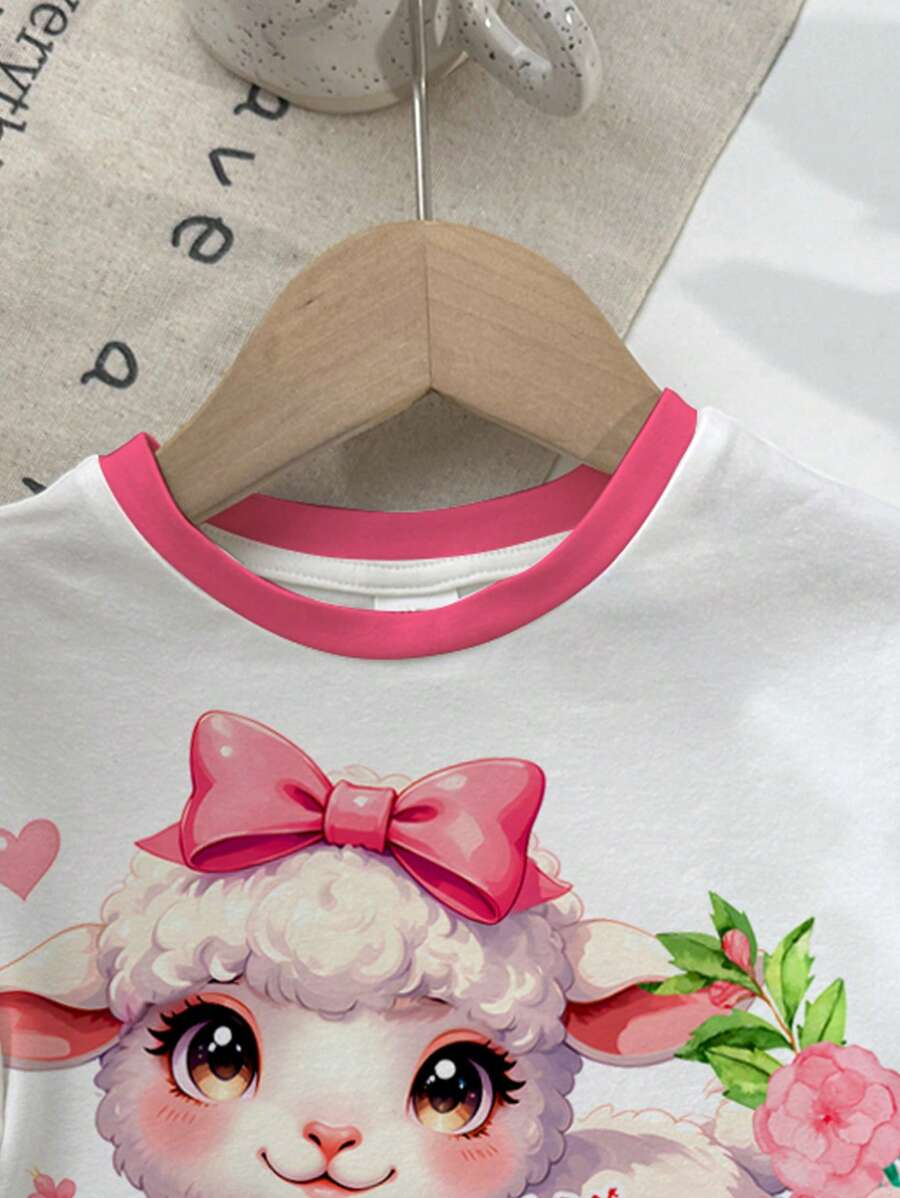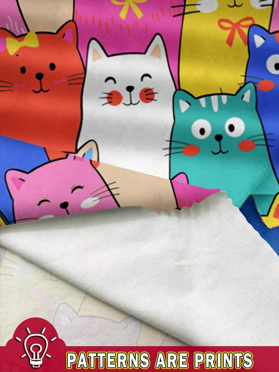SHEIN Baby Girl Simple Casual Cute Colorful Cat Print Fashionable Round Neck Short Sleeve T-Shirt And Leggings Set, Suitable For Spring/Summer BG00046