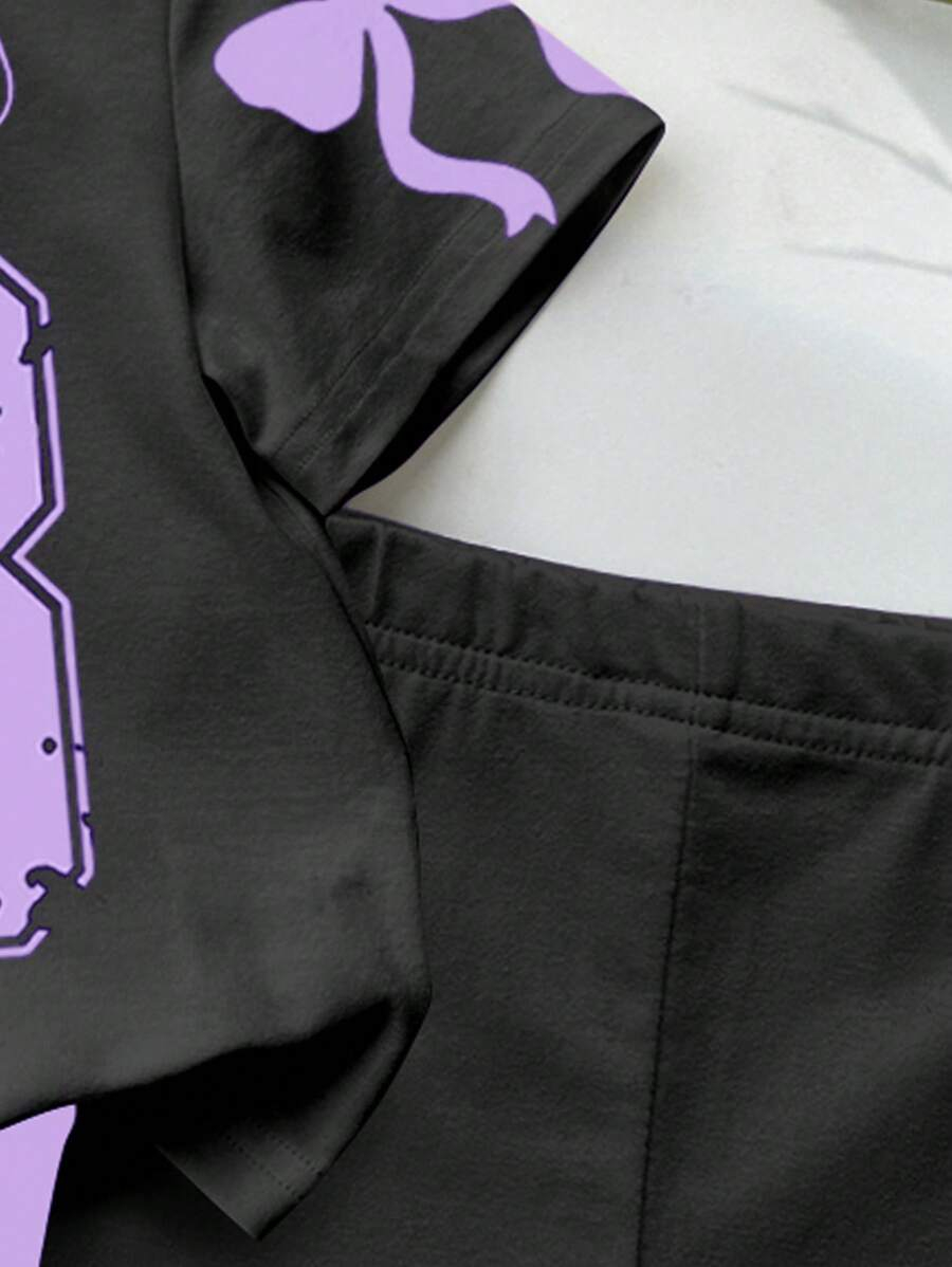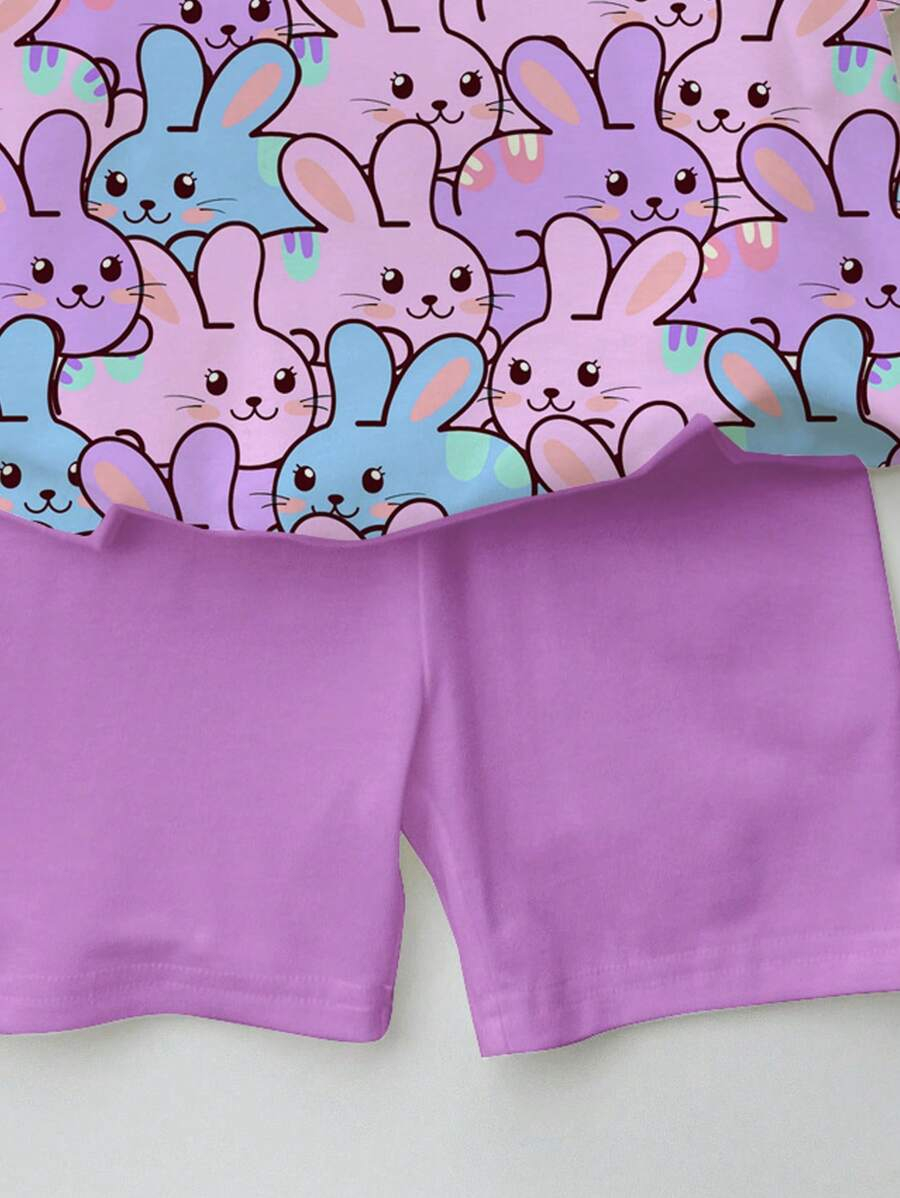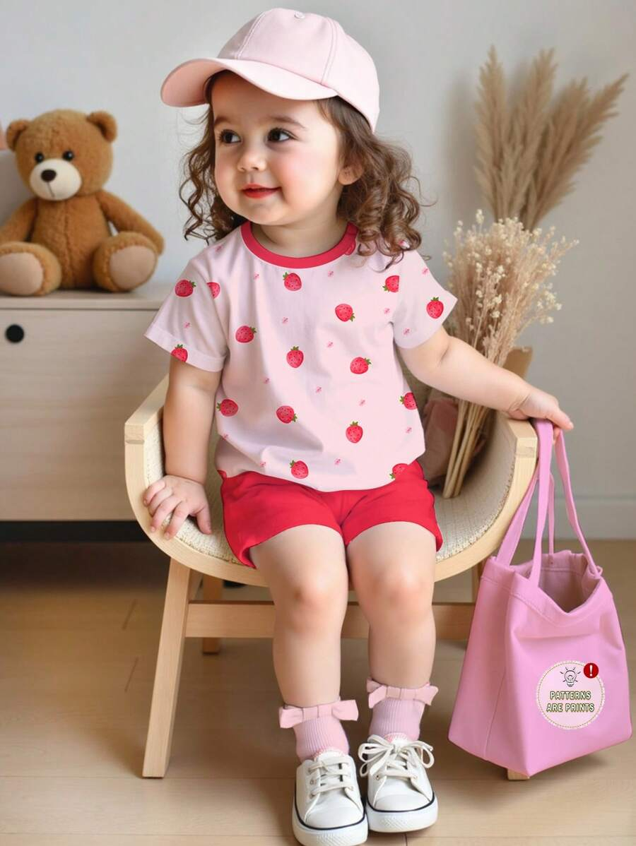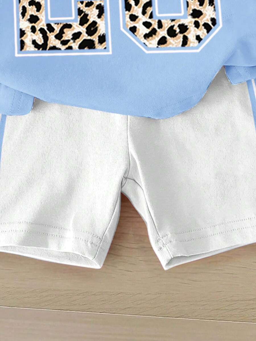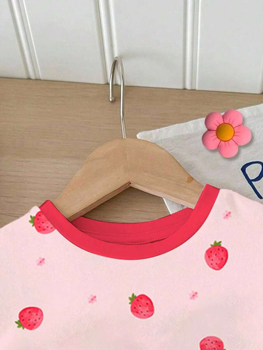 SHEIN Baby Girl Simple Casual Cute Colorful Cat Print Fashionable Round Neck Short Sleeve T-Shirt And Leggings Set, Suitable For Spring/Summer BG00046