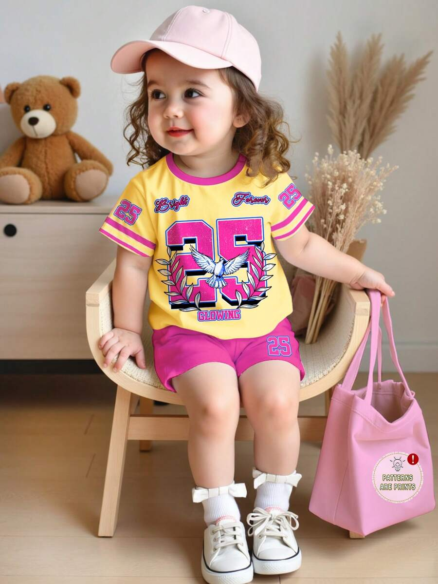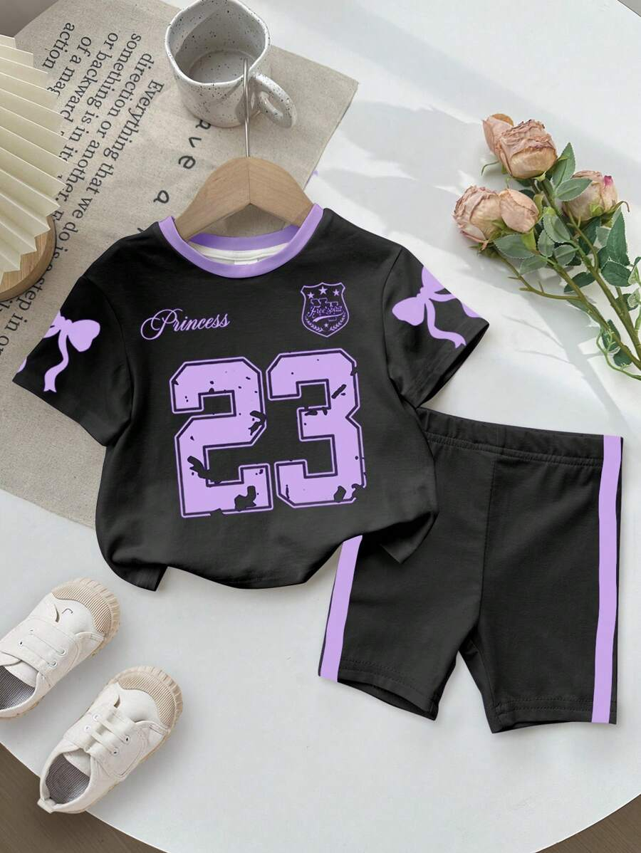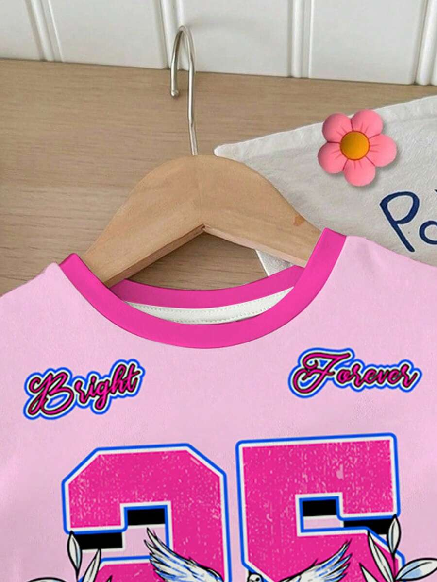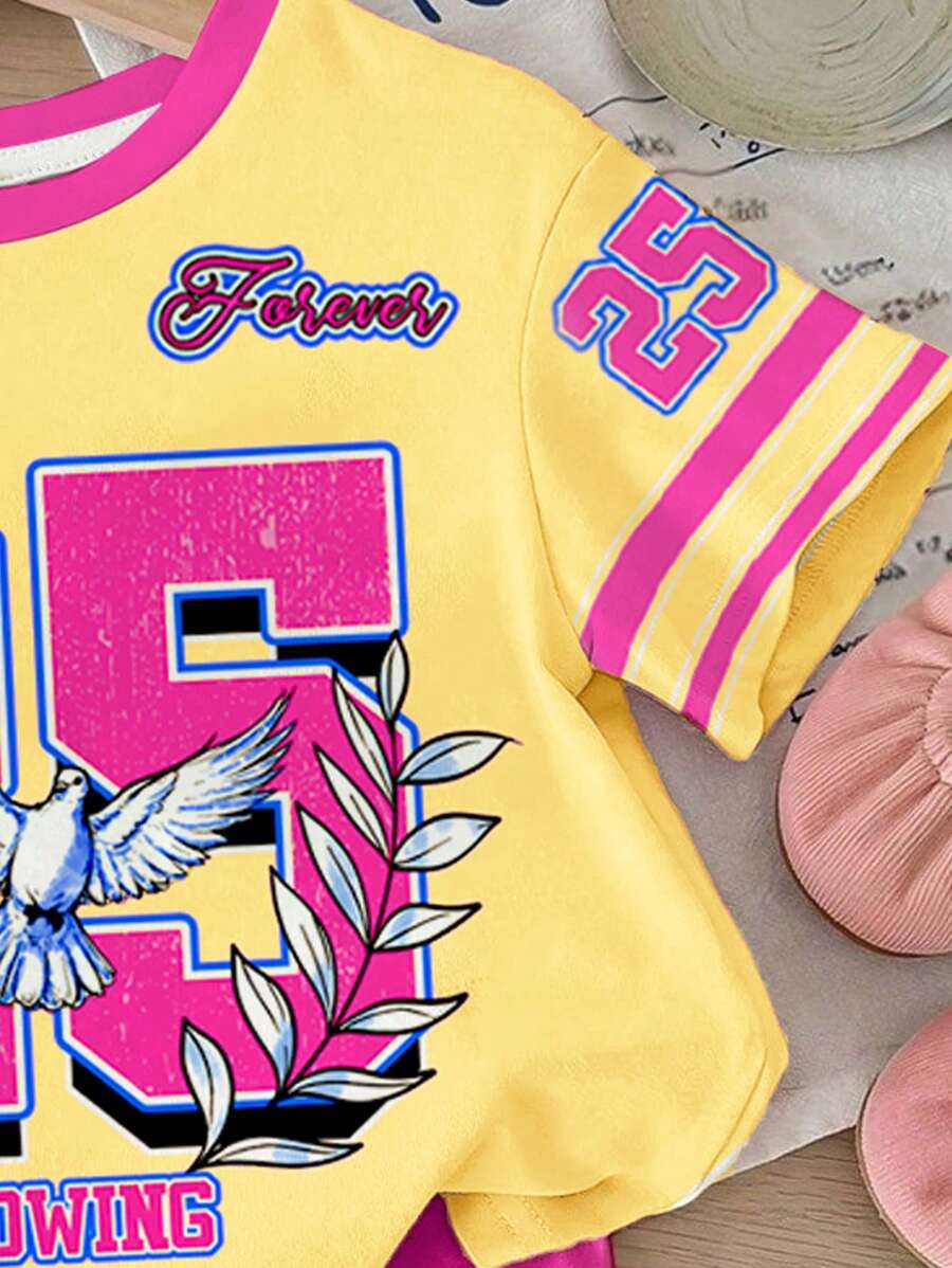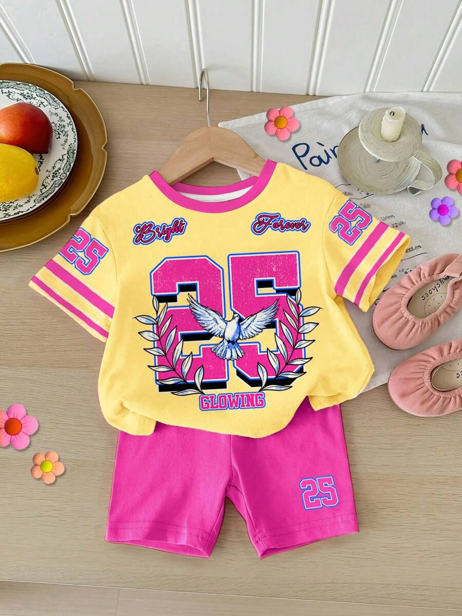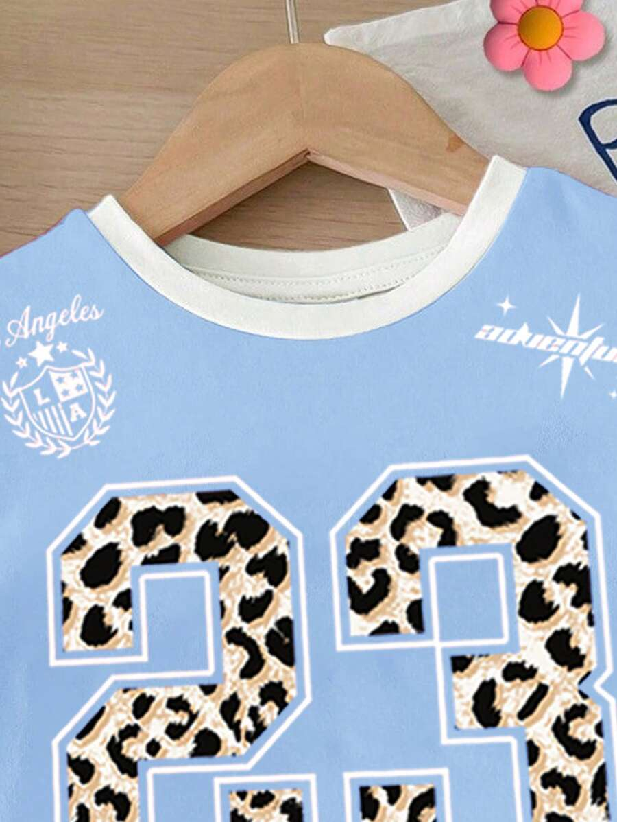 SHEIN Baby Girl Simple Casual Cute Colorful Cat Print Fashionable Round Neck Short Sleeve T-Shirt And Leggings Set, Suitable For Spring/Summer BG00046