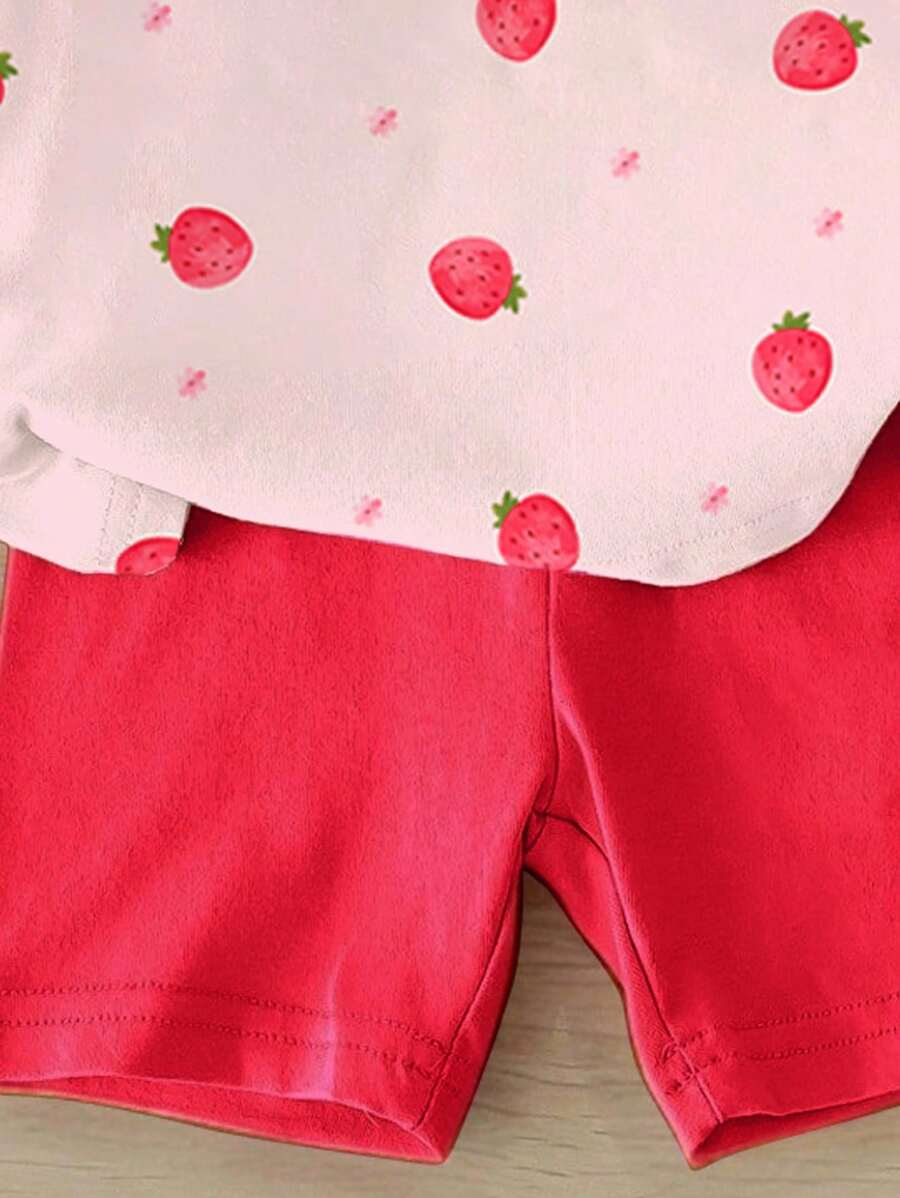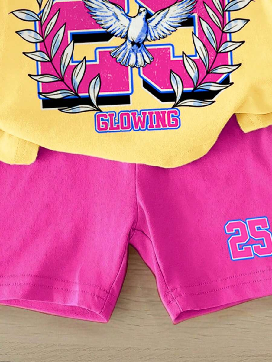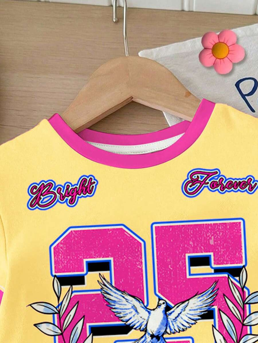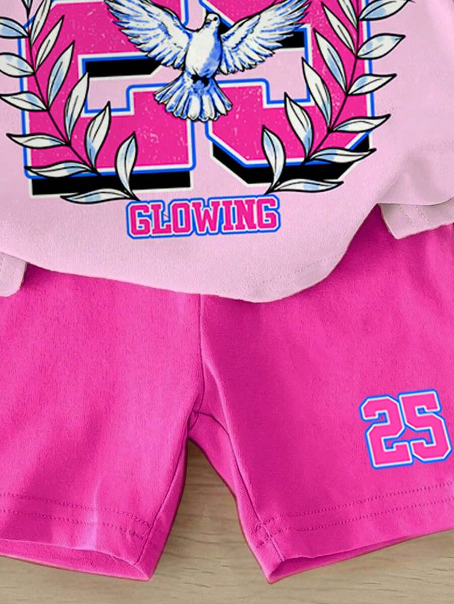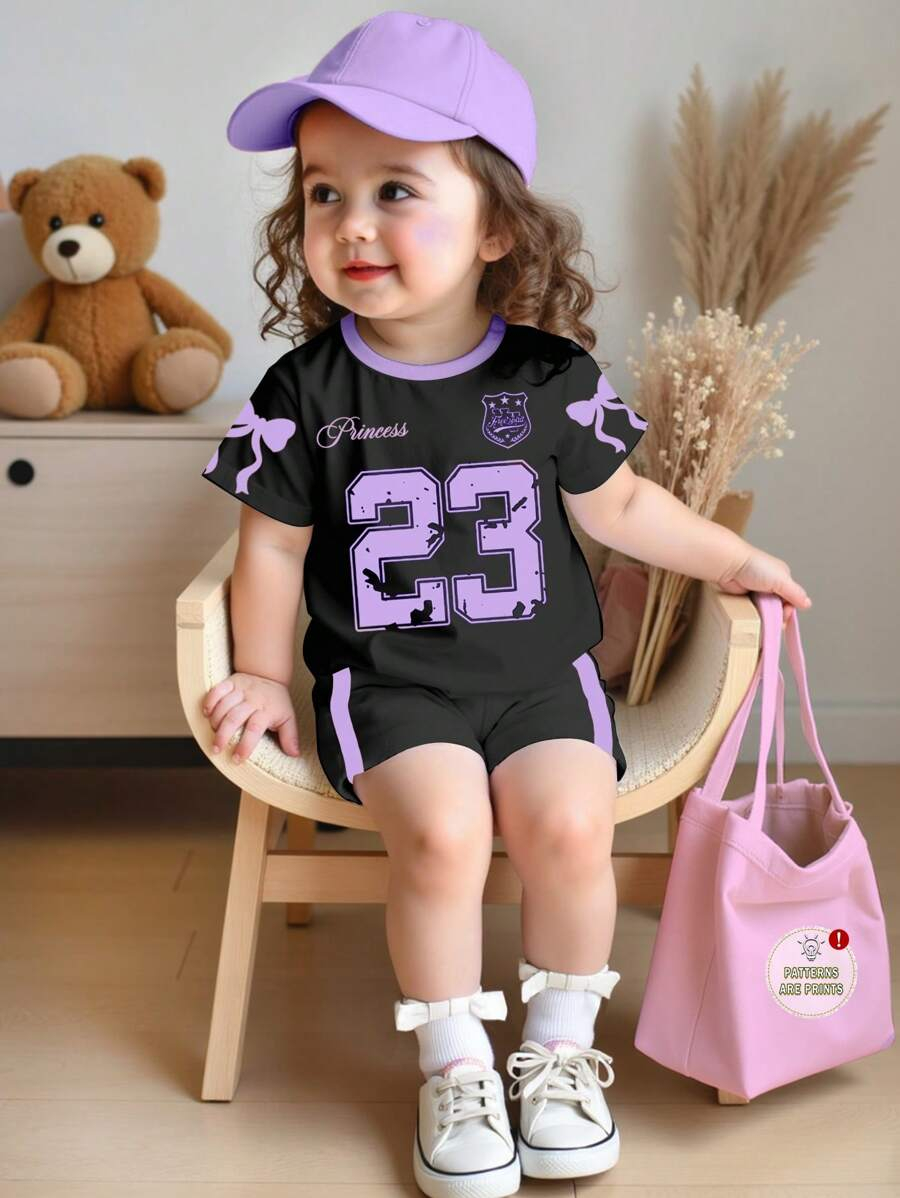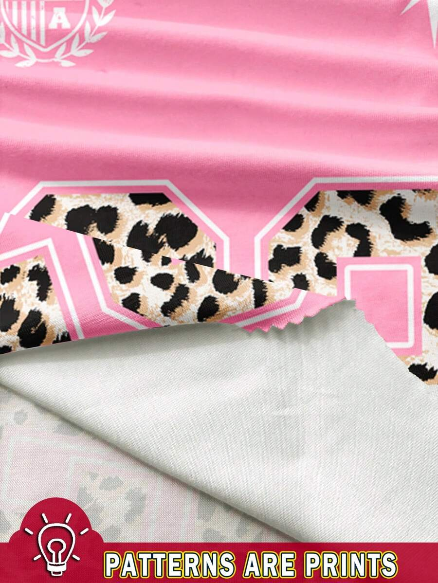 SHEIN Baby Girl Simple Casual Cute Colorful Cat Print Fashionable Round Neck Short Sleeve T-Shirt And Leggings Set, Suitable For Spring/Summer BG00046