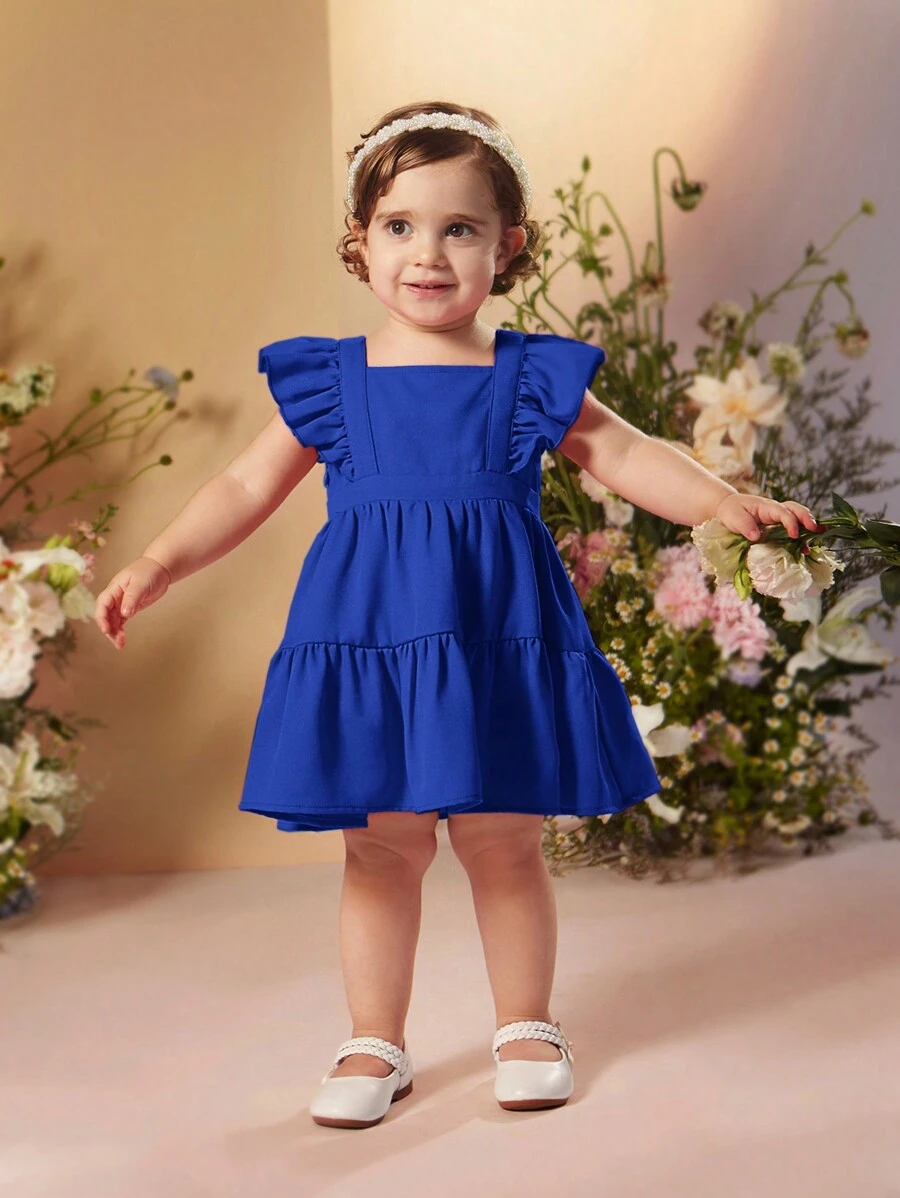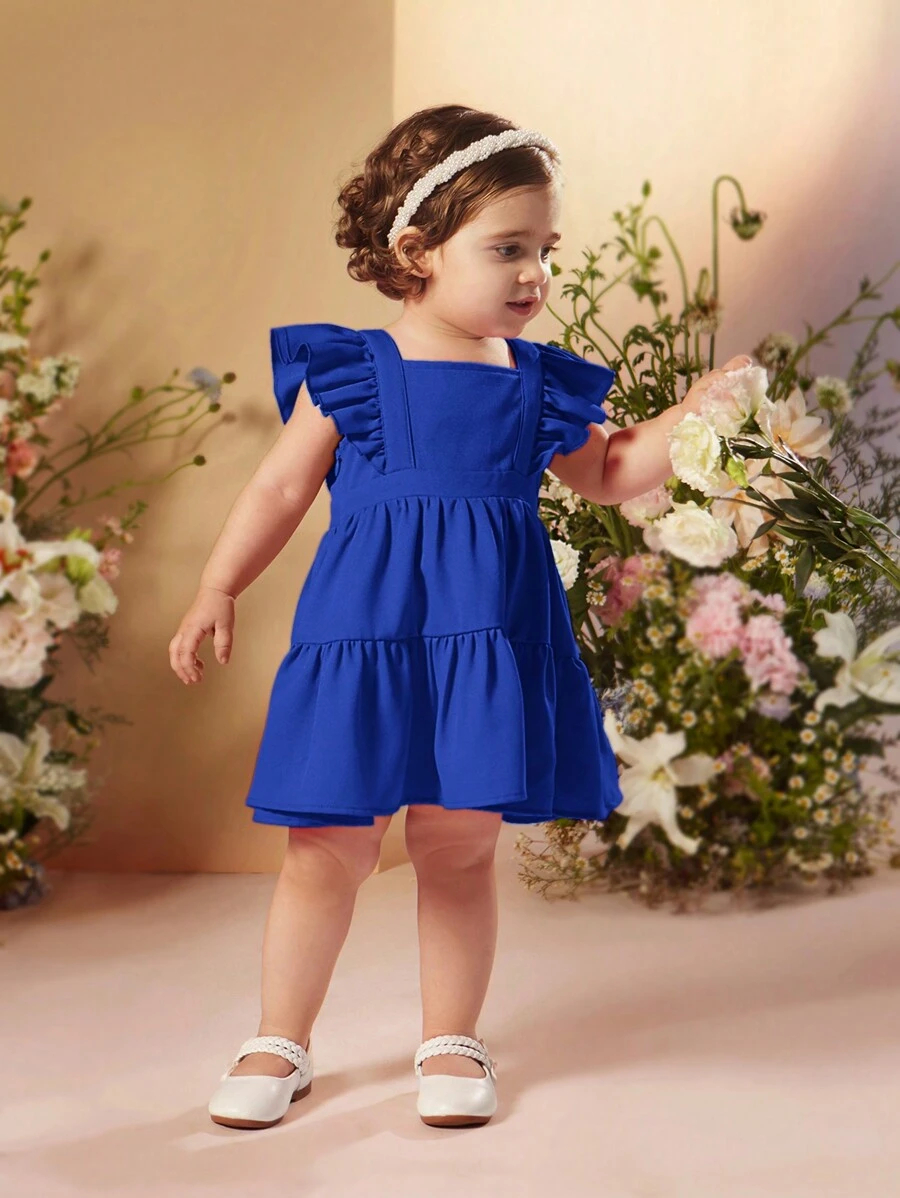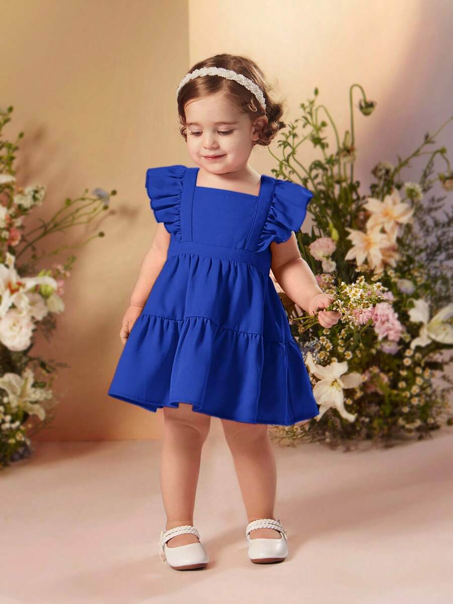 SHEIN Baby Girl Summer & Simple Solid Color Ruffle Hem Sleeveless Dress, Detachable Bowknot BG00079
