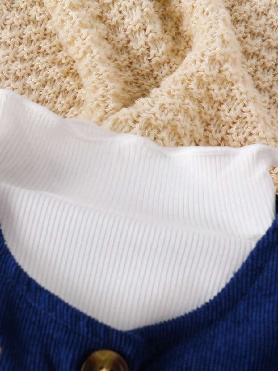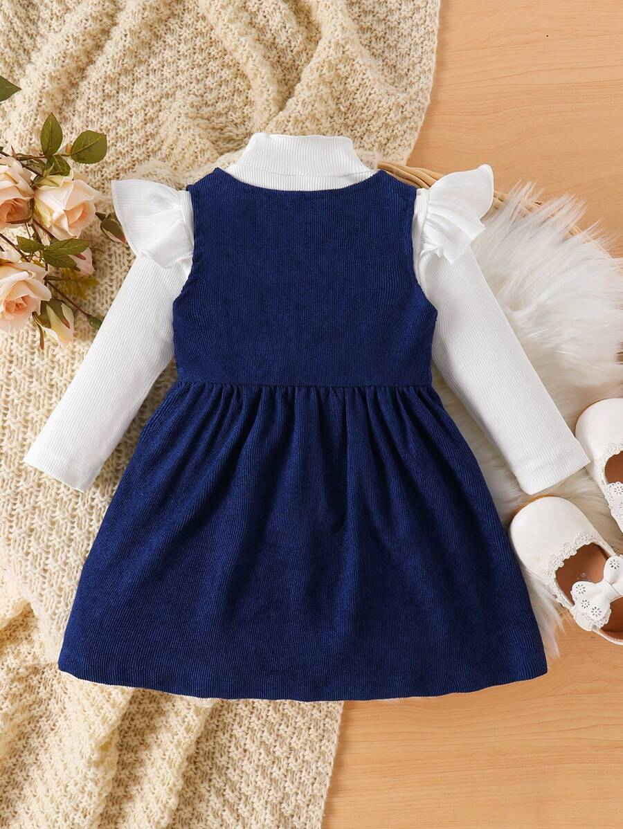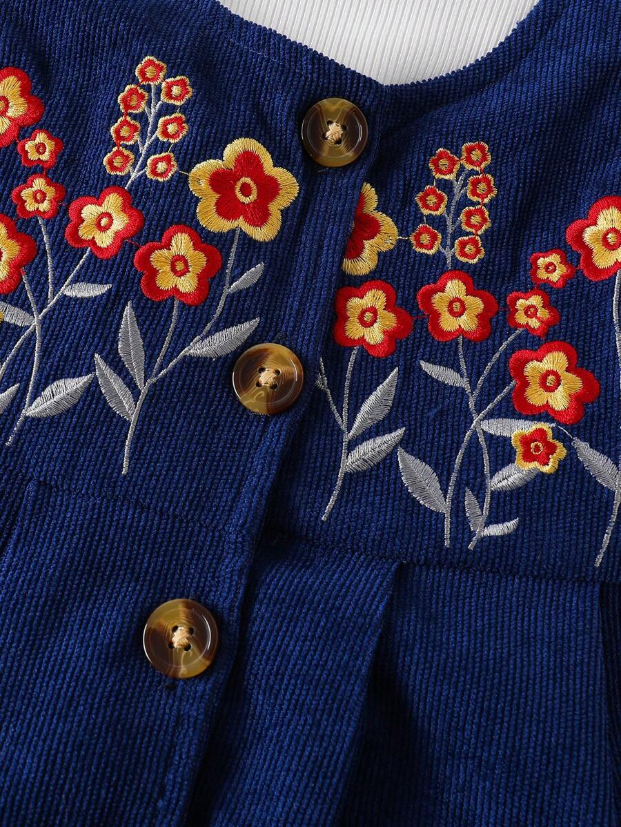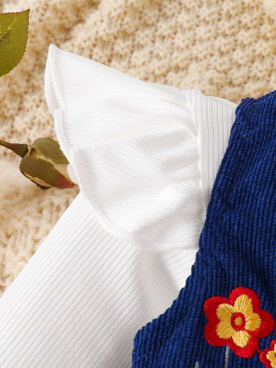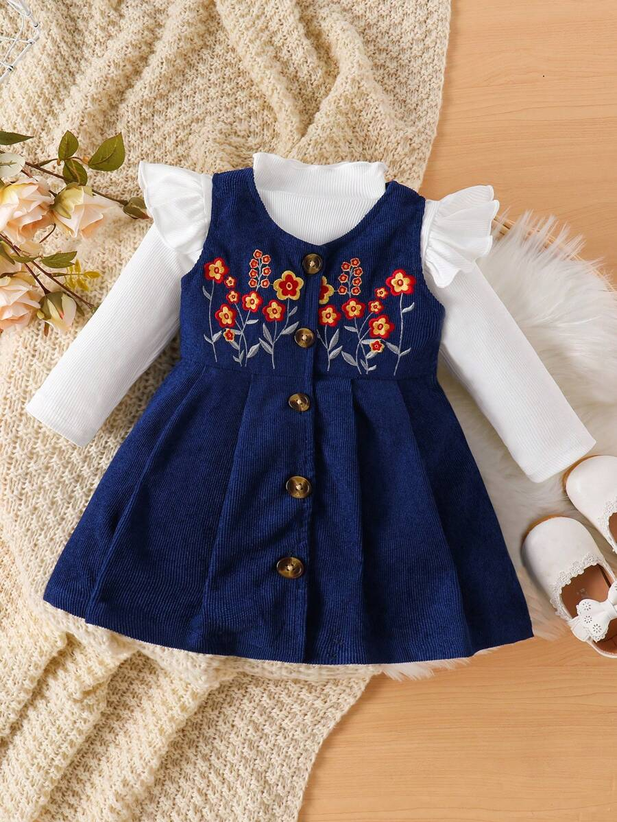SHEIN Baby Girl Sweet Minimalist Ruffle Collar Long Sleeve Blouse, Corduroy A-Line Floral Embroidered Jumper Dress Casual Countryside Outfit Set, Autumn Winter BG00078