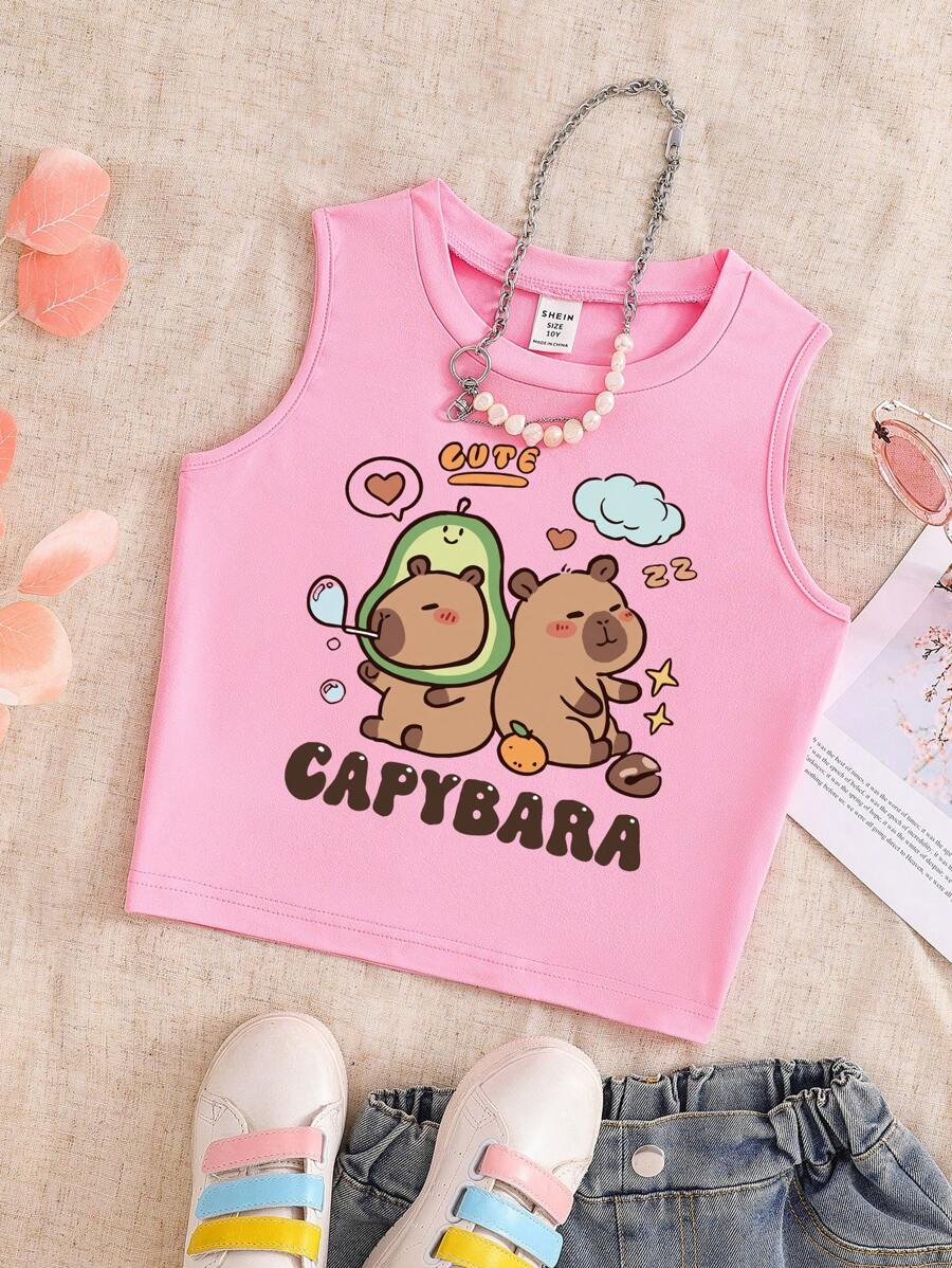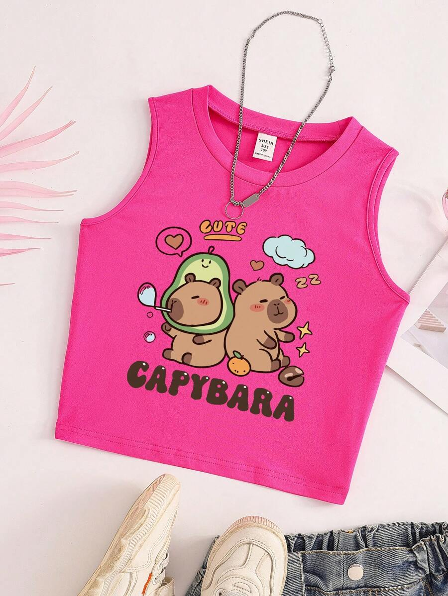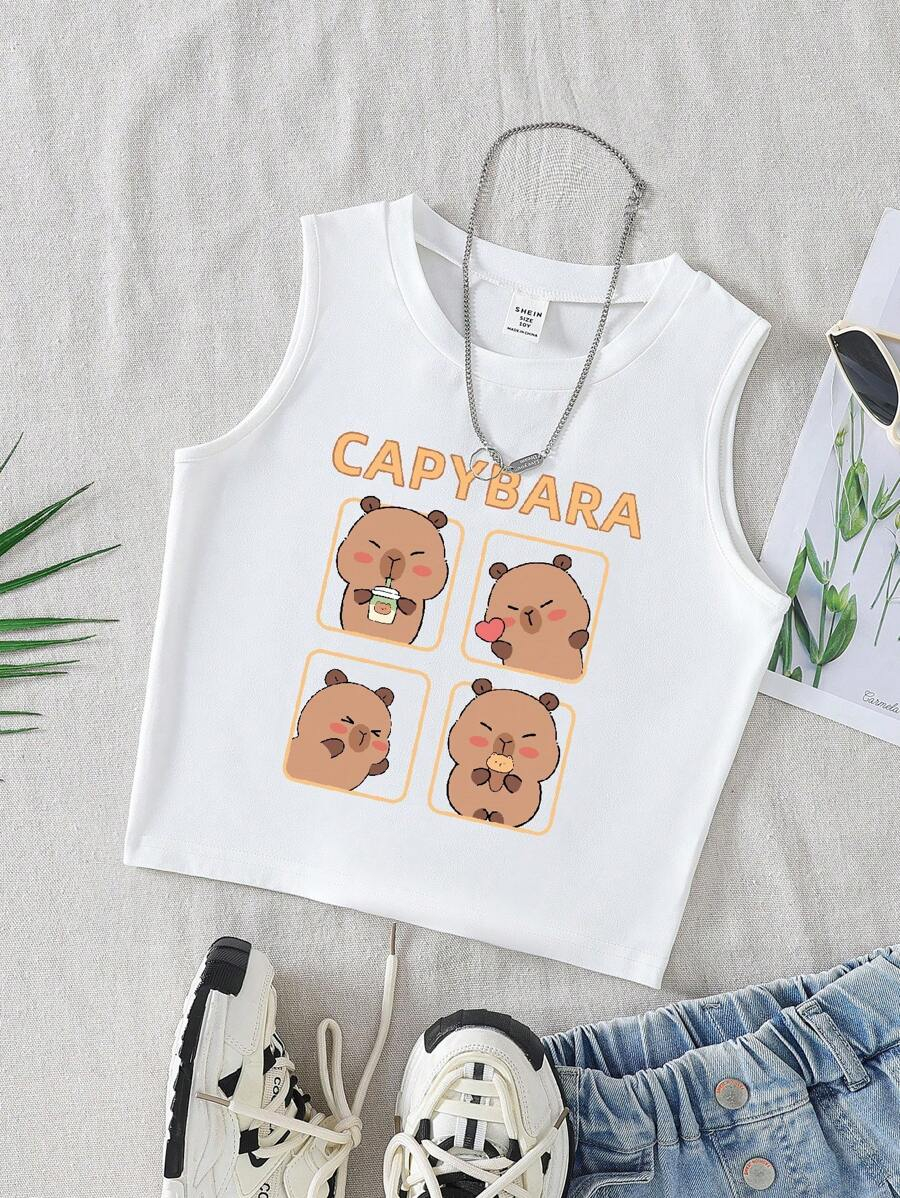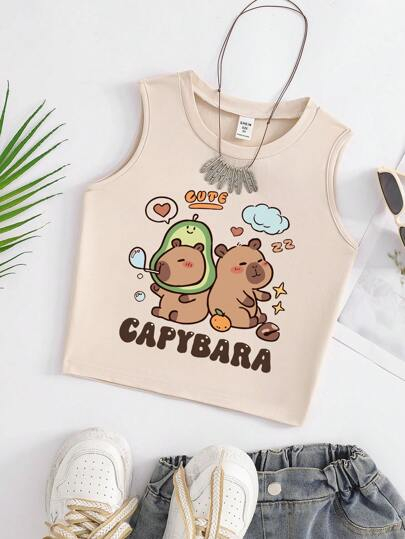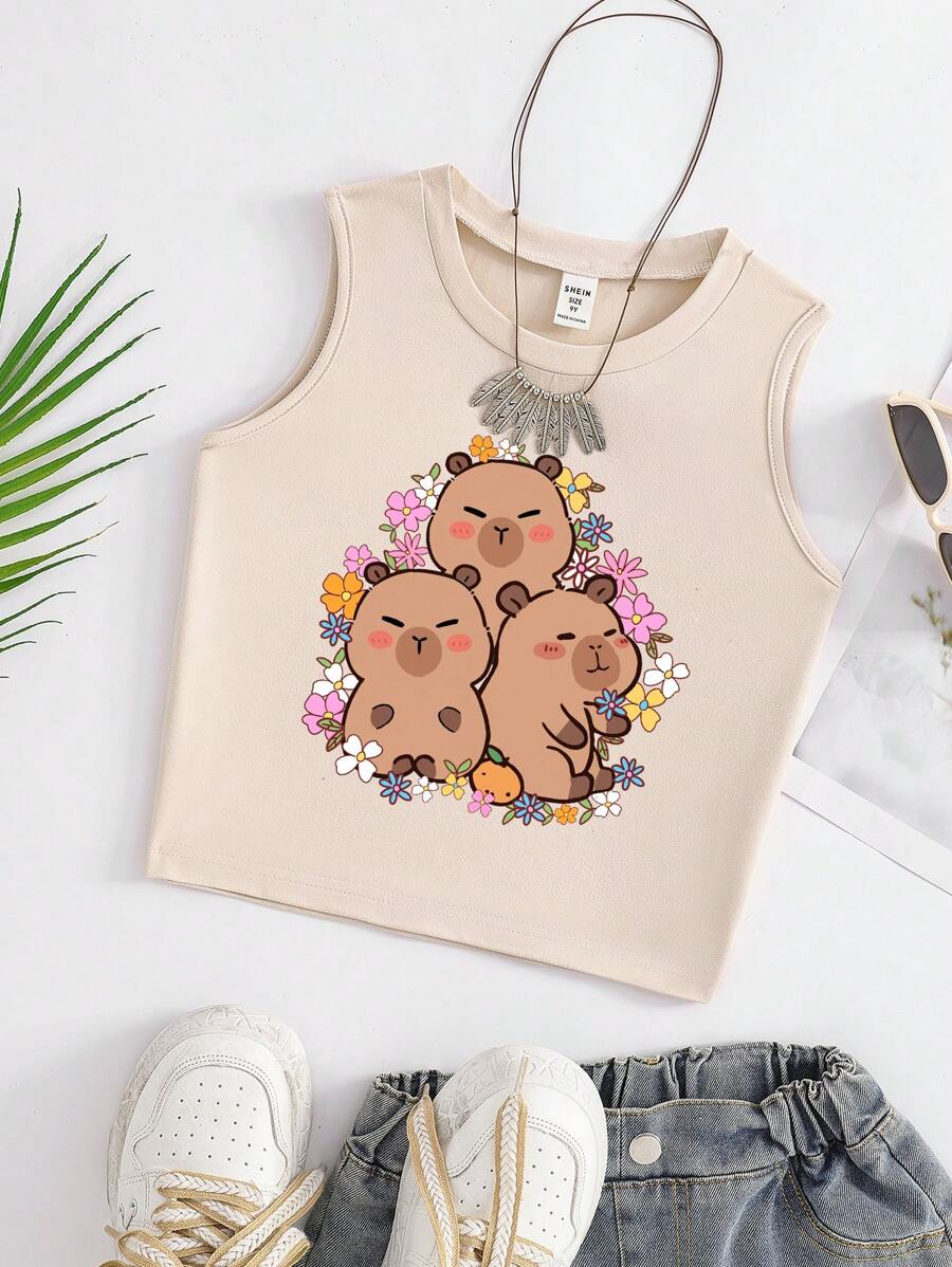 SHEIN GraphicGems Girls Teen Cute Capybara Cartoon Print Round Neck Beige Cute Tank Top TG-8-12-00009