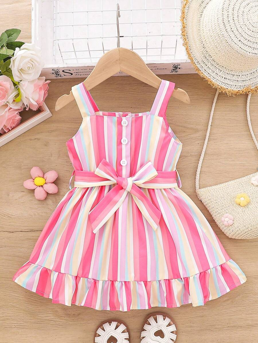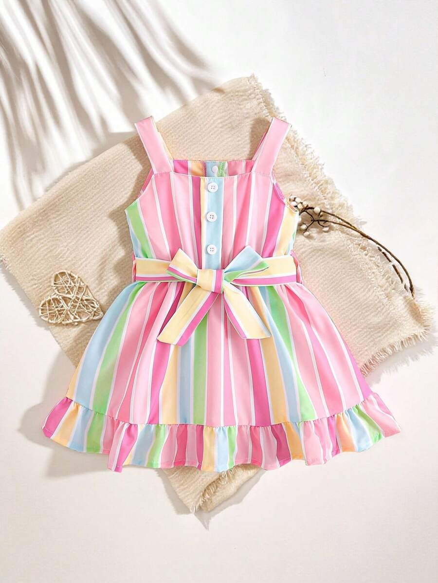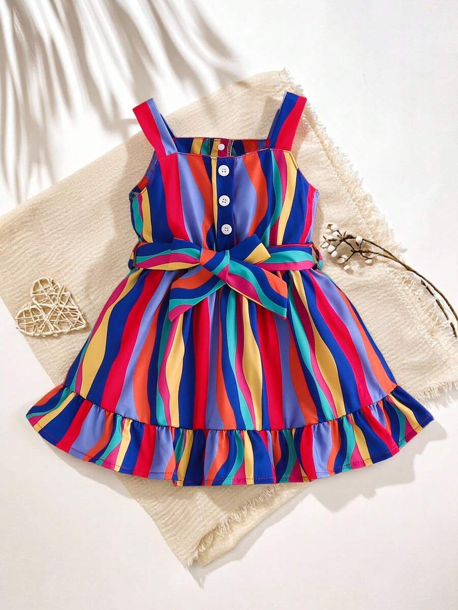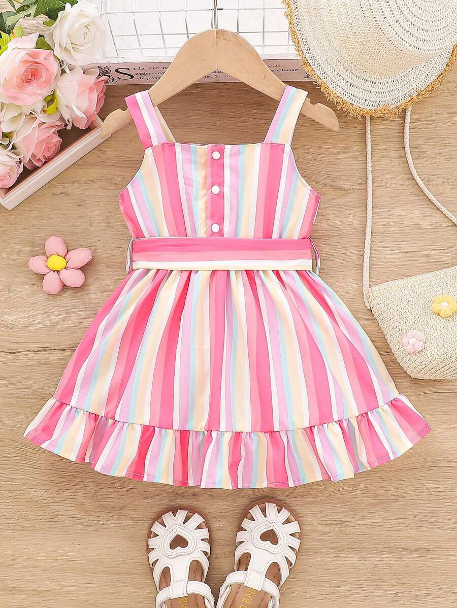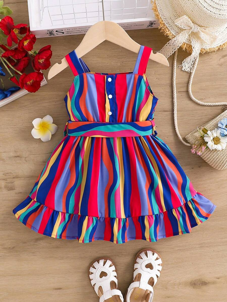 SHEIN Infant/Baby Girl Colorful Stripe Ruffle Hem Button Decorated Casual Dress, Summer Fashion & Cute BG00040