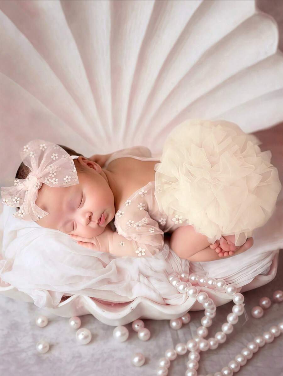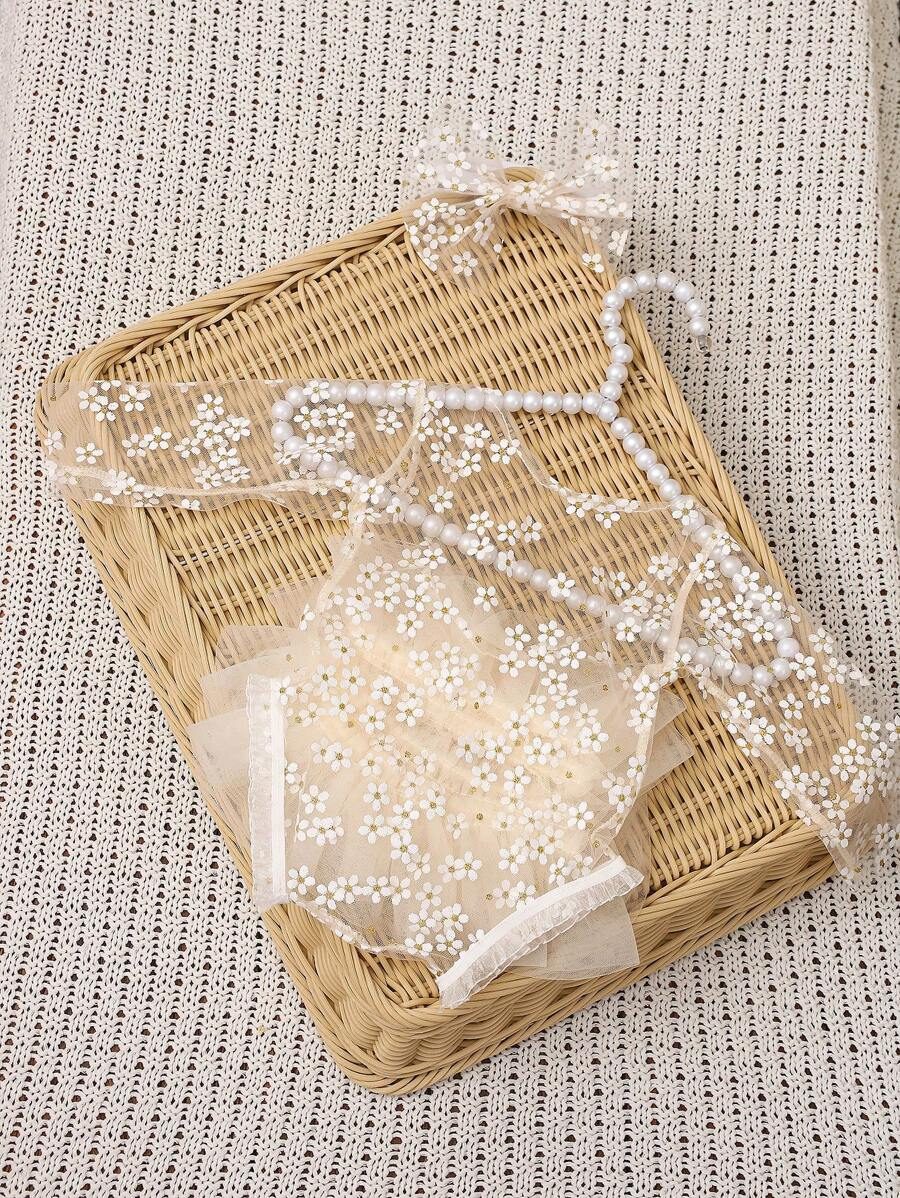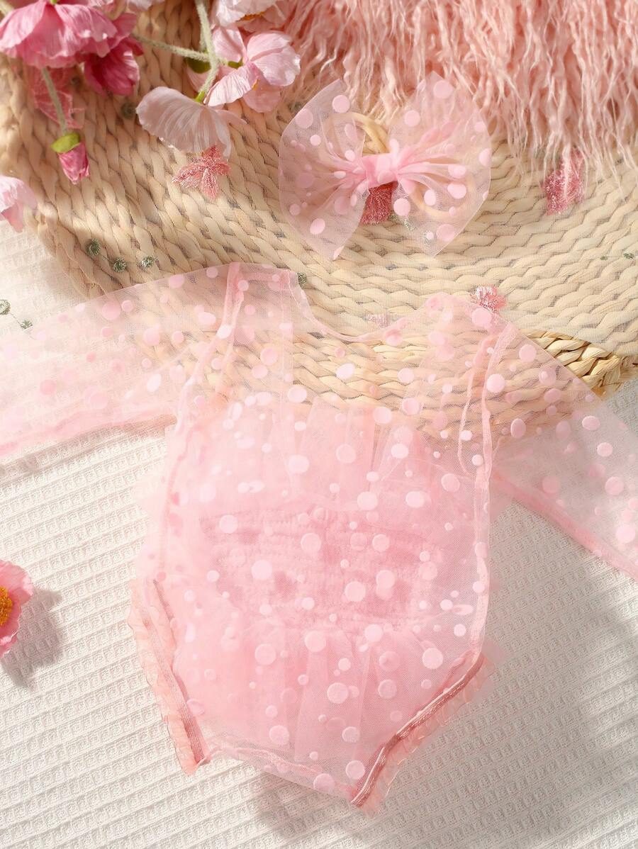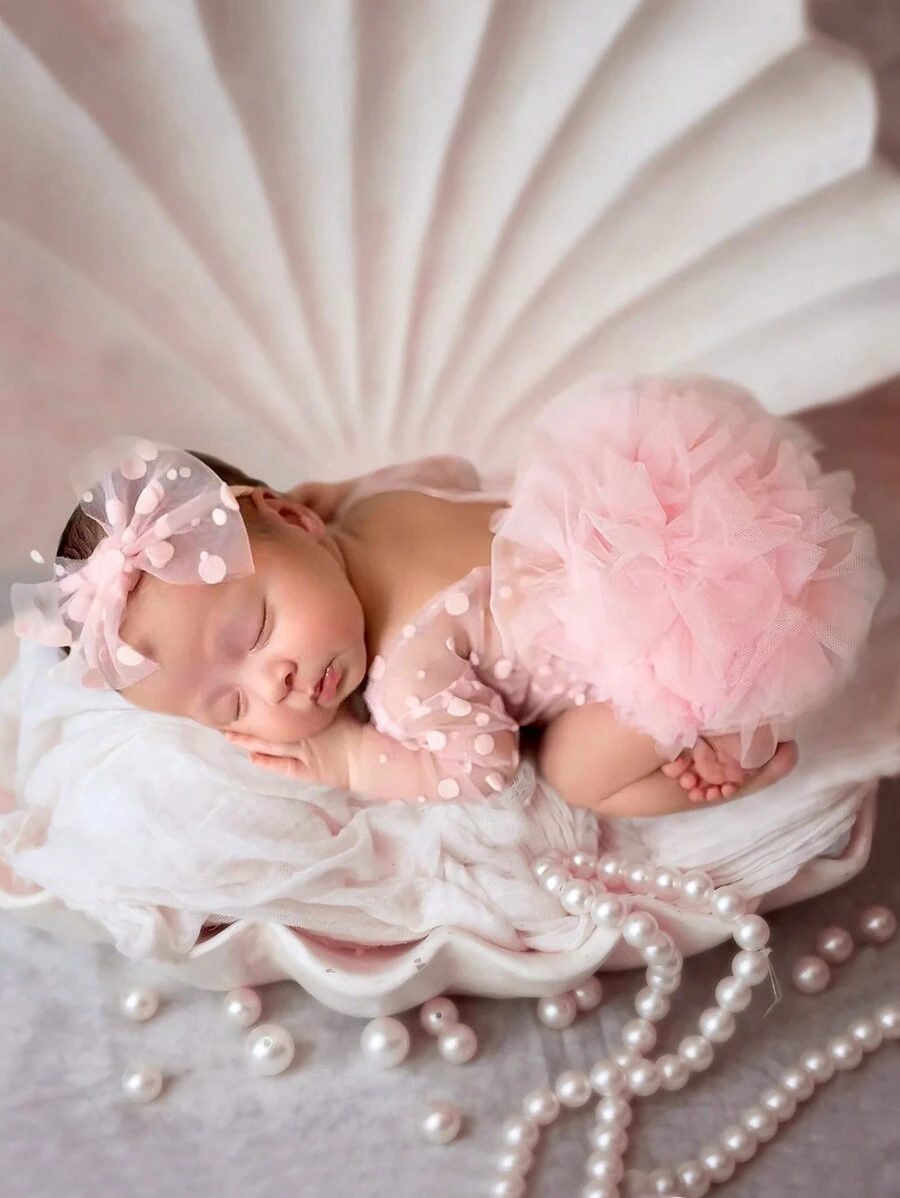 SHEIN Newborn Photography Outfit Props, Polka Dot Lace Romper & Headband Set NB00053