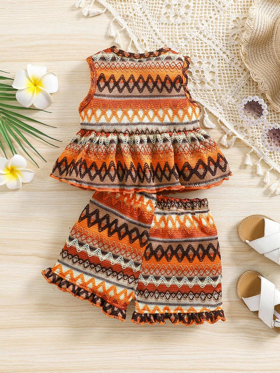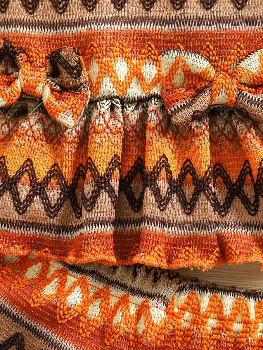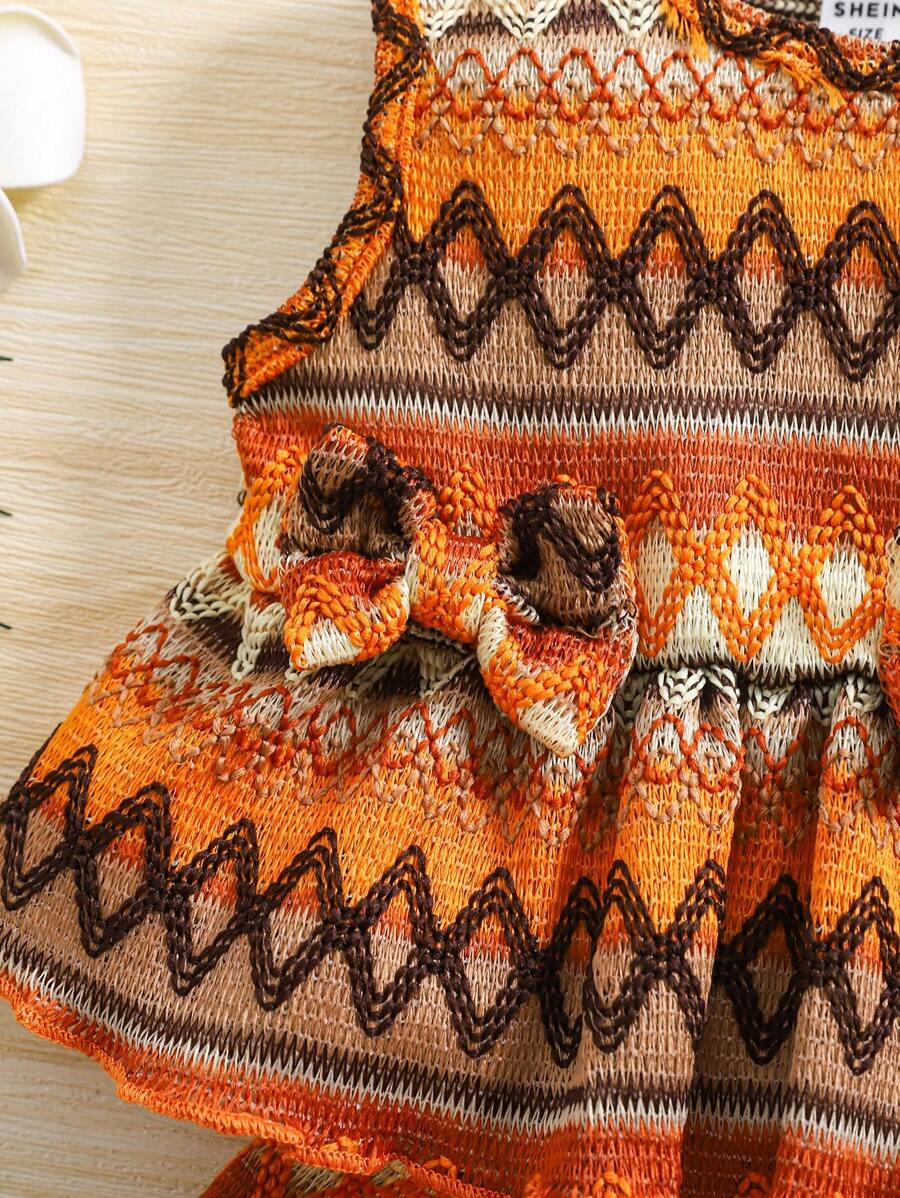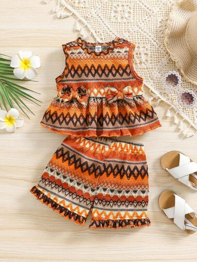 SHEIN Vintaside Kids 2pcs Set Baby Girl Casual Adorable Vacation Crochet Bohemian Bowknot Front Sleeveless Top And Ruffle Hem Loose Wide Leg Shorts, Spring/Summer New Arrivals BG00044
