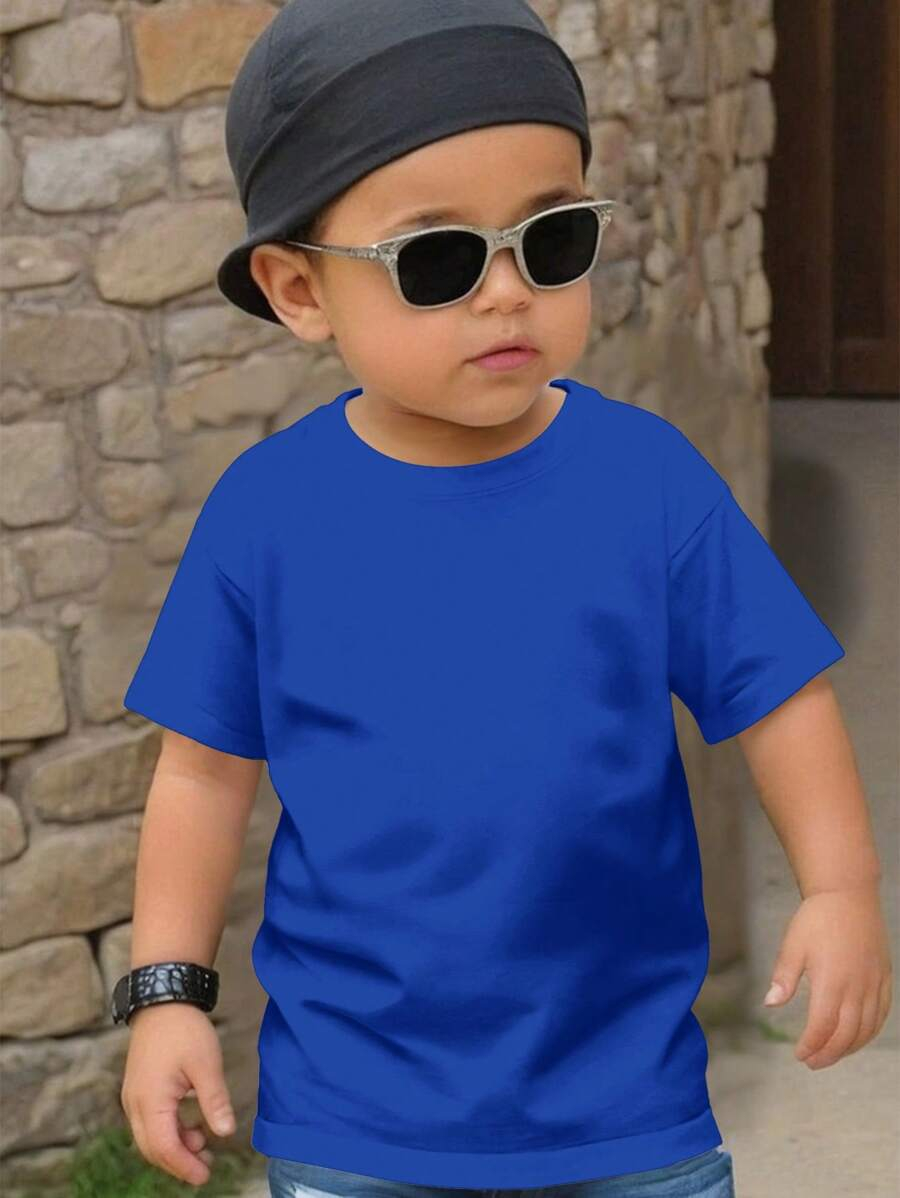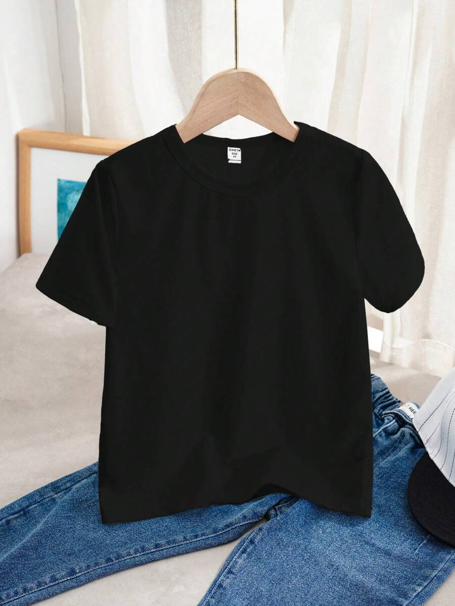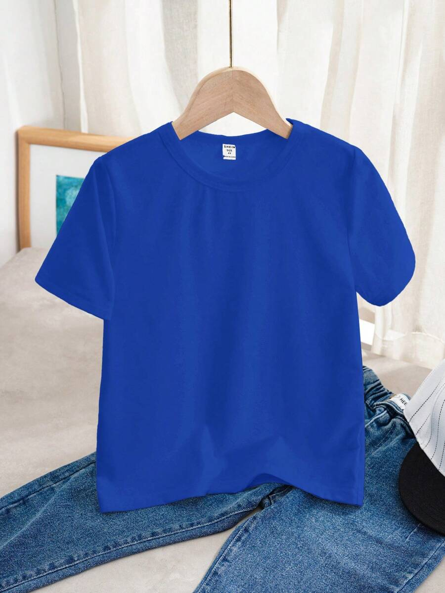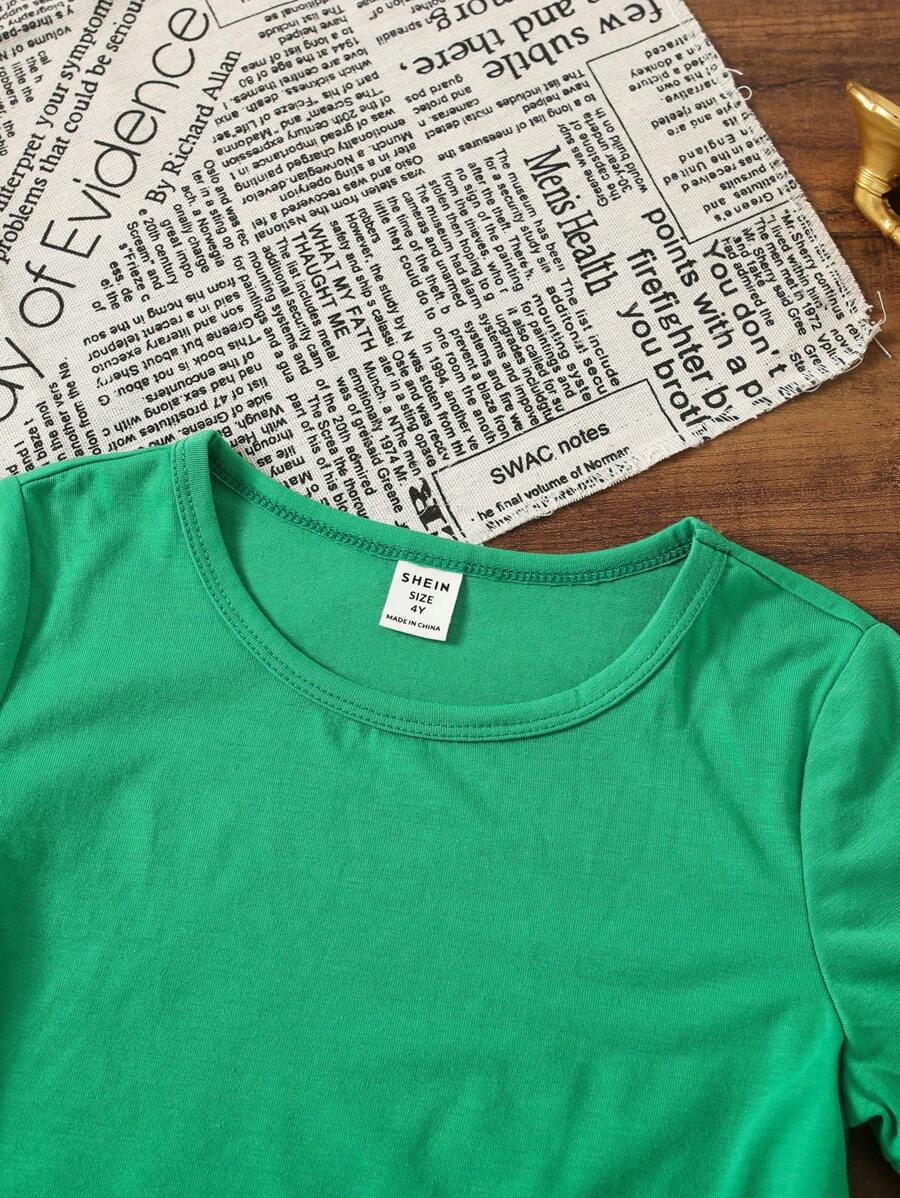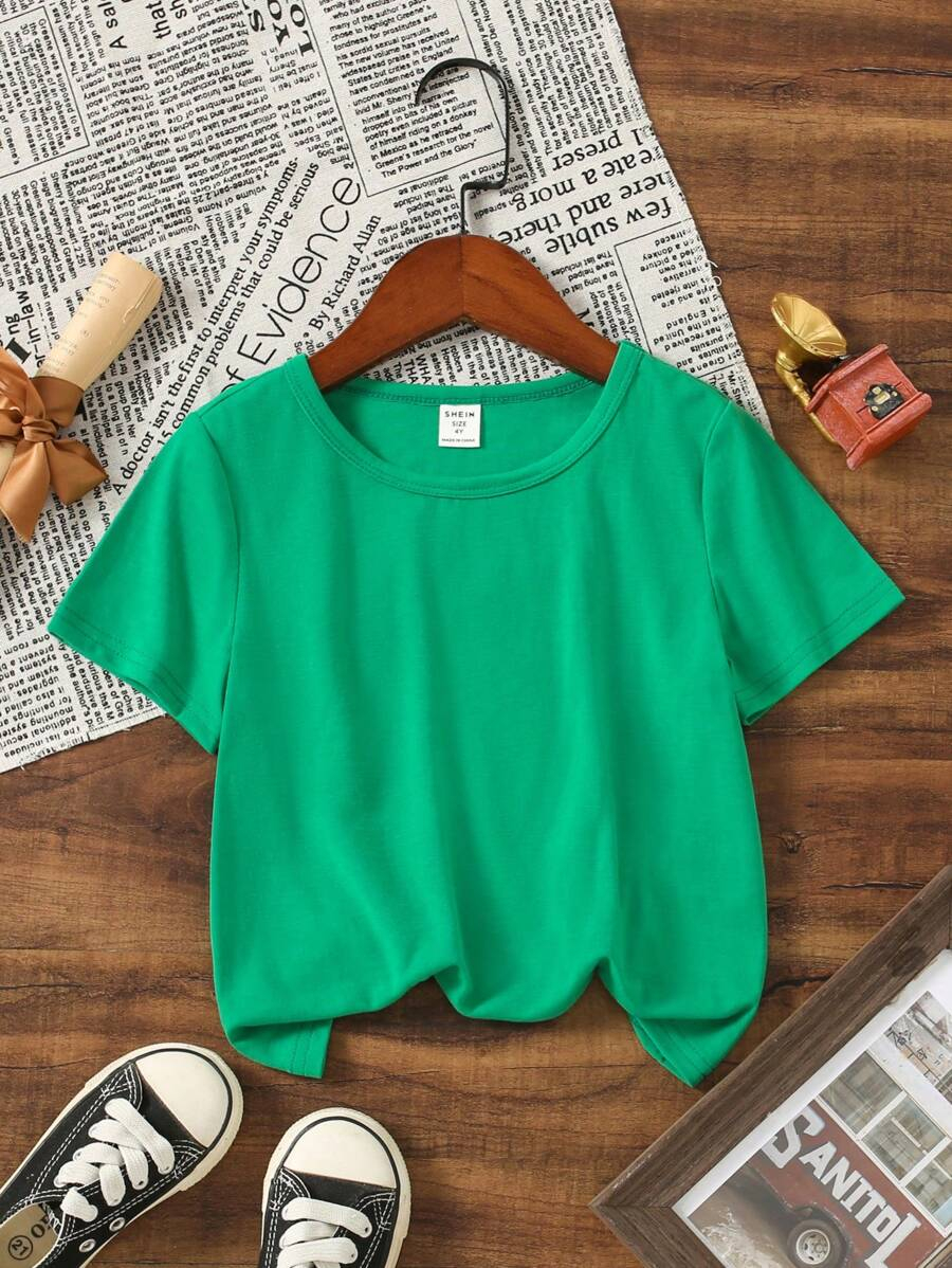 SHEIN Young Boy Casual Solid Color Short Sleeve Round Neck T-Shirt In Green, Suitable For Summer Green Tops For Kids YB00067