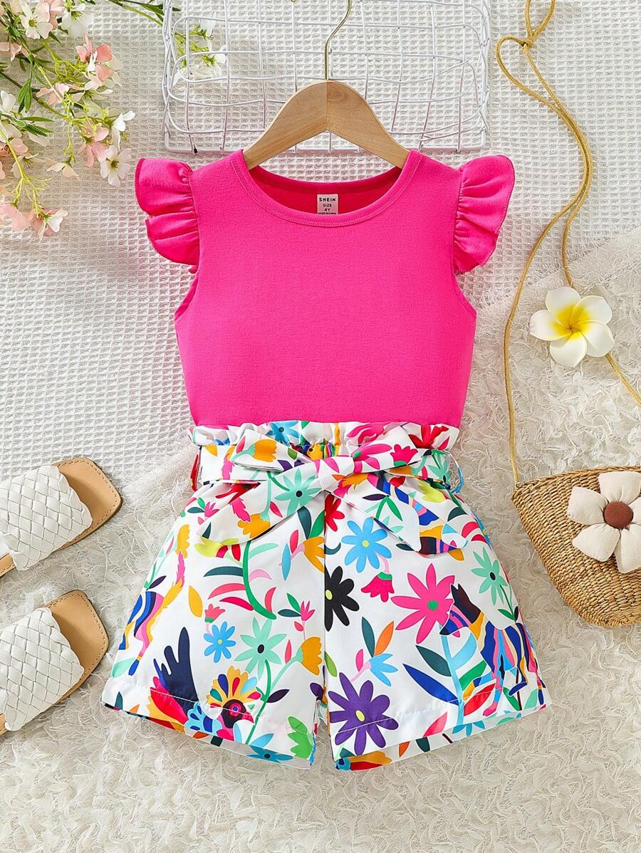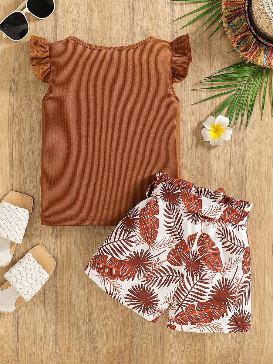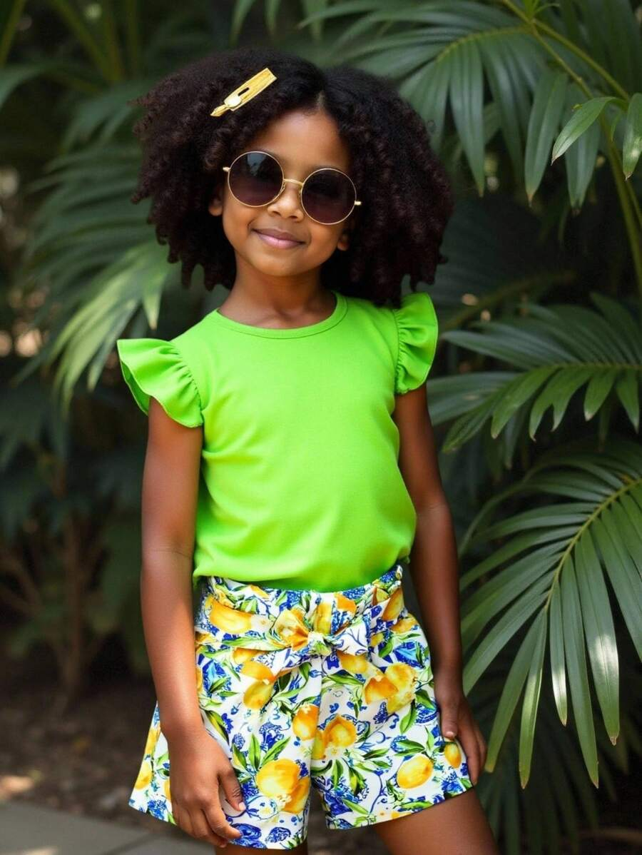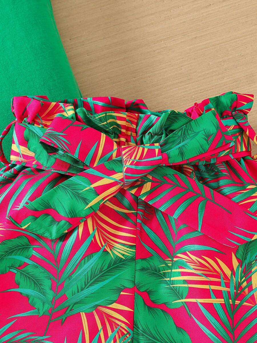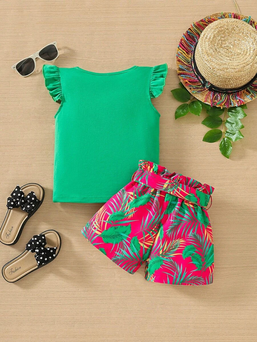 SHEIN Young Girl Summer Vacation Solid Color Cap Sleeve Top And Tropical Print Shorts Outfit YG00096