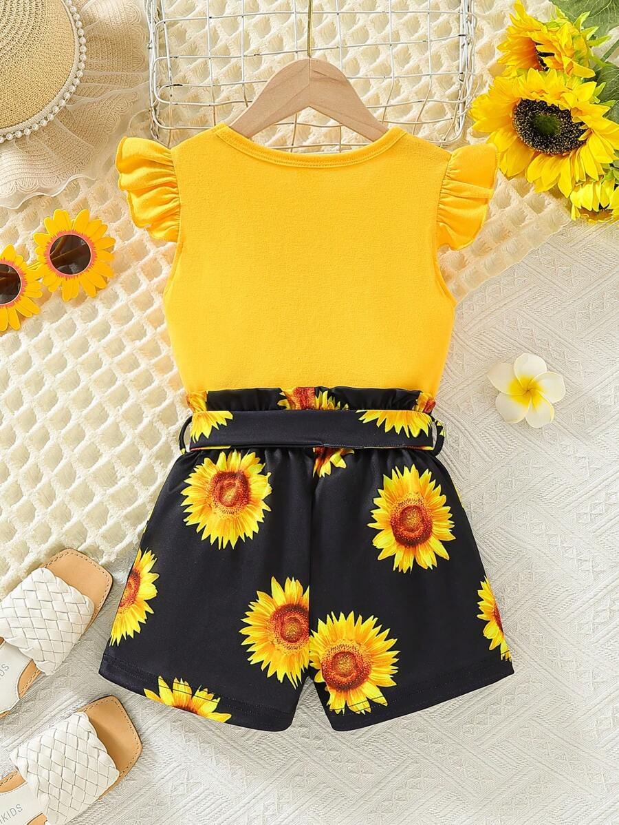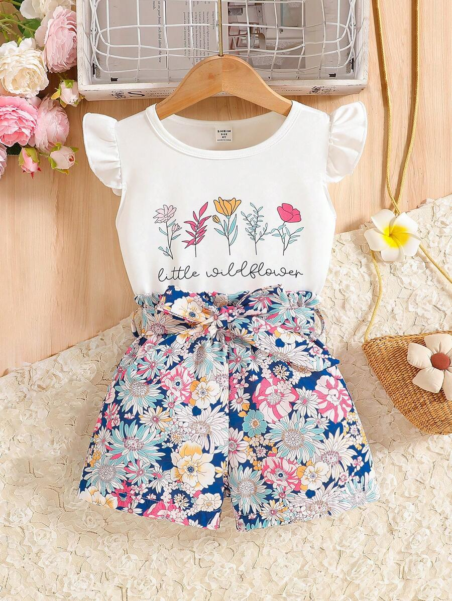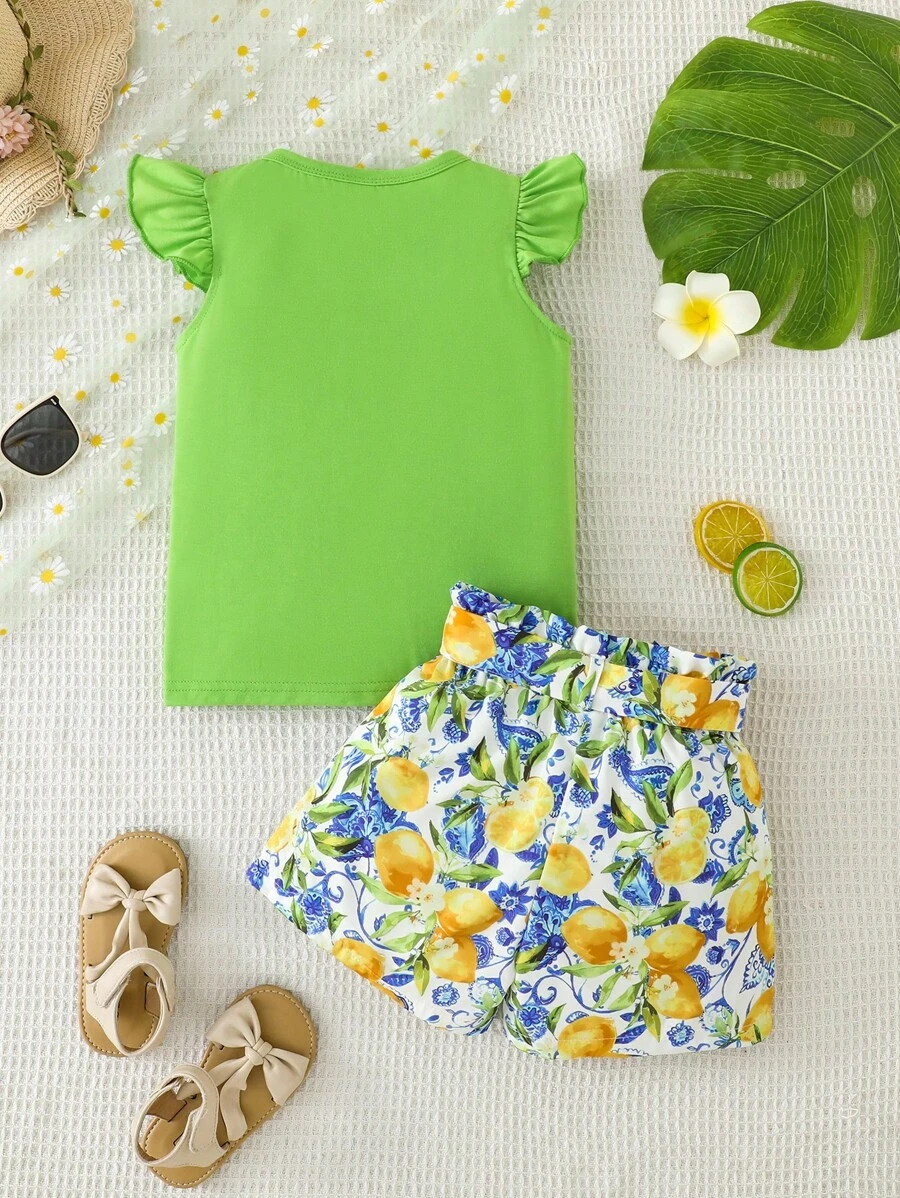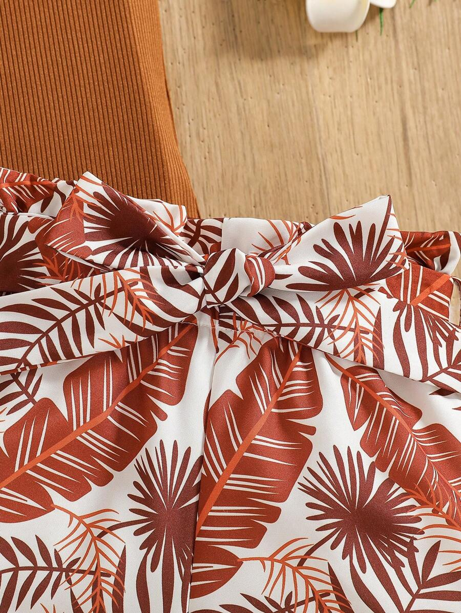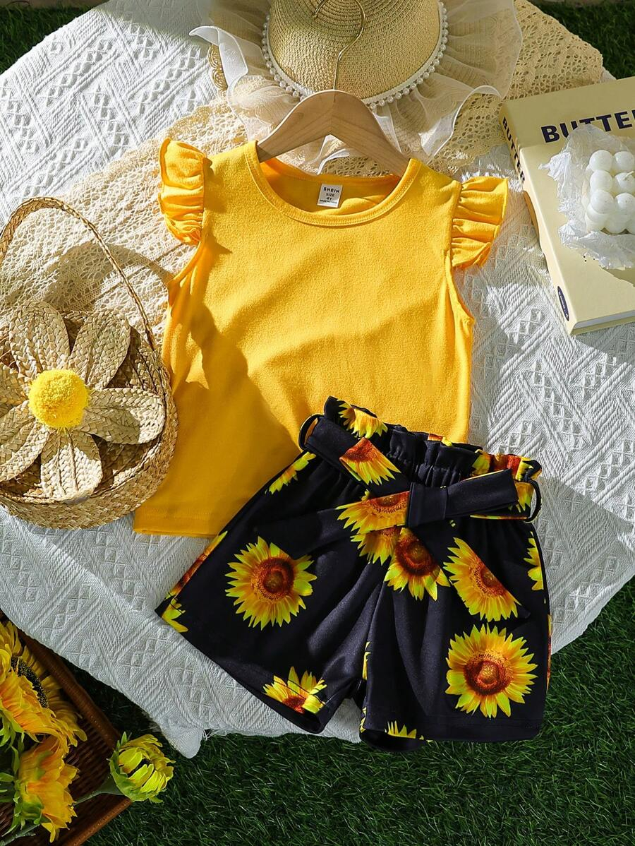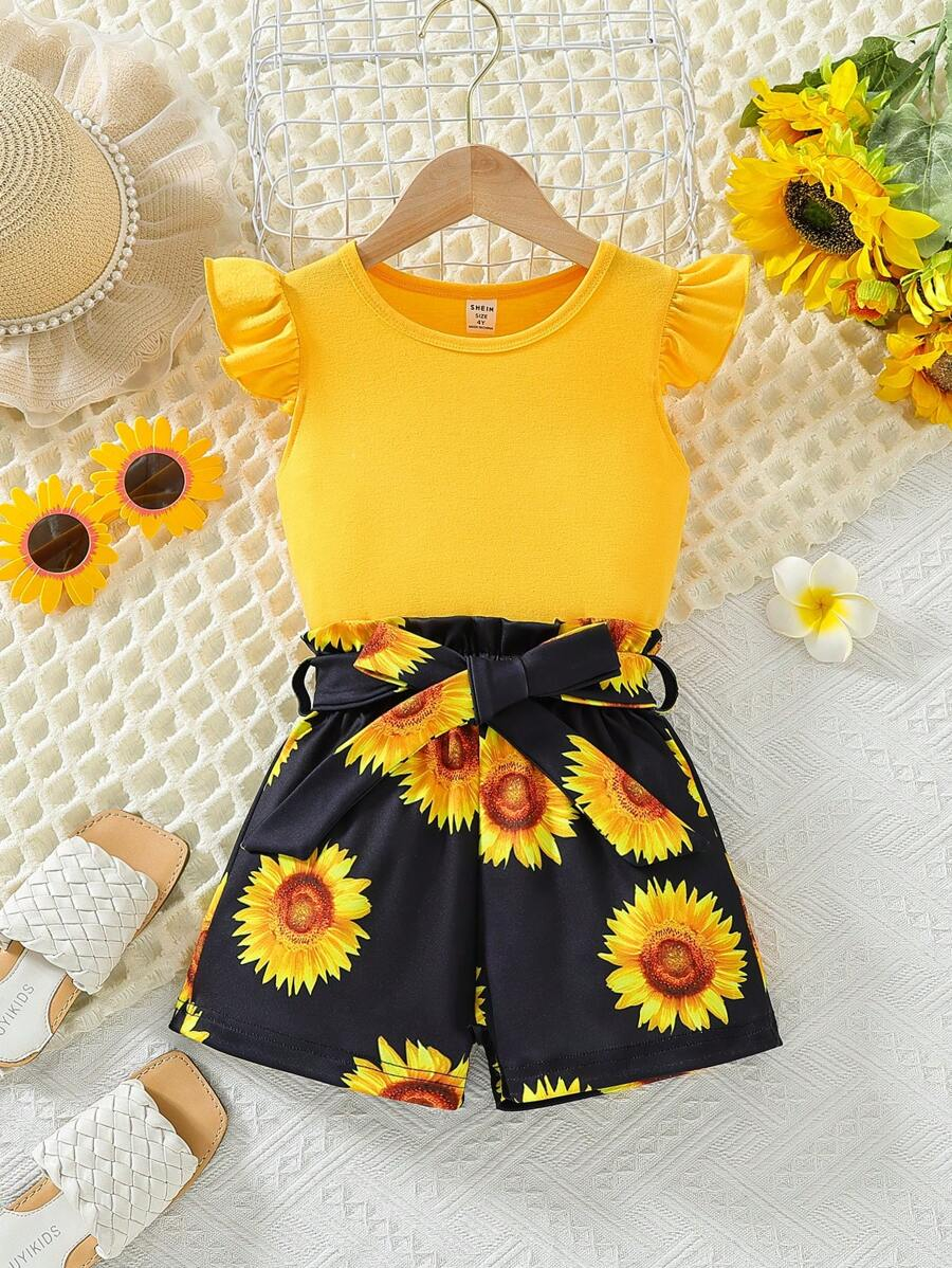 SHEIN Young Girl Summer Vacation Solid Color Cap Sleeve Top And Tropical Print Shorts Outfit YG00096