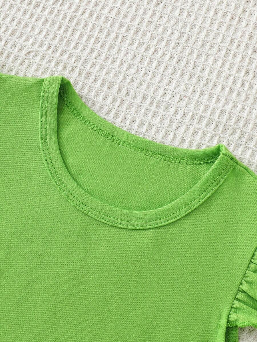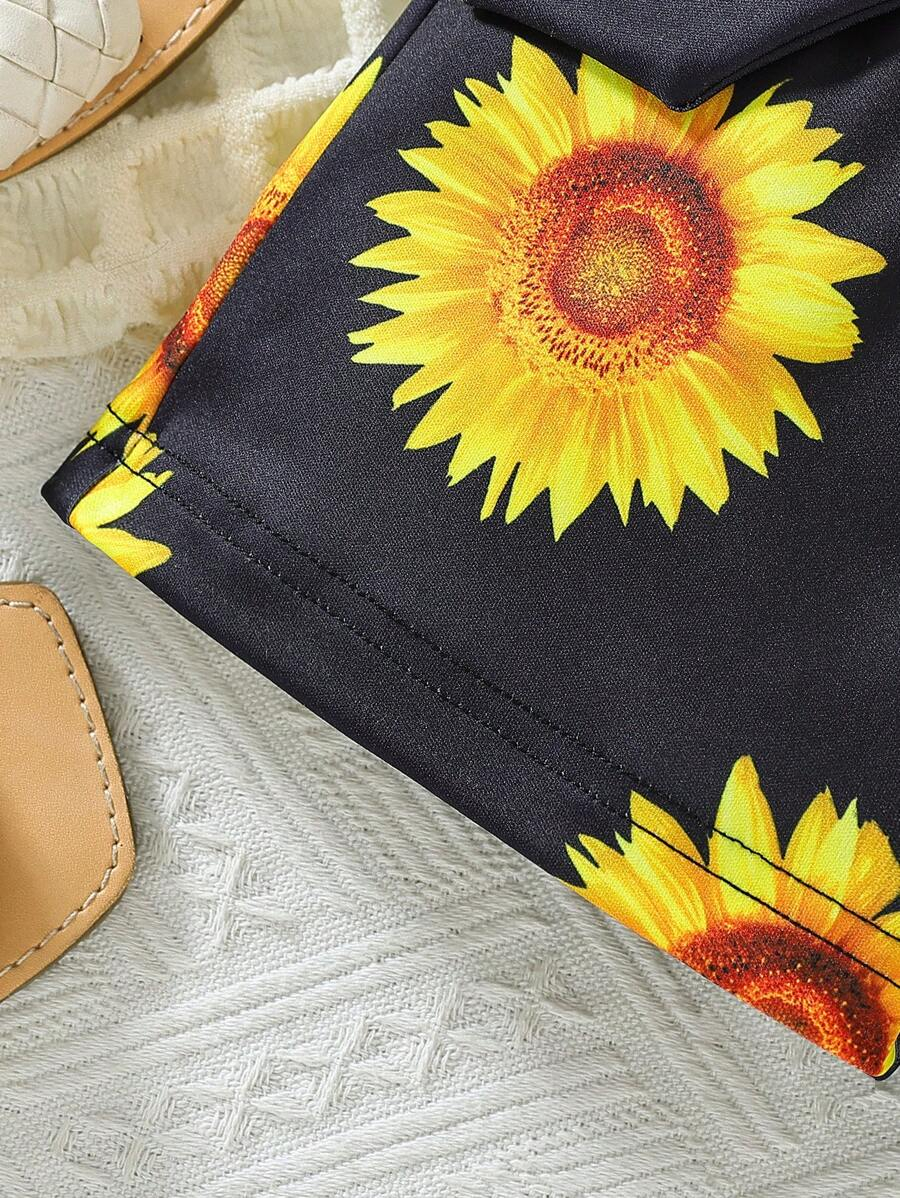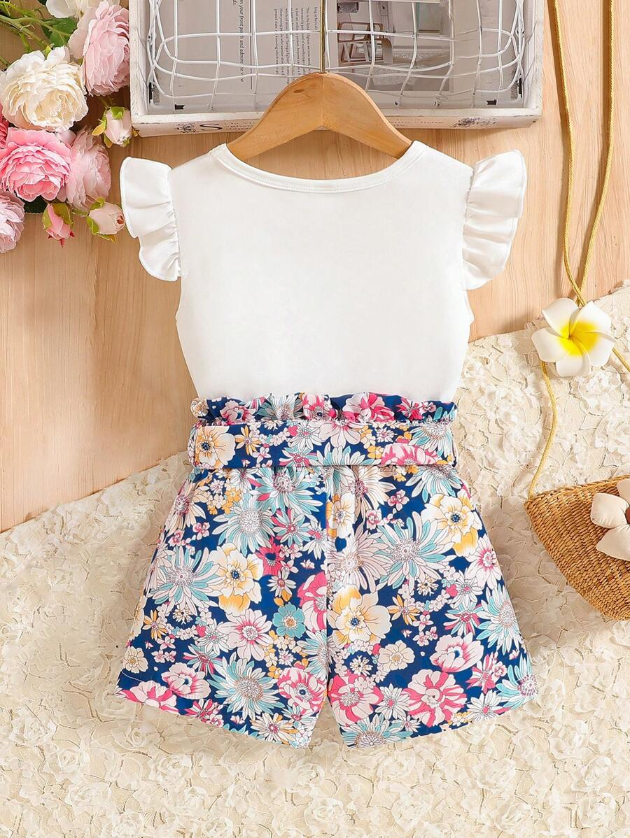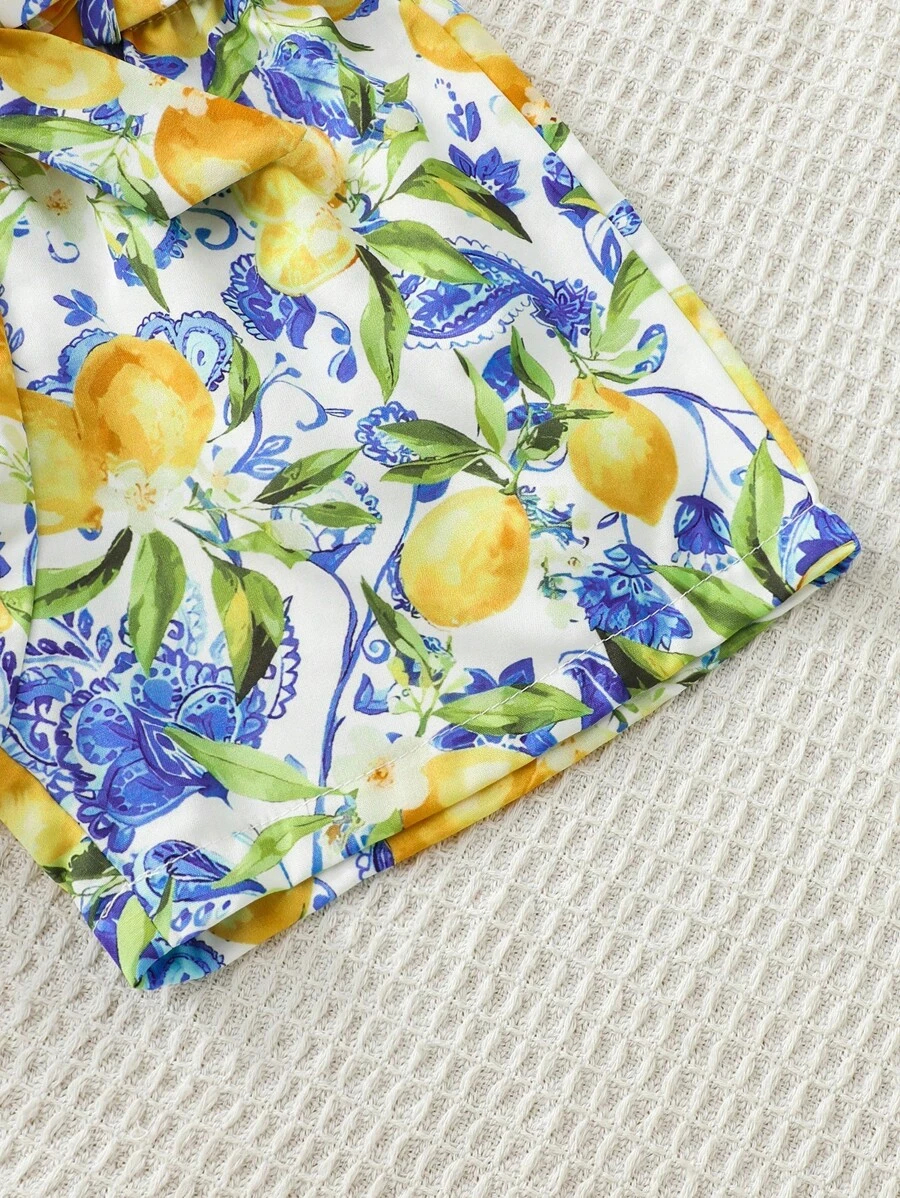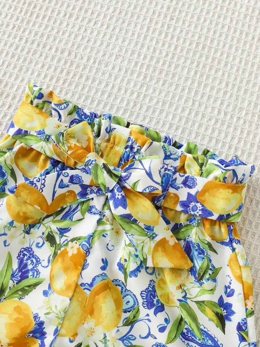 SHEIN Young Girl Summer Vacation Solid Color Cap Sleeve Top And Tropical Print Shorts Outfit YG00096