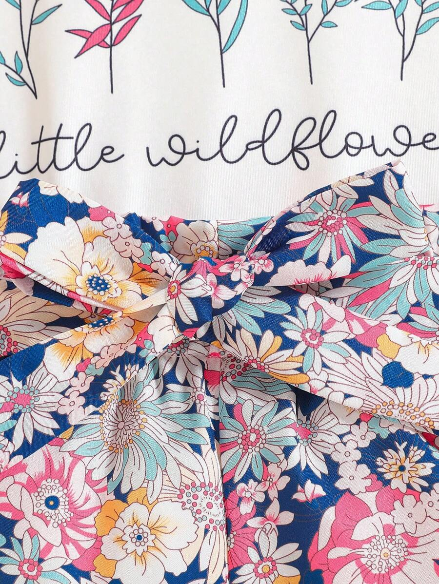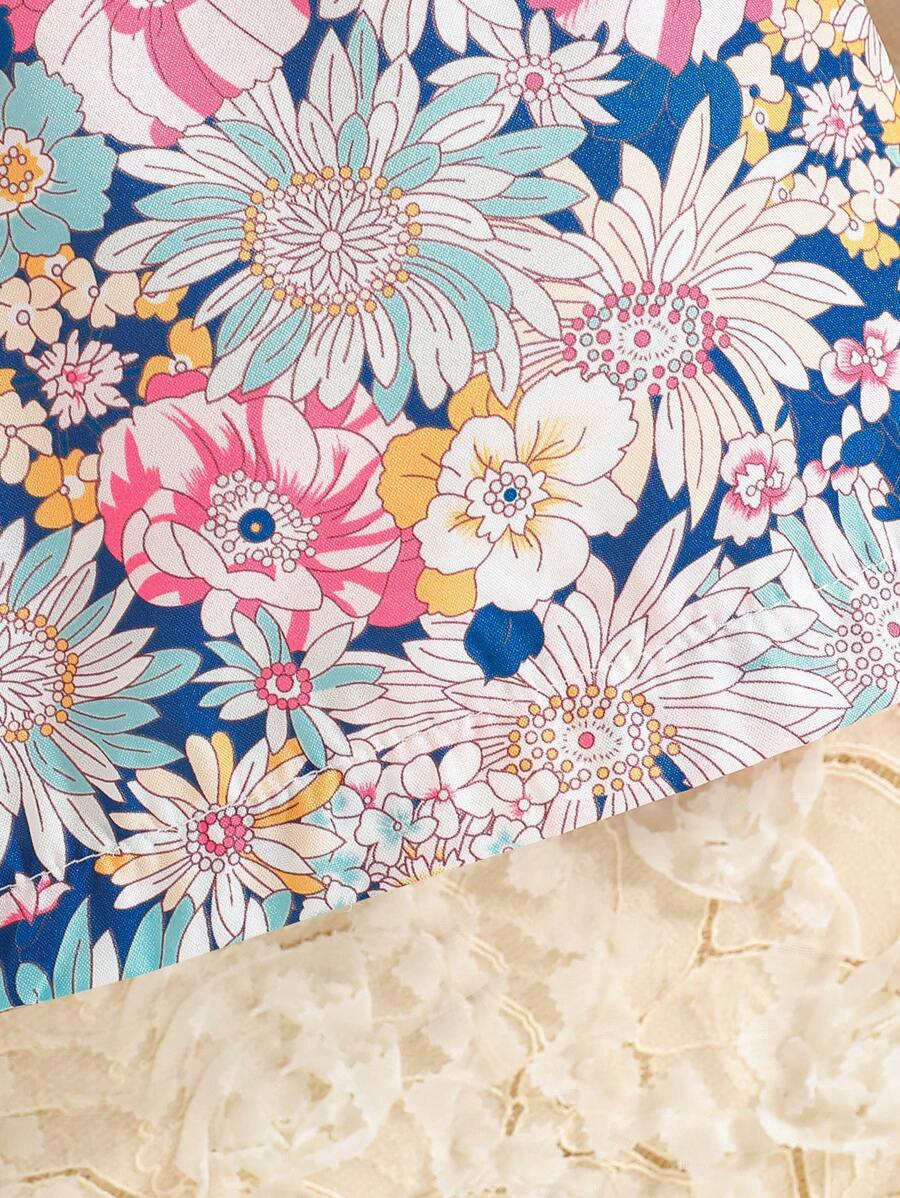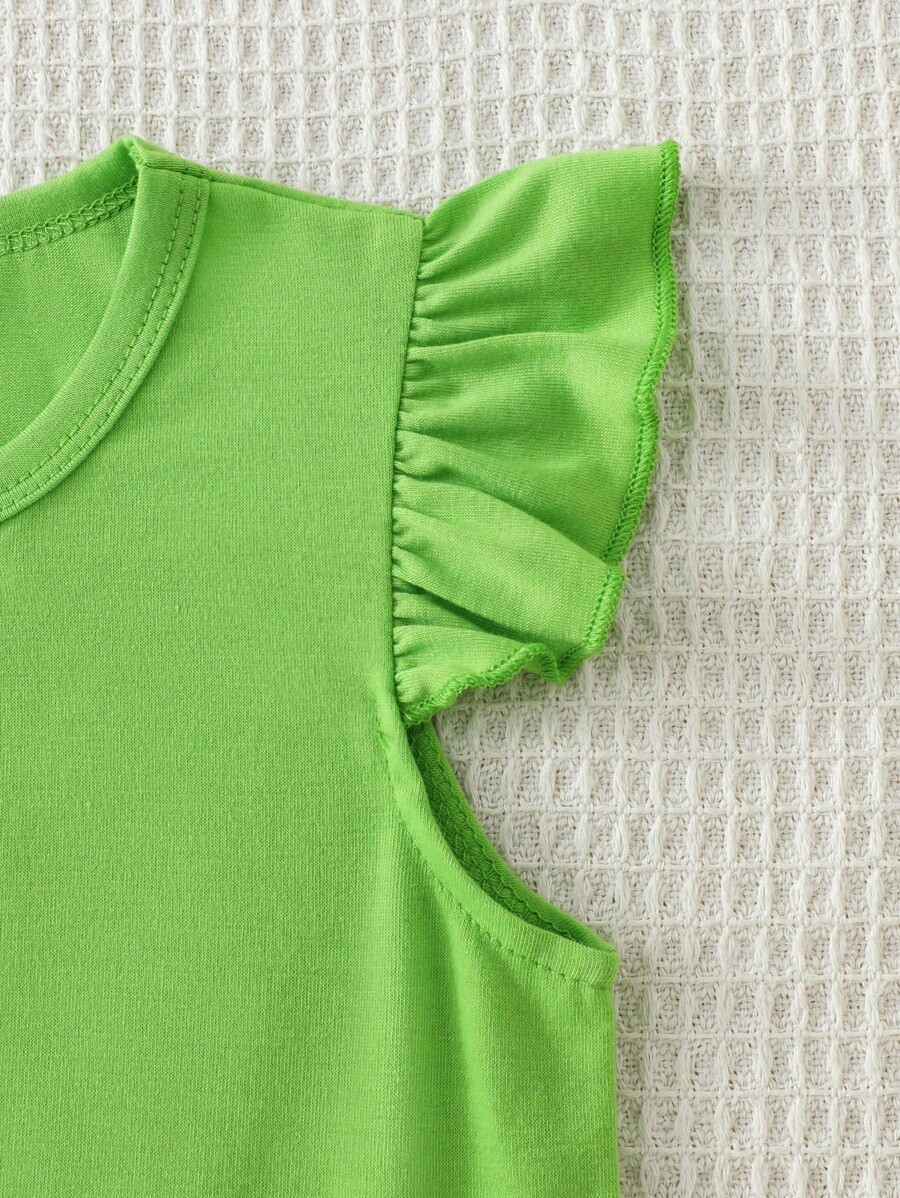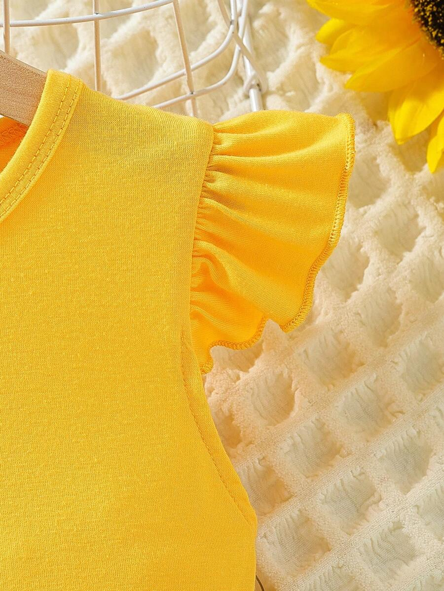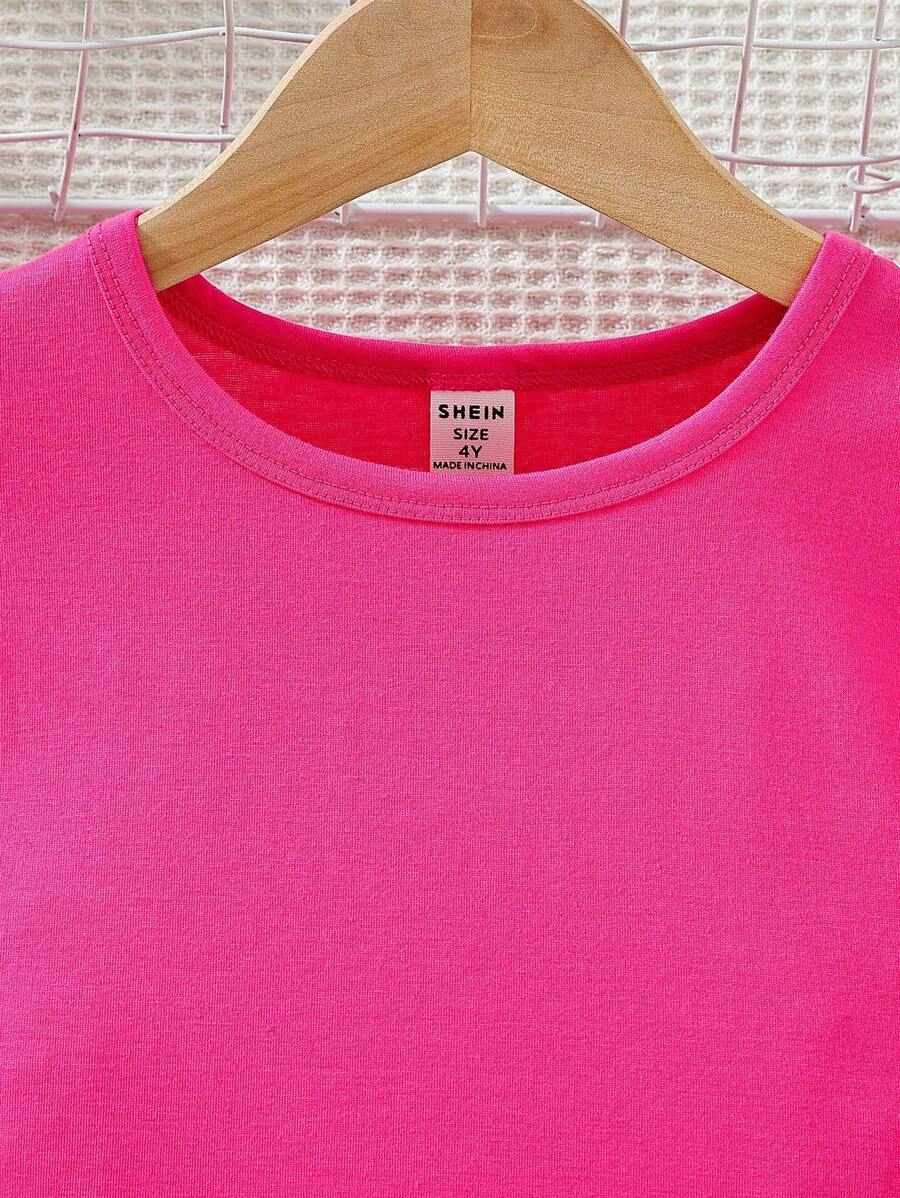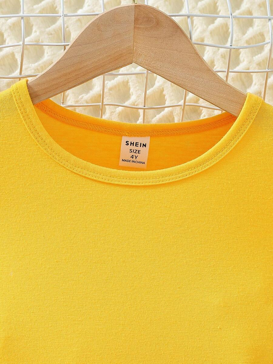 SHEIN Young Girl Summer Vacation Solid Color Cap Sleeve Top And Tropical Print Shorts Outfit YG00096