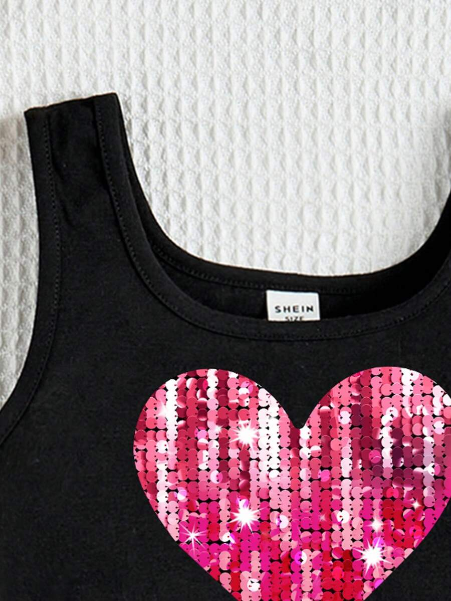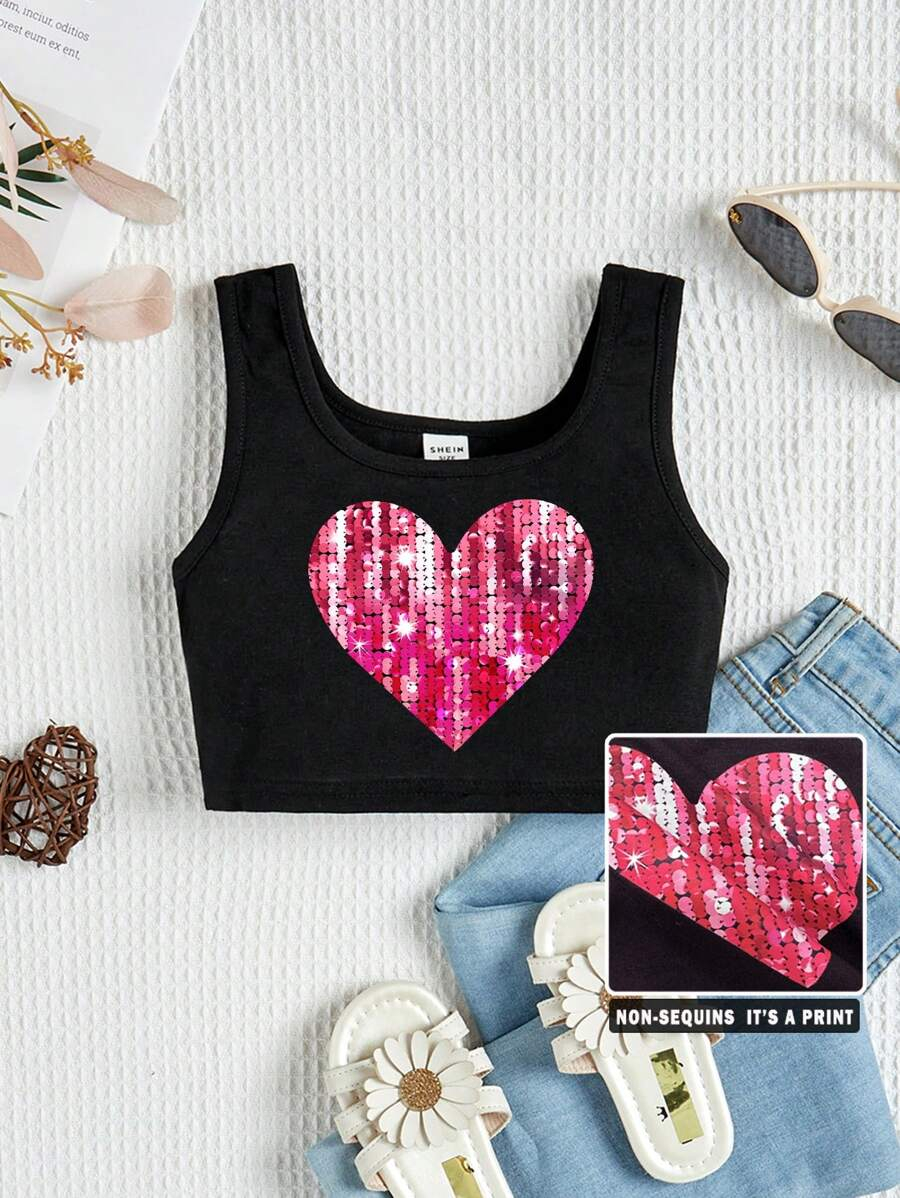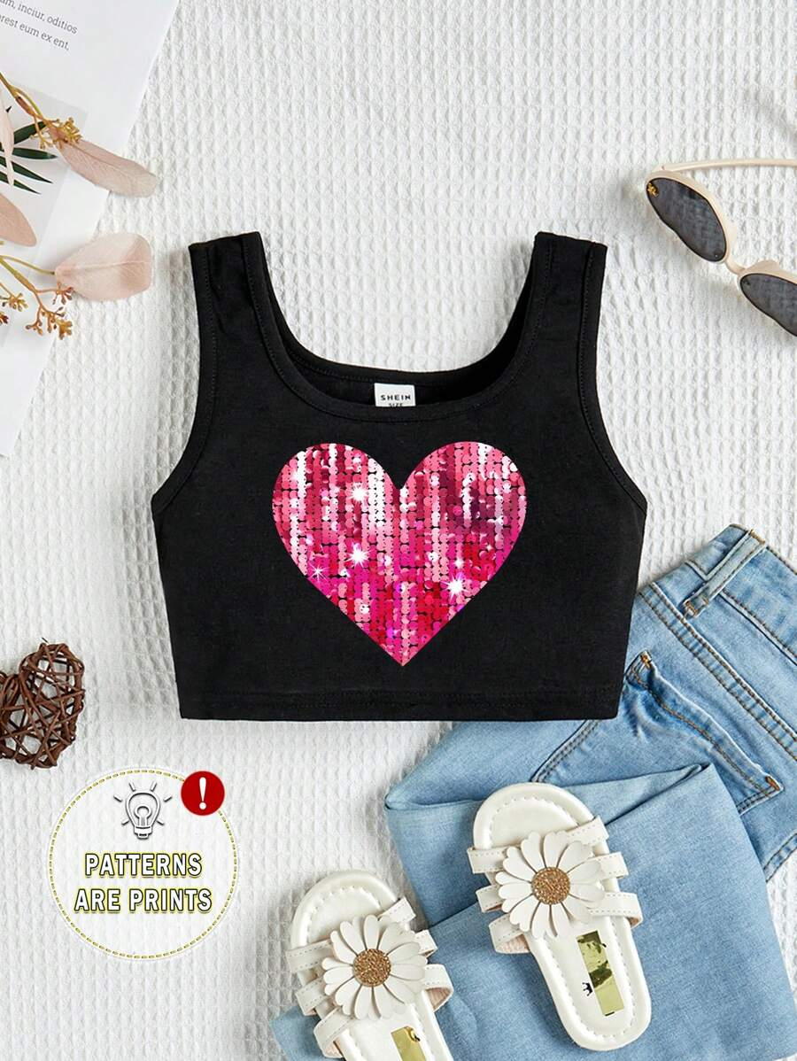 SHEIN Young Girl’s Casual Simple Heart Pattern Sleeveless Tank Top With Round Neckline, Suitable For Summer Teen Girls Crop Topteen Girl Crop Topsblack Crop Top Young Girl YG00029