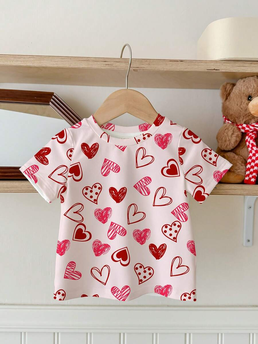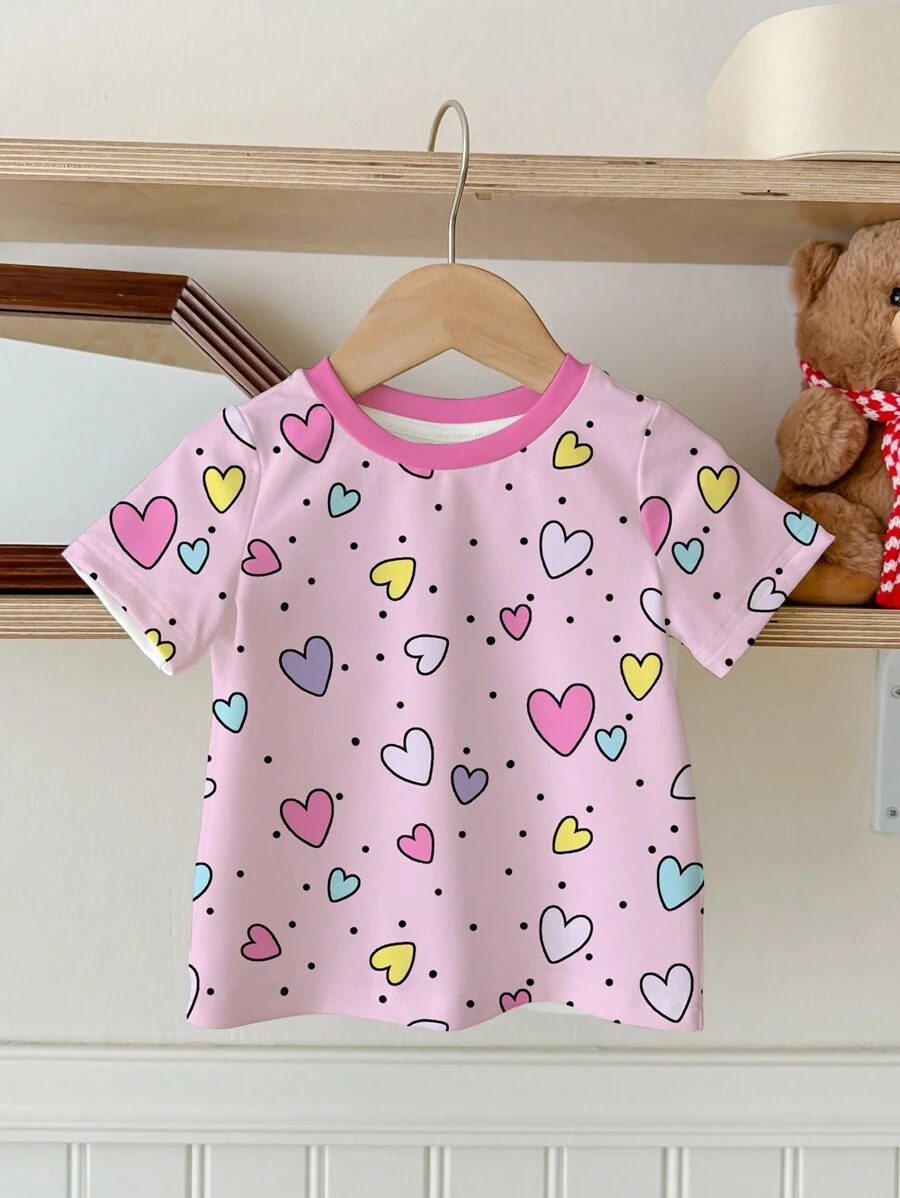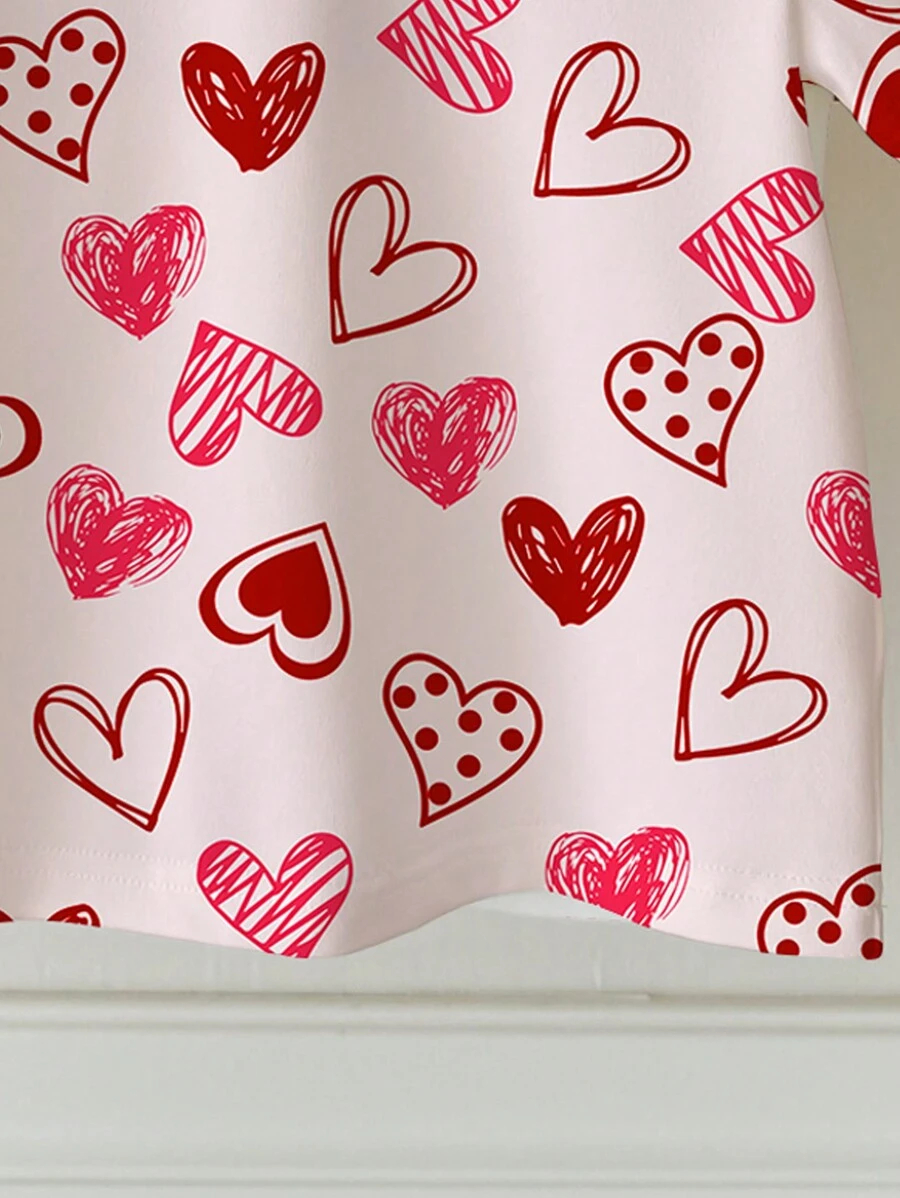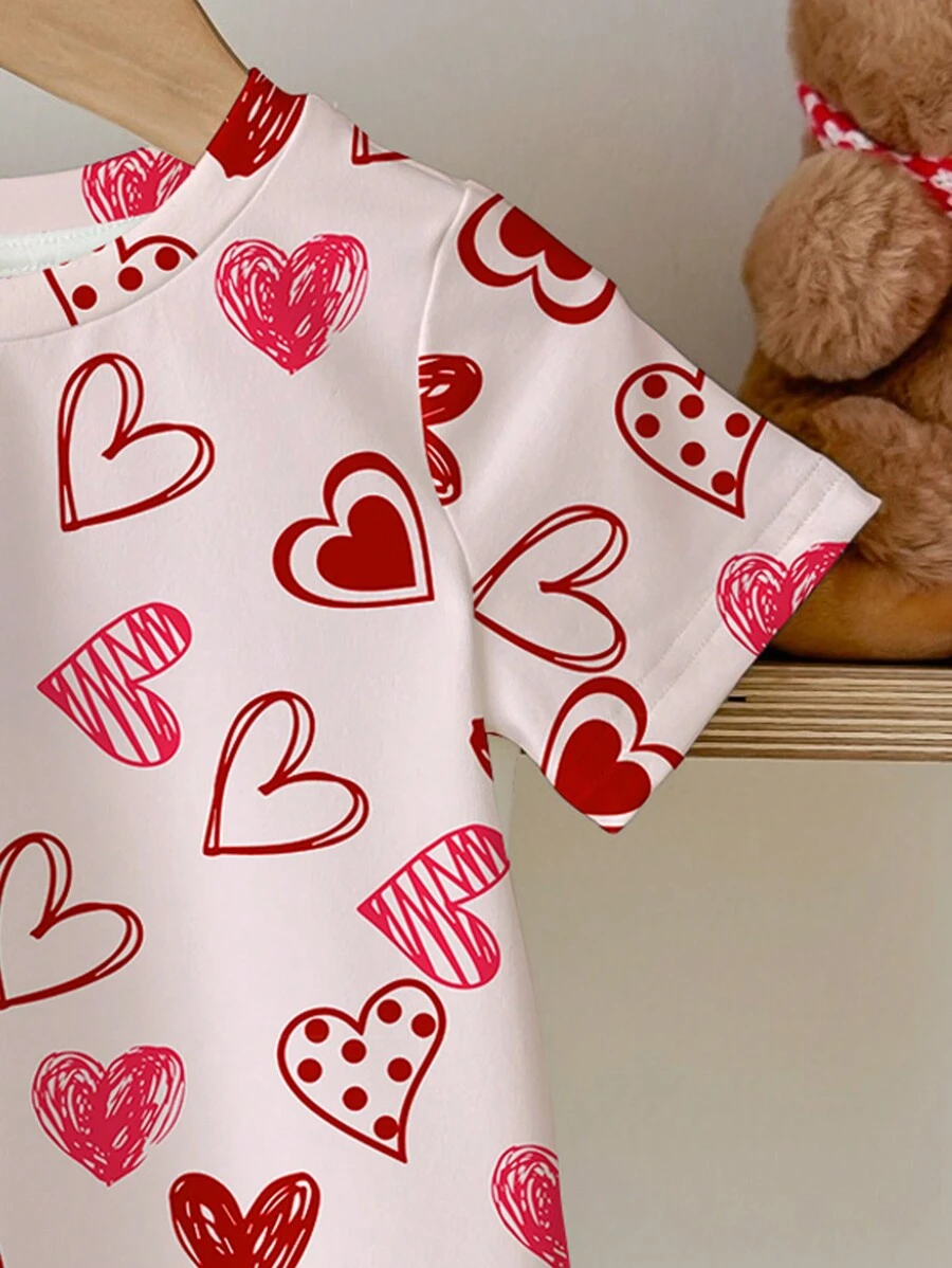SHEIN Young Girls Cute Hand Painted Heart Print Casual Round Neck Short Sleeve T-Shirt Suitable For Young Girls In Summer For Valentine’s Day YG00017