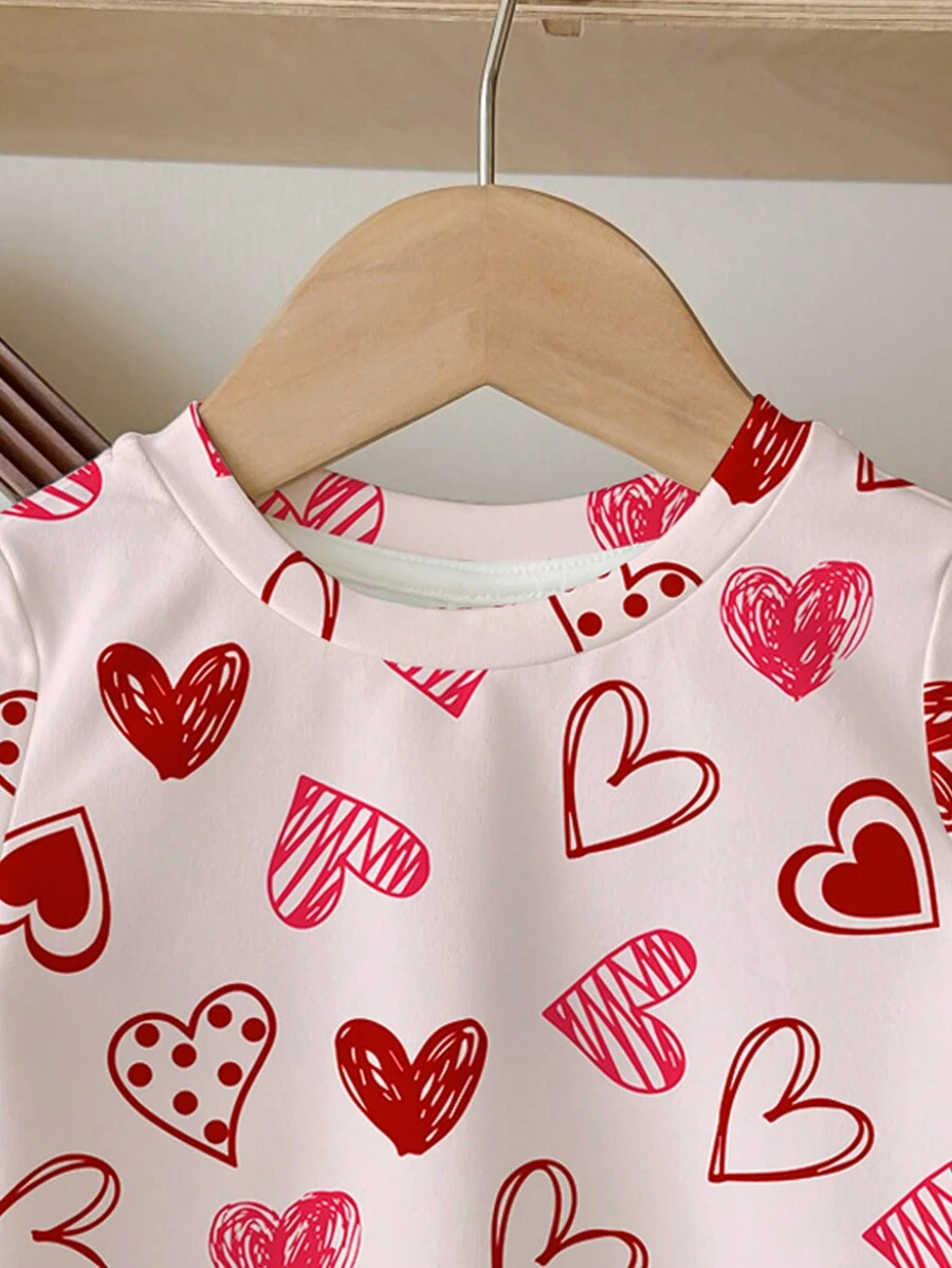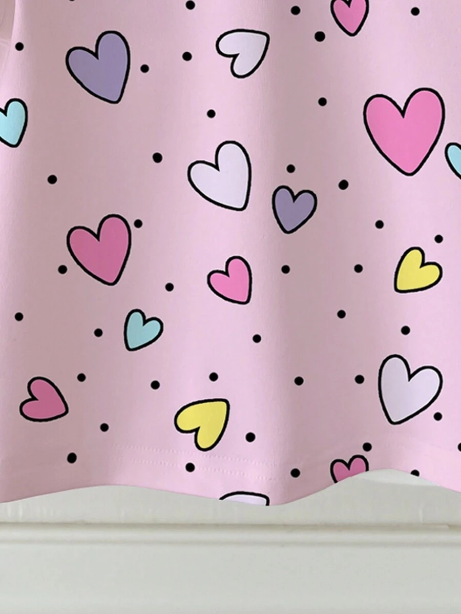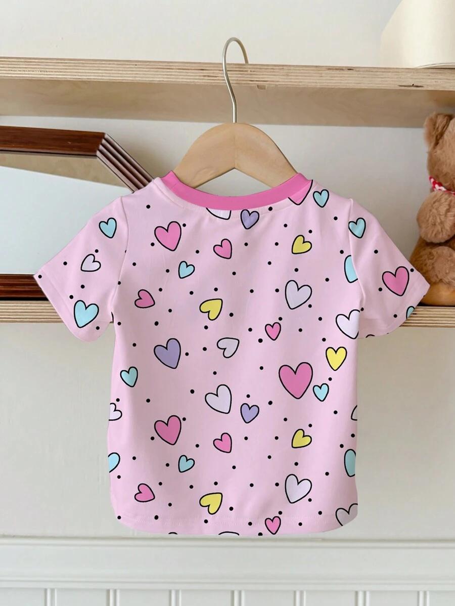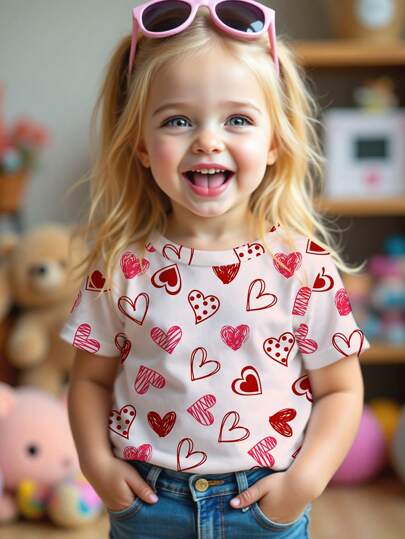 SHEIN Young Girls Cute Hand Painted Heart Print Casual Round Neck Short Sleeve T-Shirt Suitable For Young Girls In Summer For Valentine’s Day YG00017