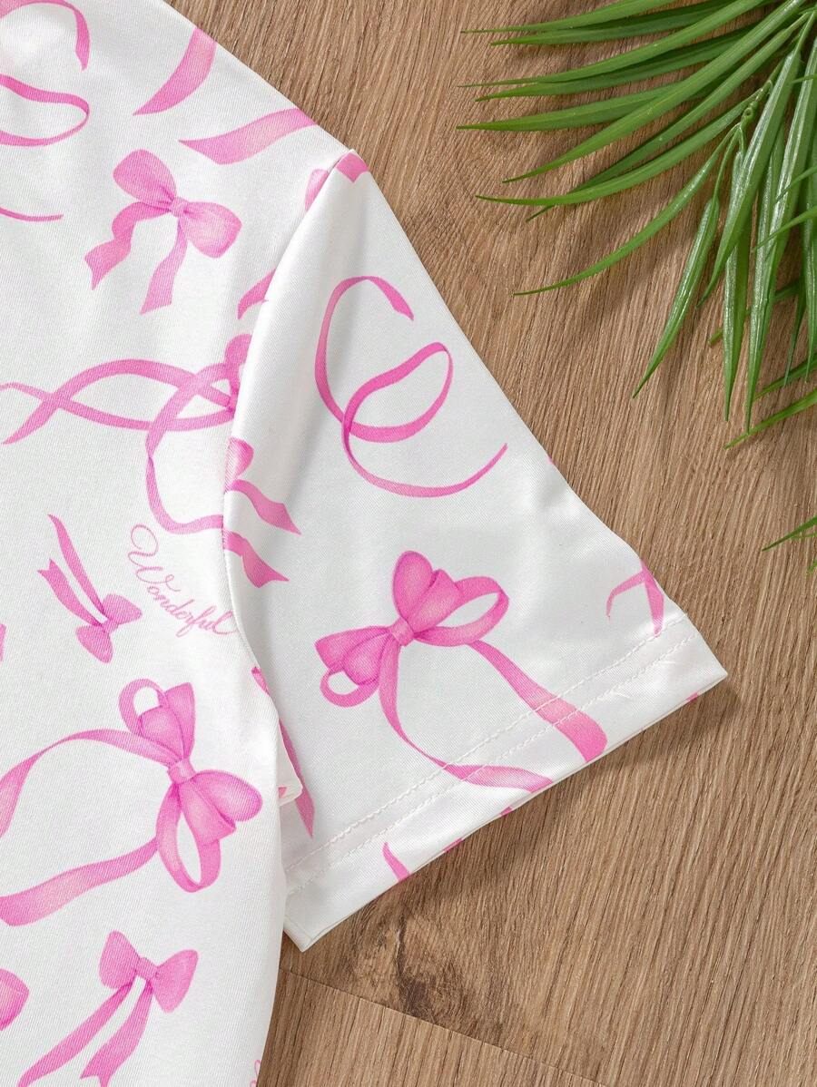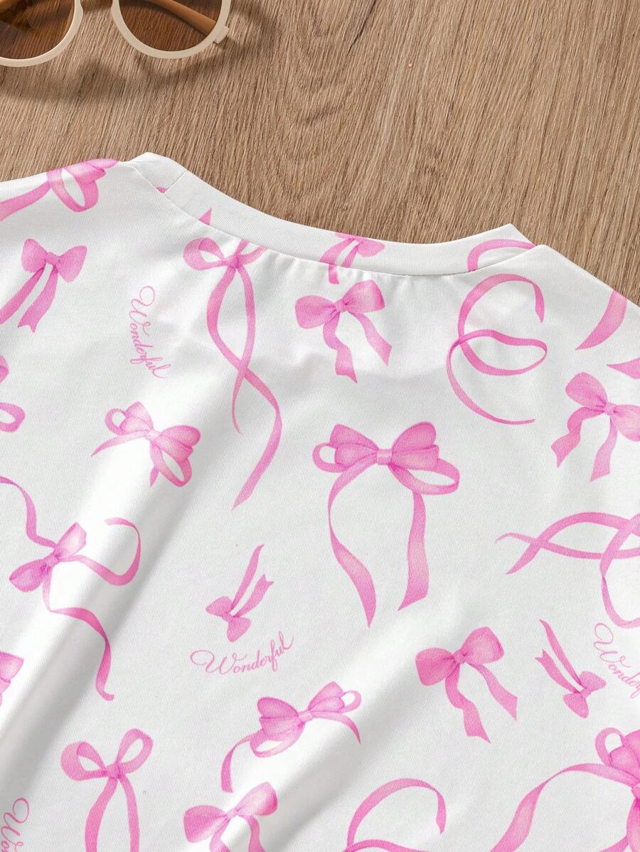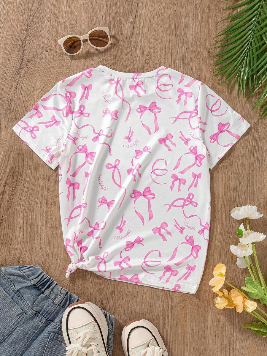 Tween Girl Bow Print Round Neck Short Sleeve T-Shirt, Summer TG-8-12-00046
