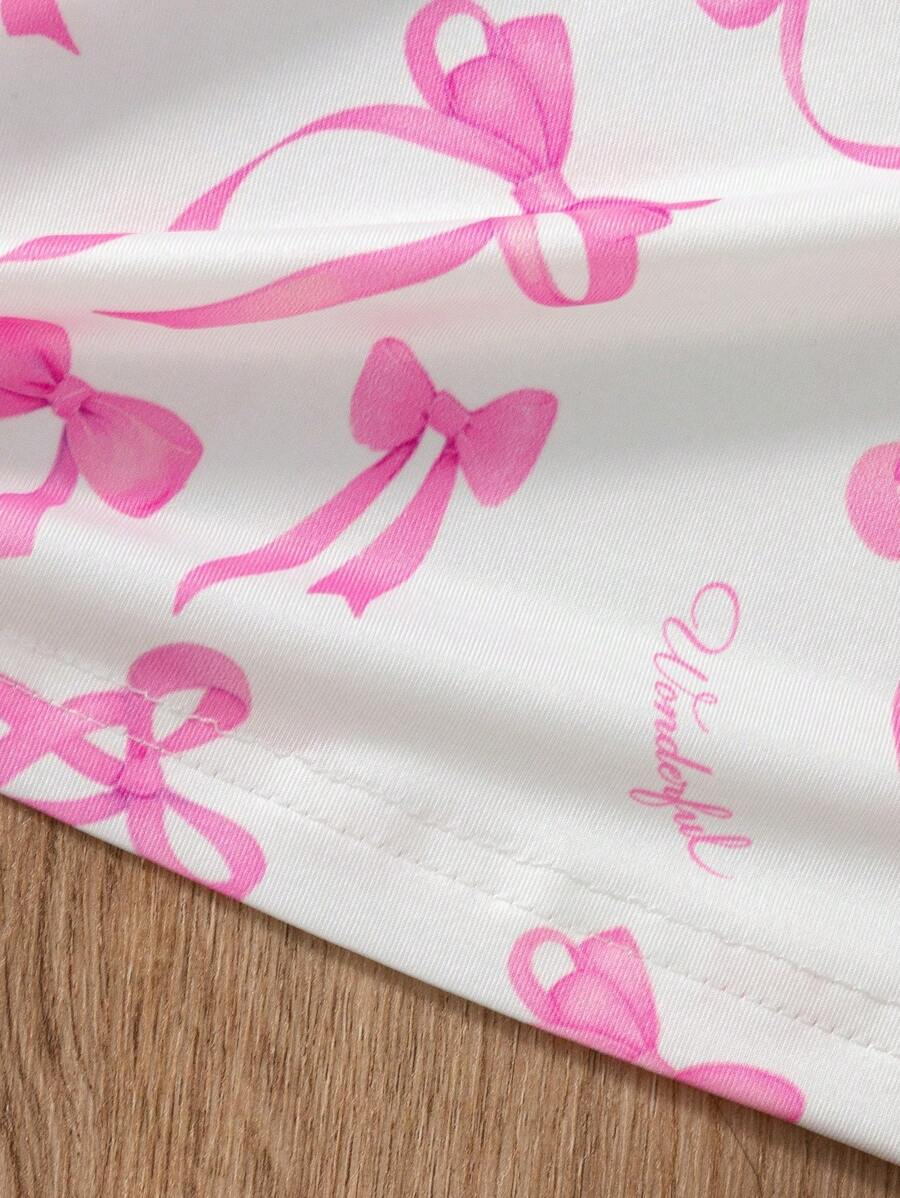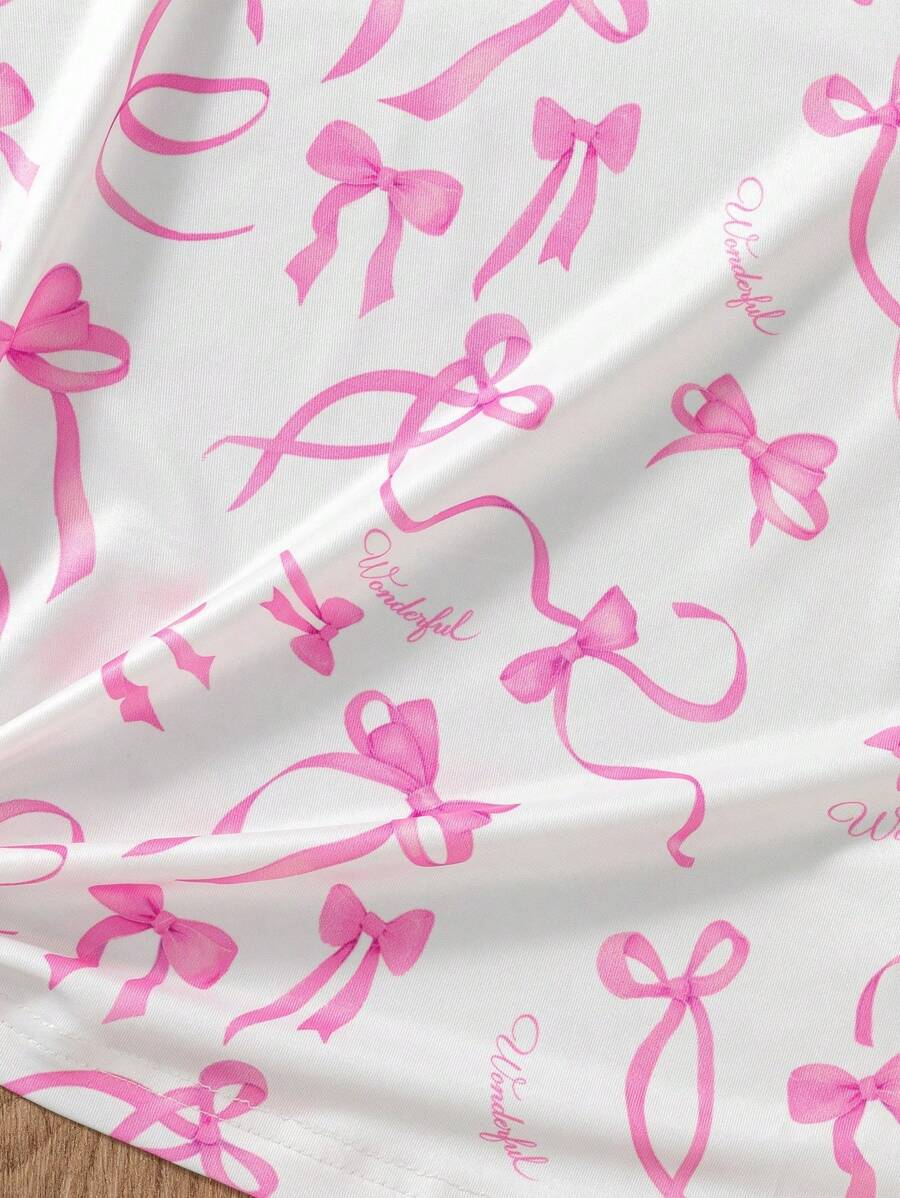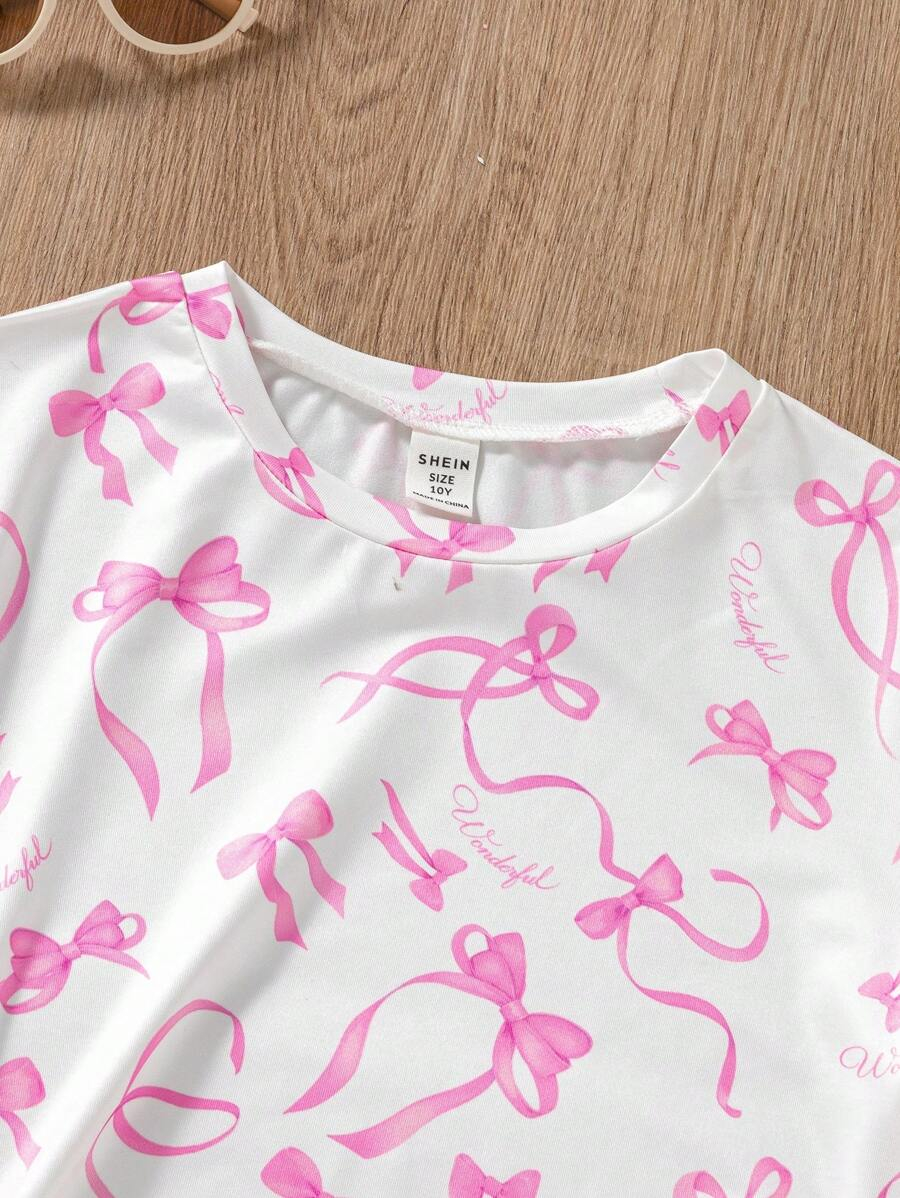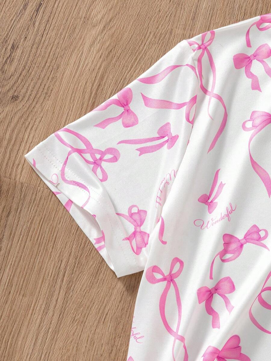 Tween Girl Bow Print Round Neck Short Sleeve T-Shirt, Summer TG-8-12-00046